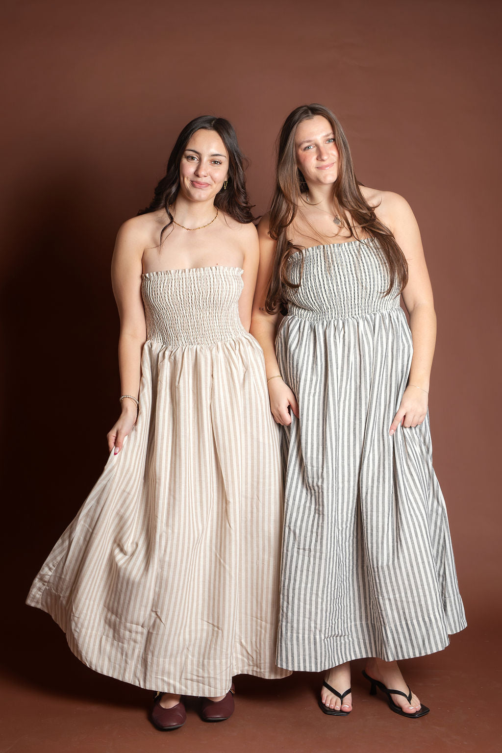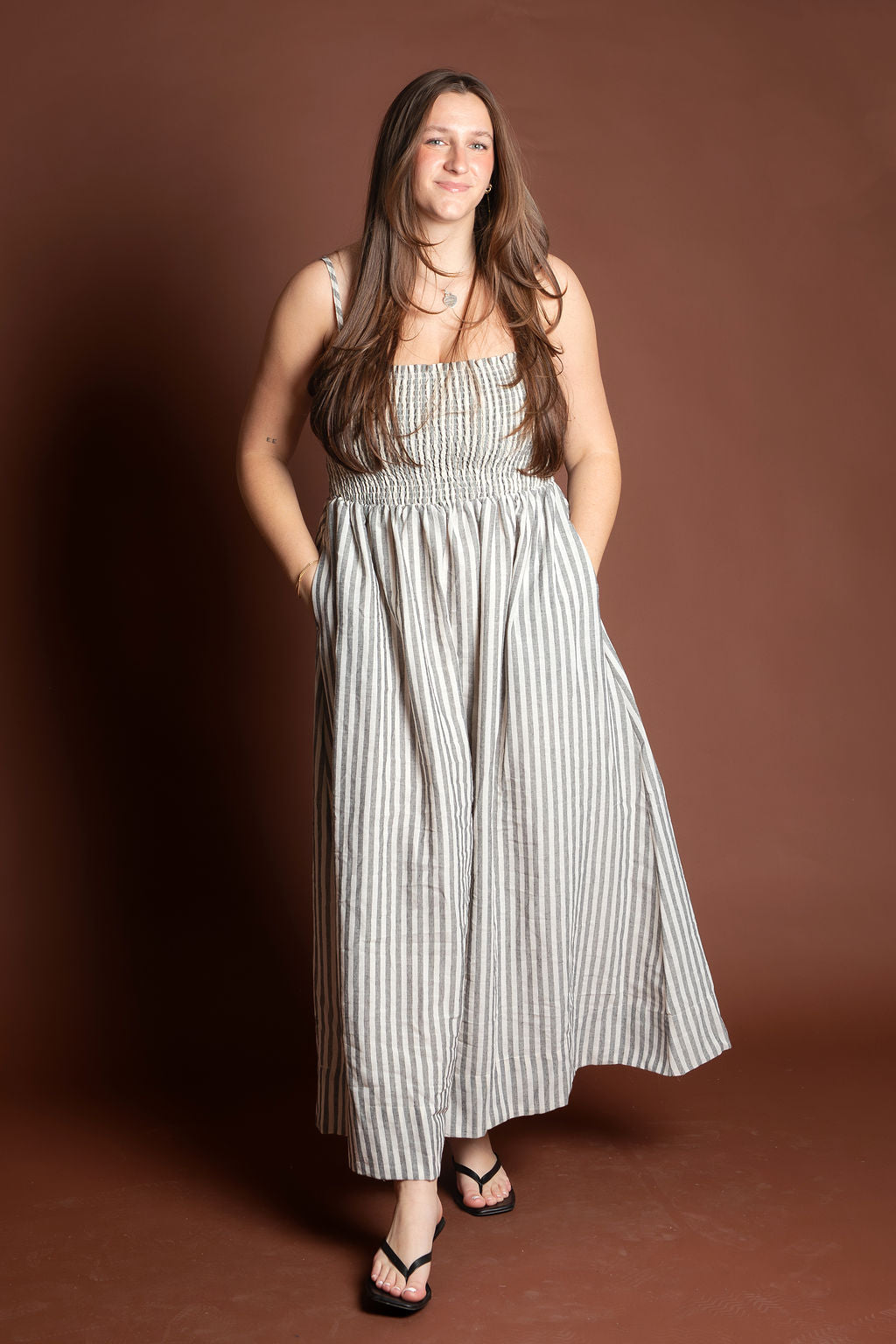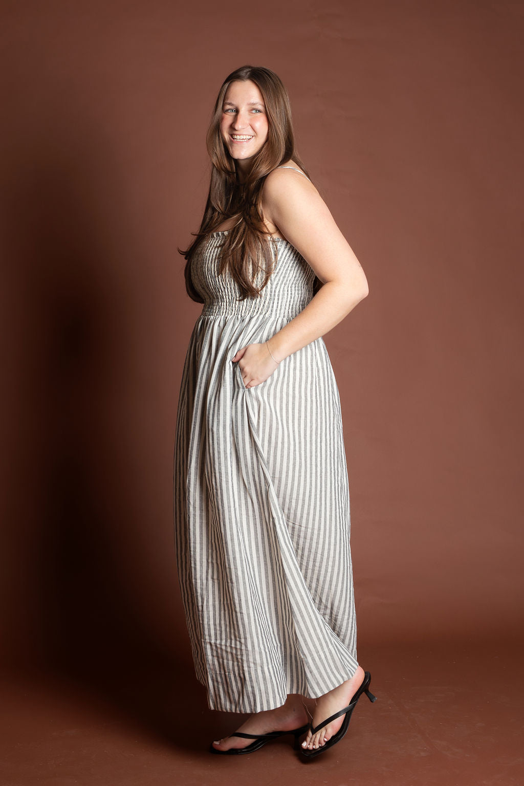 This elegant piece features a flattering smocking detail at the top paired with delicate stripes throughout, creating a sophisticated and feminine look. Made from breathable 100% cotton, this maxi dress is perfect for spring and summer occasions.