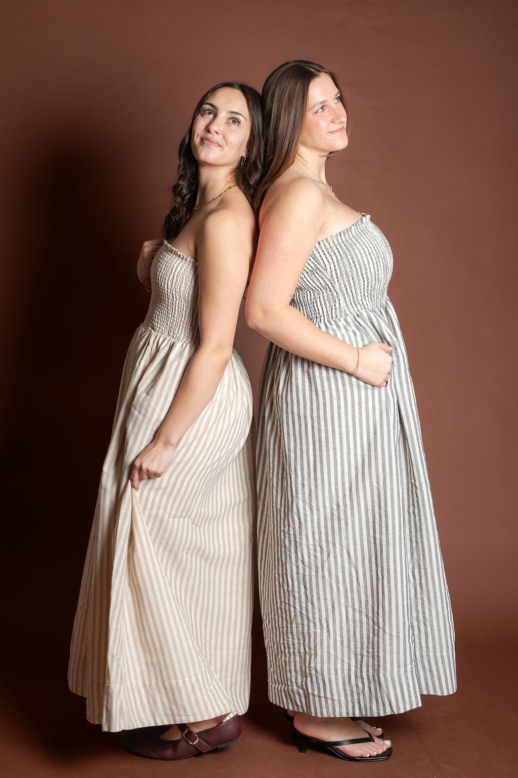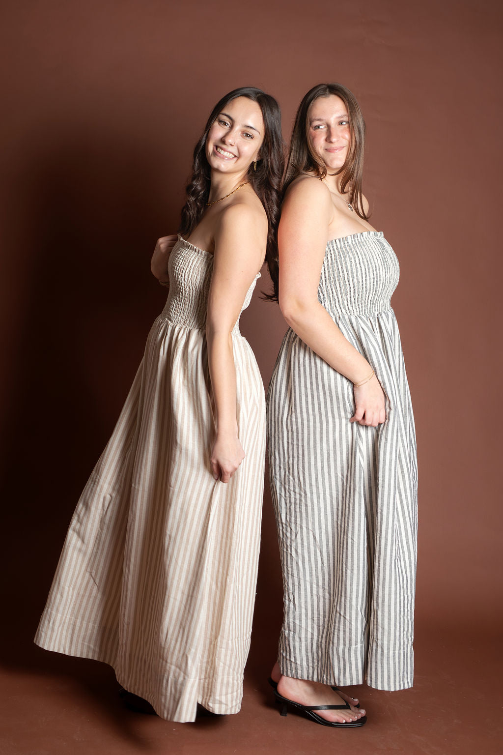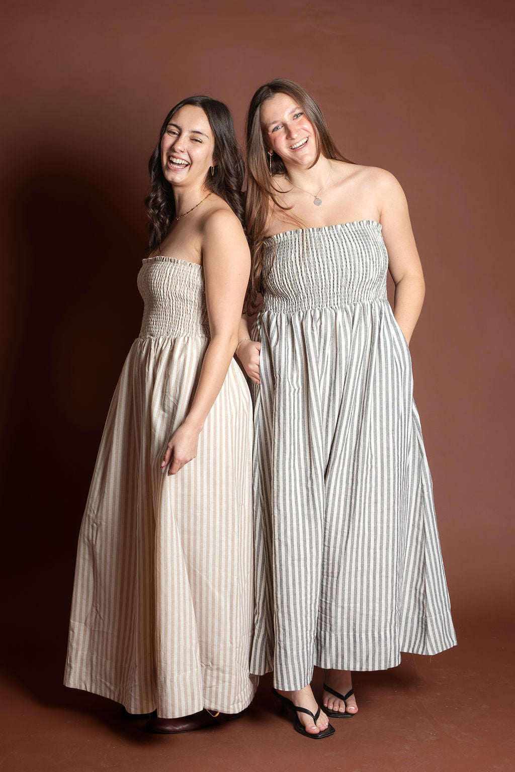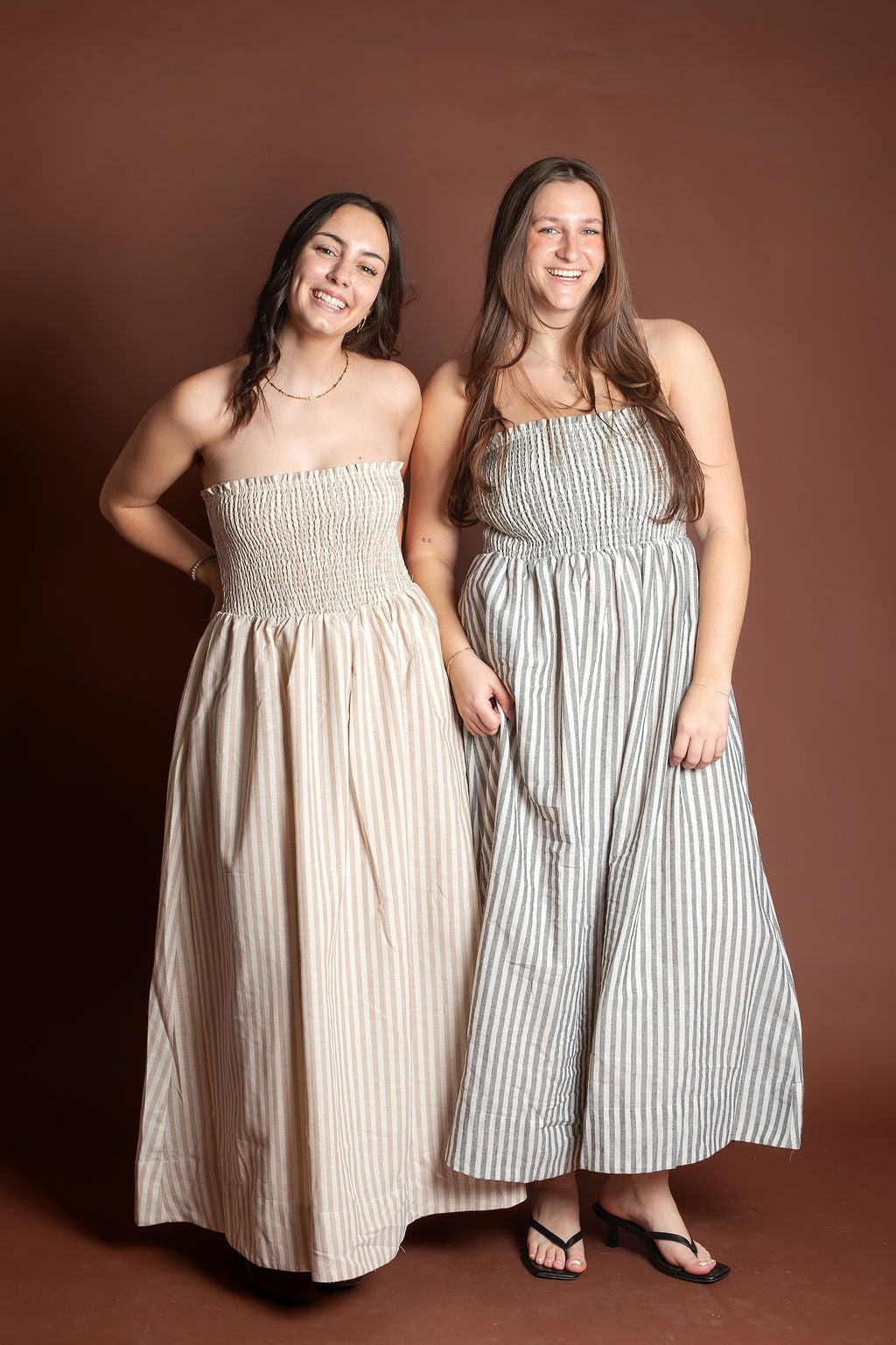 This elegant piece features a flattering smocking detail at the top paired with delicate stripes throughout, creating a sophisticated and feminine look. Made from breathable 100% cotton, this maxi dress is perfect for spring and summer occasions.