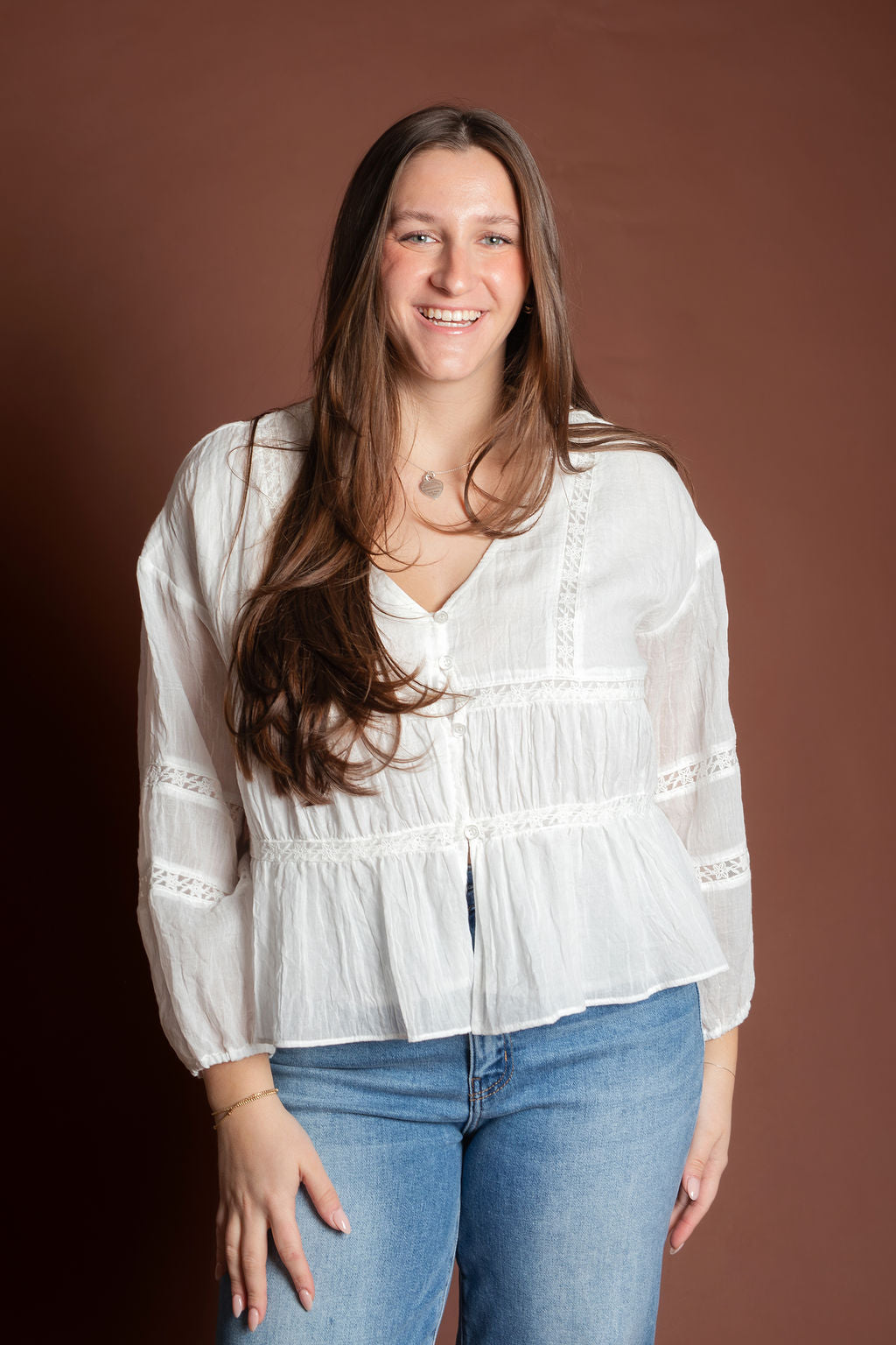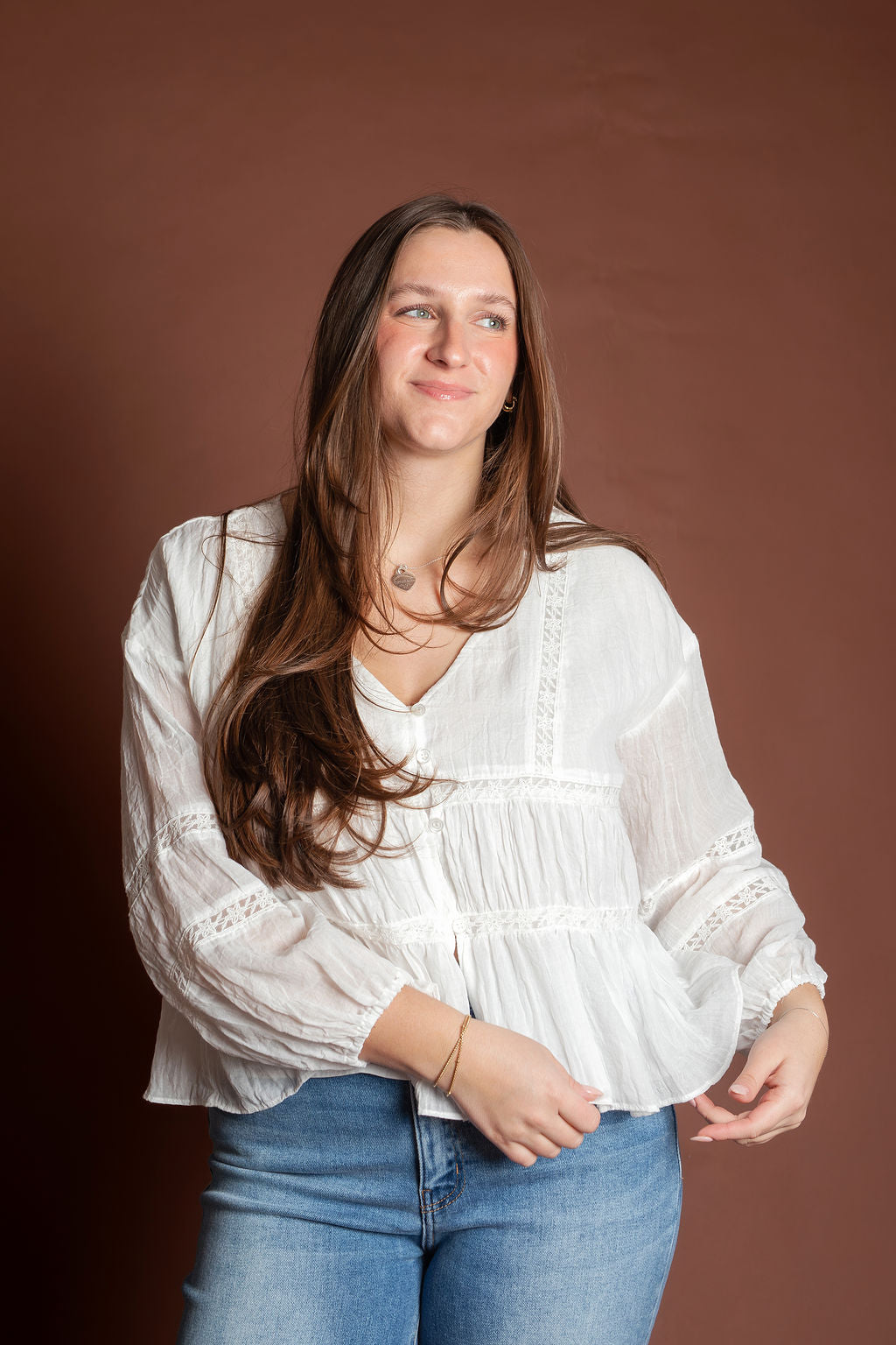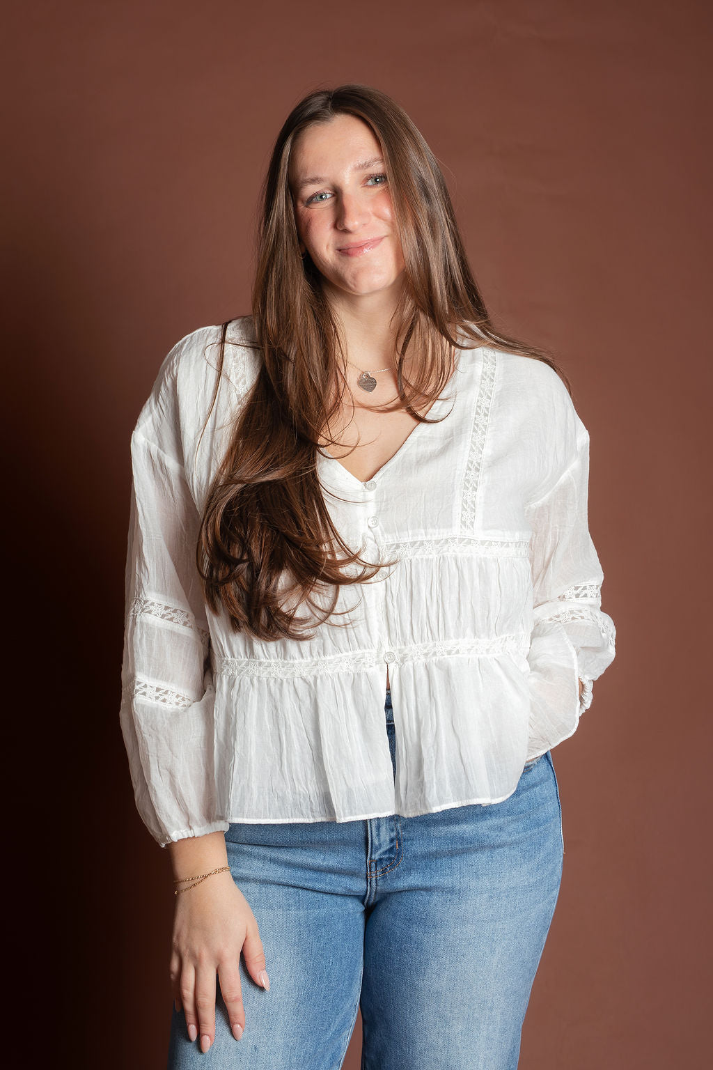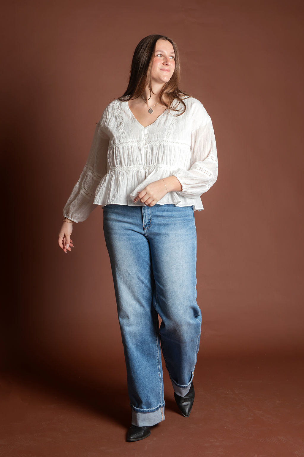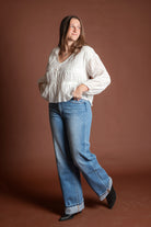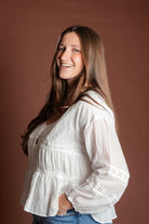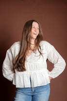 Elevate your everyday wardrobe with this charming white V-neck blouse. The delicate ruffle detailing at the neckline adds a touch of feminine flair, while the classic V-neckline flatters any frame. Perfect for layering or wearing solo, this versatile piece transitions seamlessly from office to weekend. Soft and comfortable, it's an essential addition to any closet.