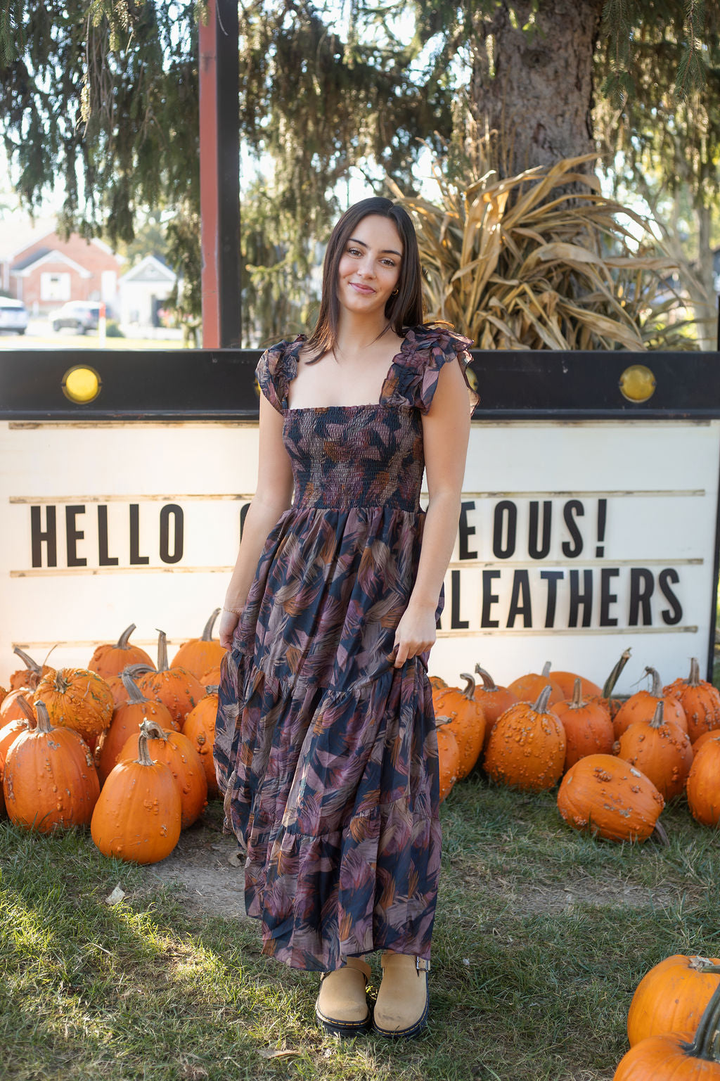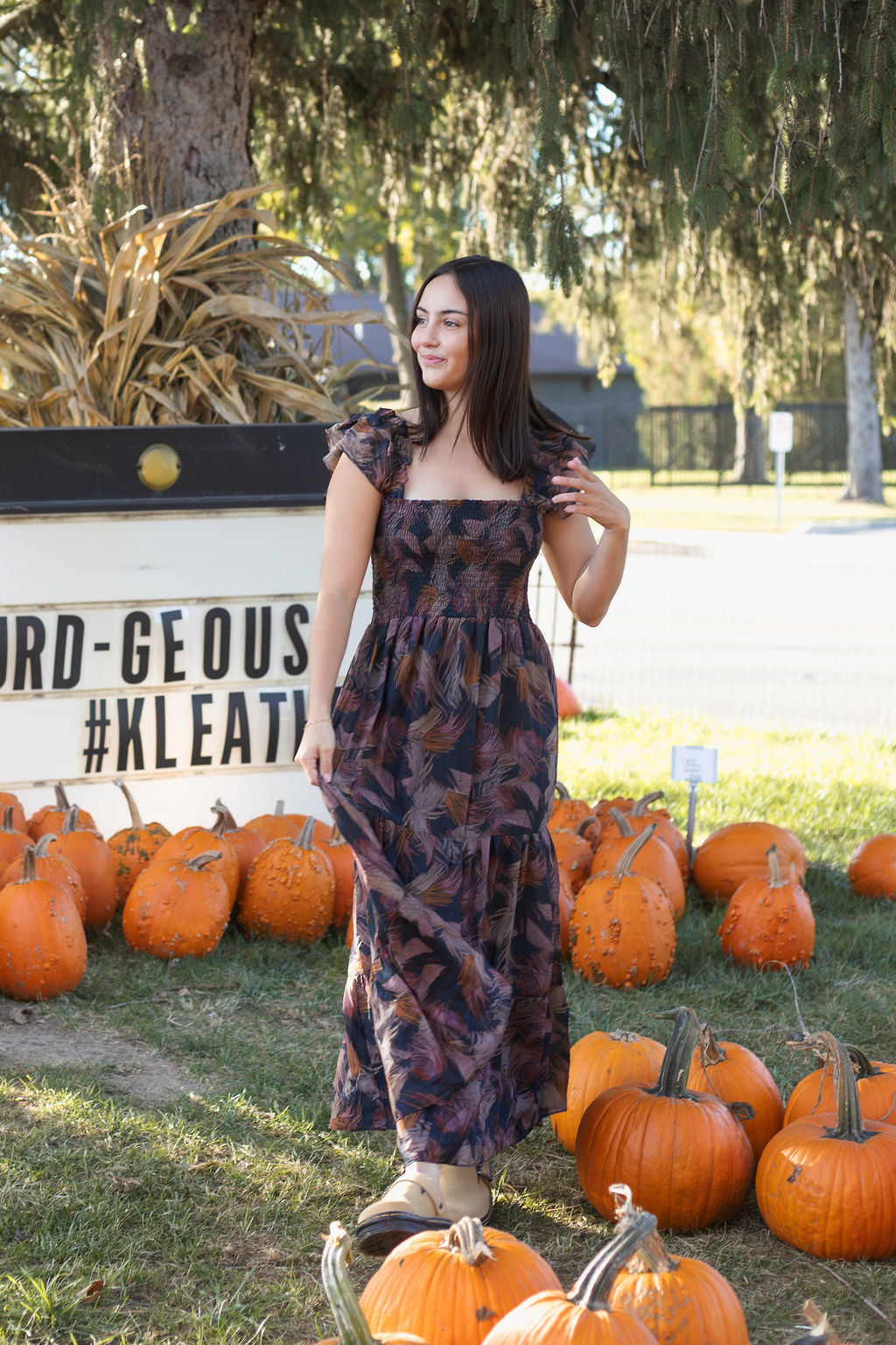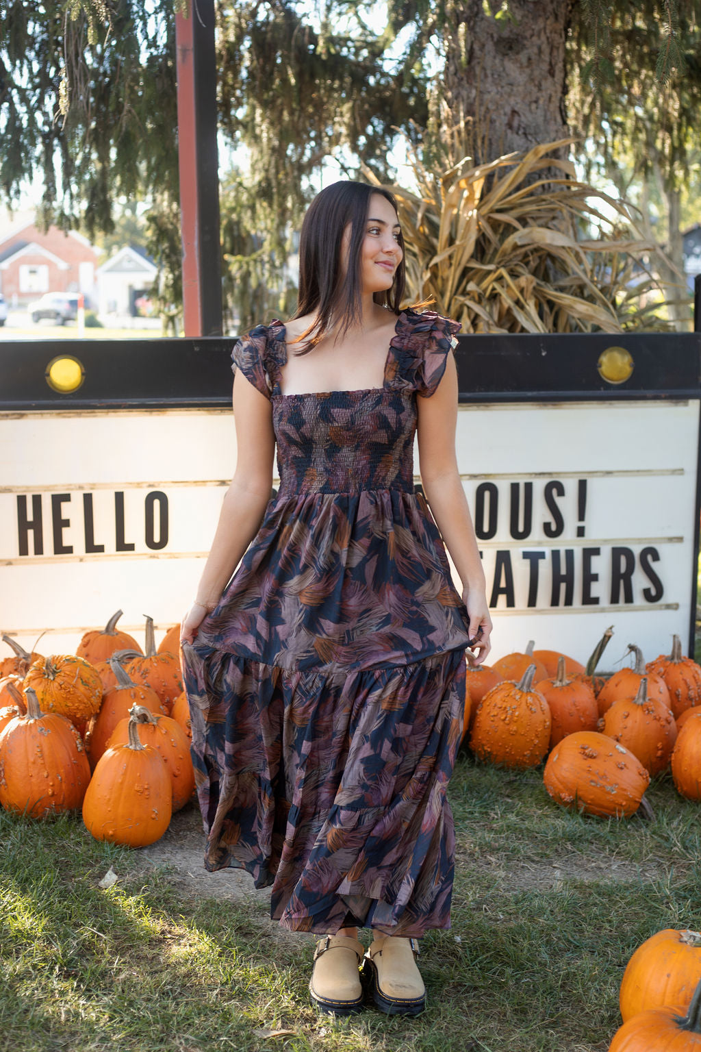 Tiered ruffle cap sleeves. Smocked bodice. Tiered ruffle skirt. Low back. High waist. Lined. Calf length. Fit-and-flare silhouette.