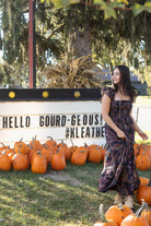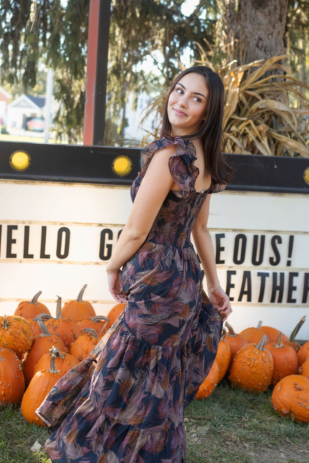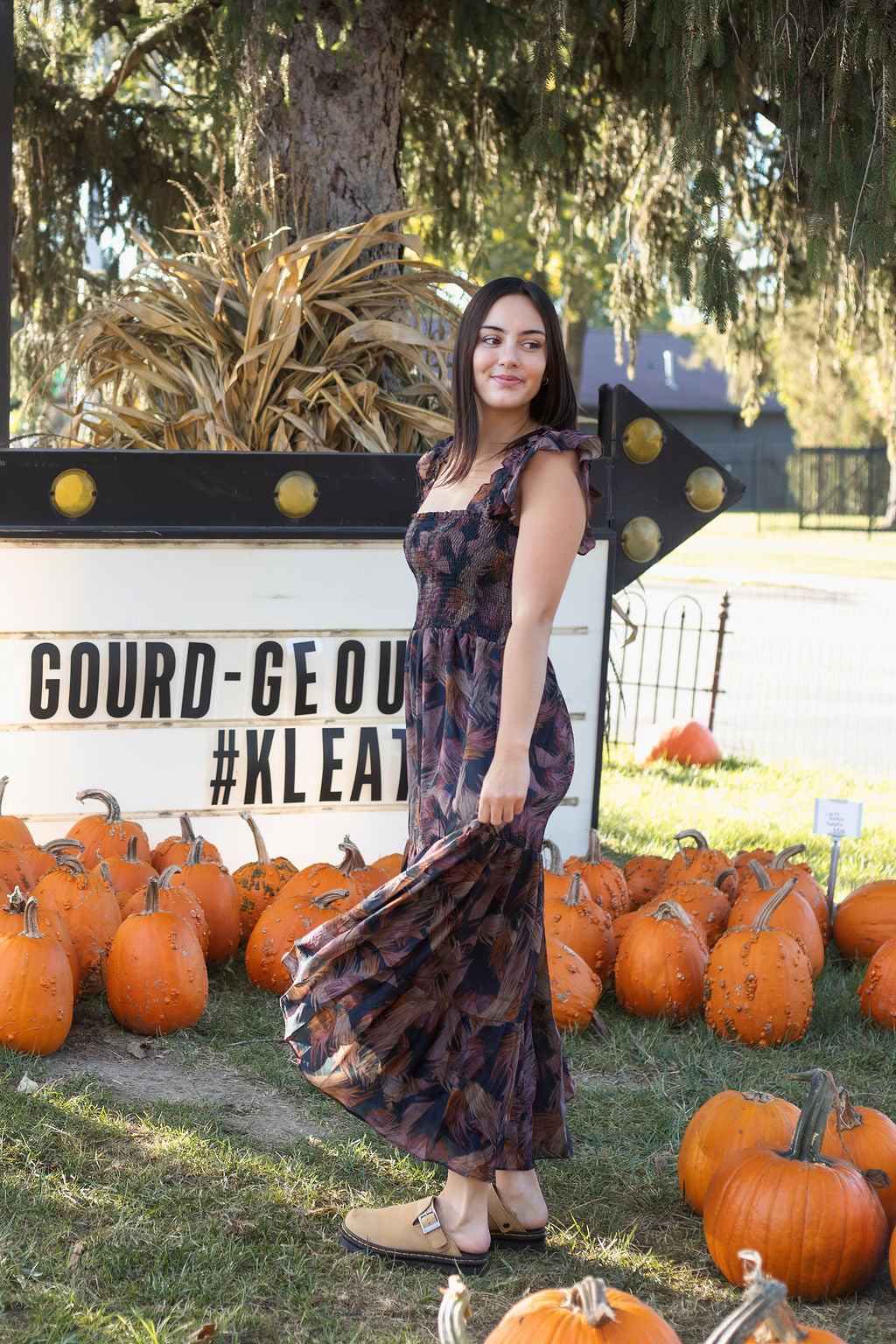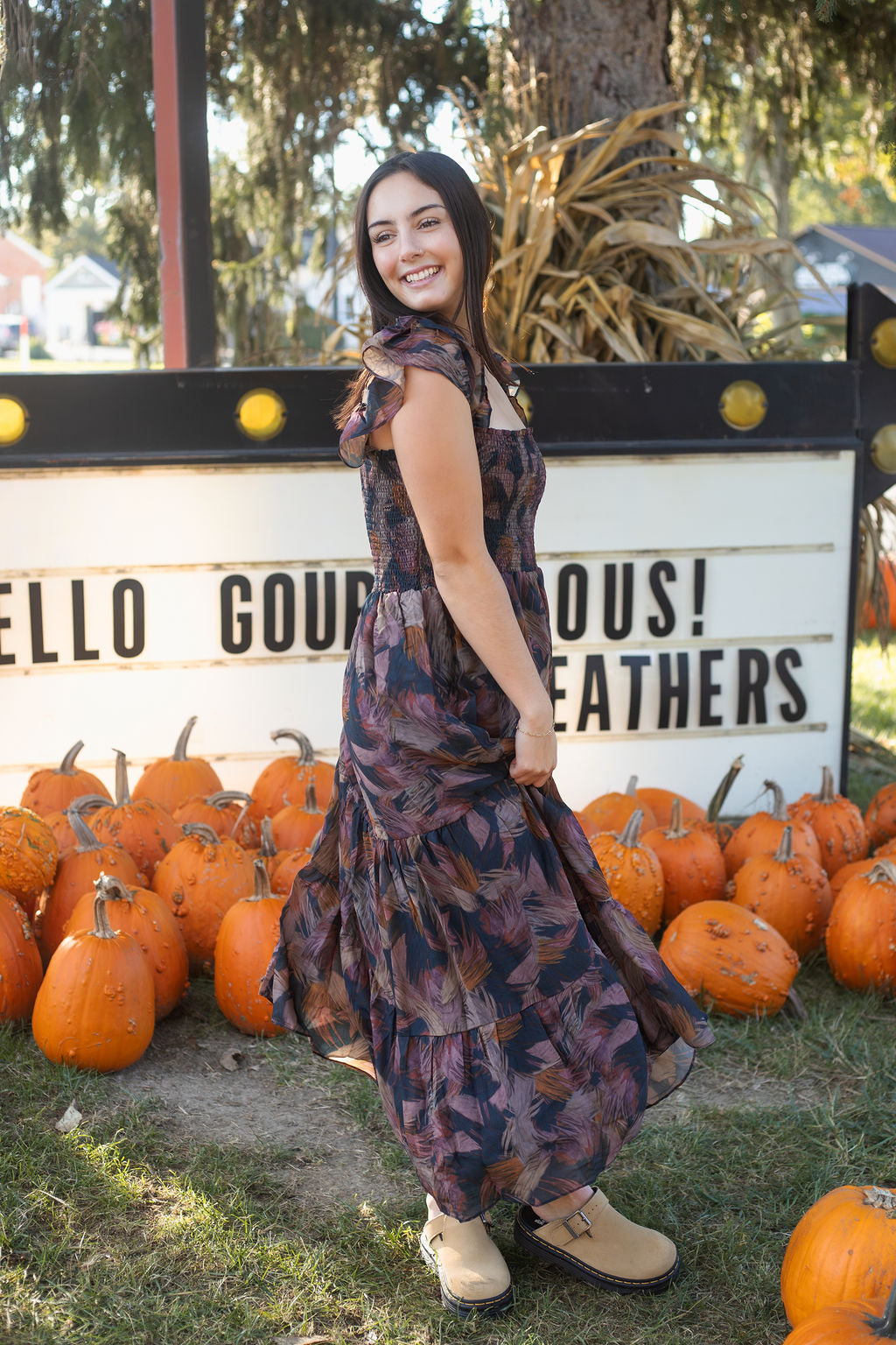 Tiered ruffle cap sleeves. Smocked bodice. Tiered ruffle skirt. Low back. High waist. Lined. Calf length. Fit-and-flare silhouette.