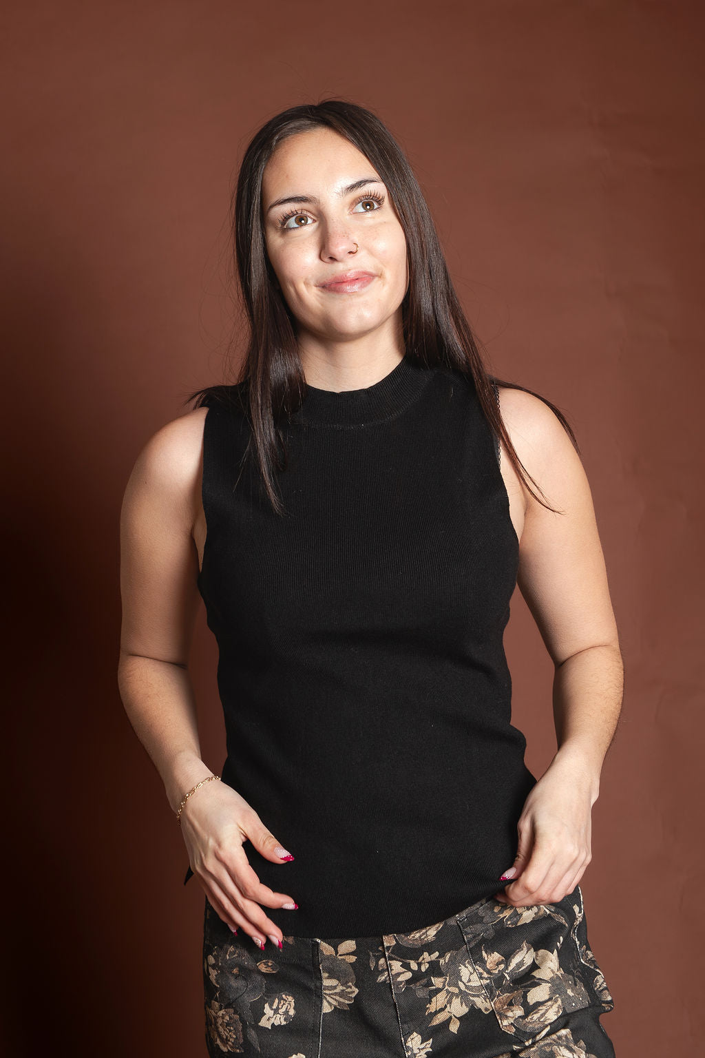 Classy fitted tank top made in a knit fabric with a mock neck. Perfect for casual afternoons, the workplace, or for an evening out!