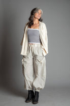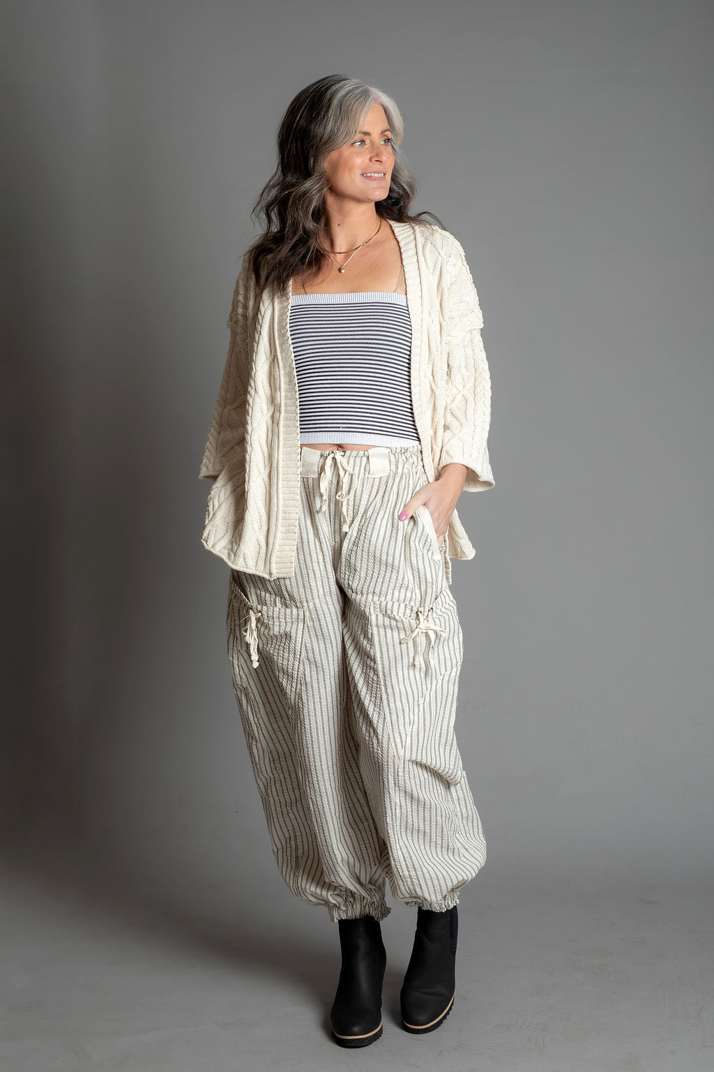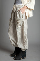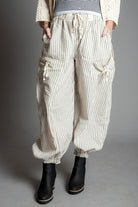 Striped jogger pants featuring an elastic waist with a drawstring cinch closure, two side hip pockets, two open side drawstring pockets, two back pockets, elastic cuffs creating a jogger pant leg and is a relaxed silhouette.