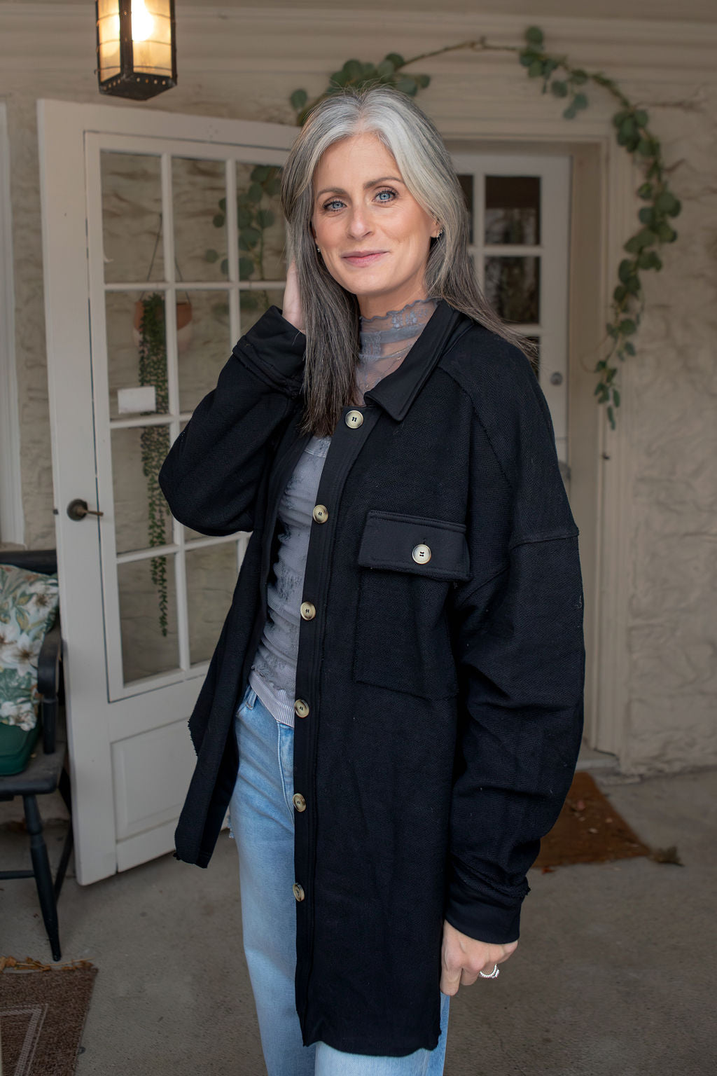 Crafted from a cozy cotton blend with a textured knit finish, it features a classic button-down front, functional breast pockets with snappy buttons, and effortlessly cool raw edges. Perfect for layering or wearing solo, this versatile piece transitions seamlessly from coffee runs to weekend hangouts. The structured collar adds polish while the relaxed fit keeps comfort front and center.
