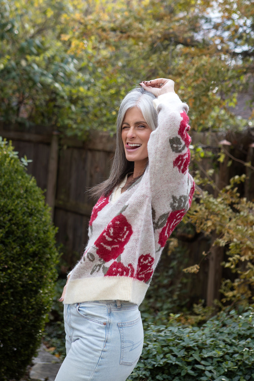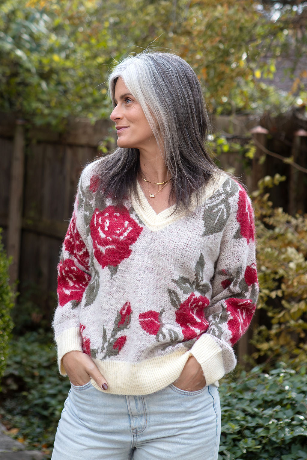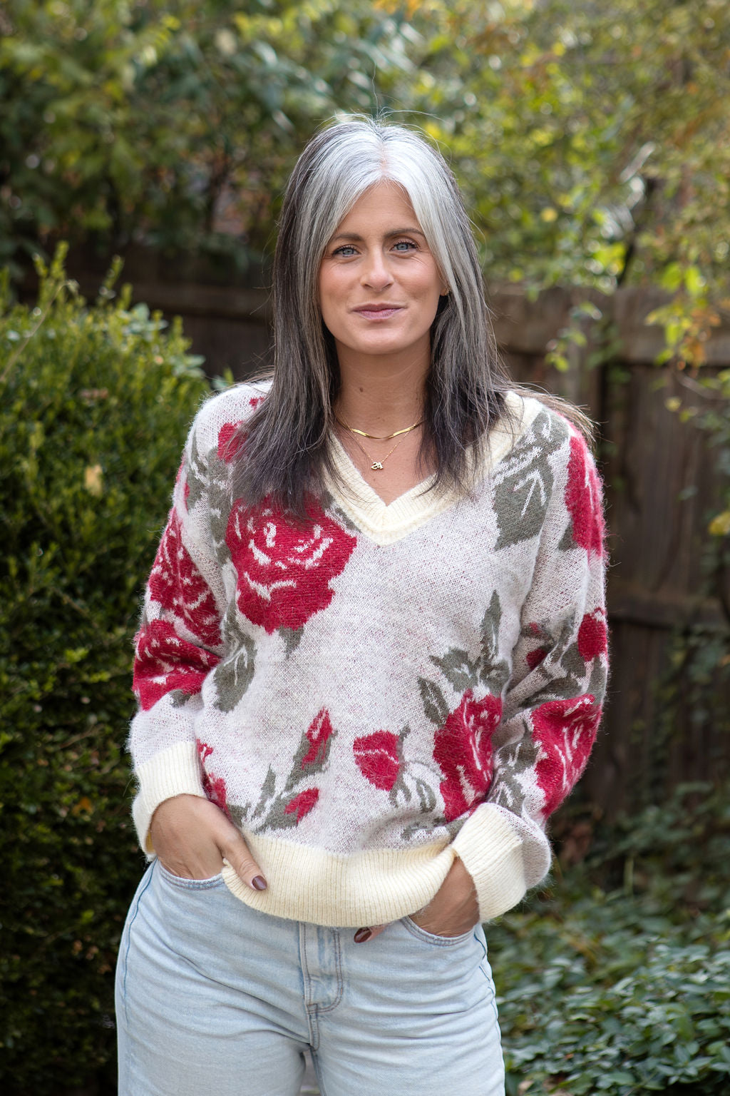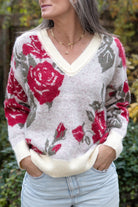 Slip into effortless elegance with this dreamy V-neck sweater, crafted from luxuriously soft mohair that feels like a cloud against your skin. The relaxed fit drapes beautifully for all-day comfort with a beautiful floral design,