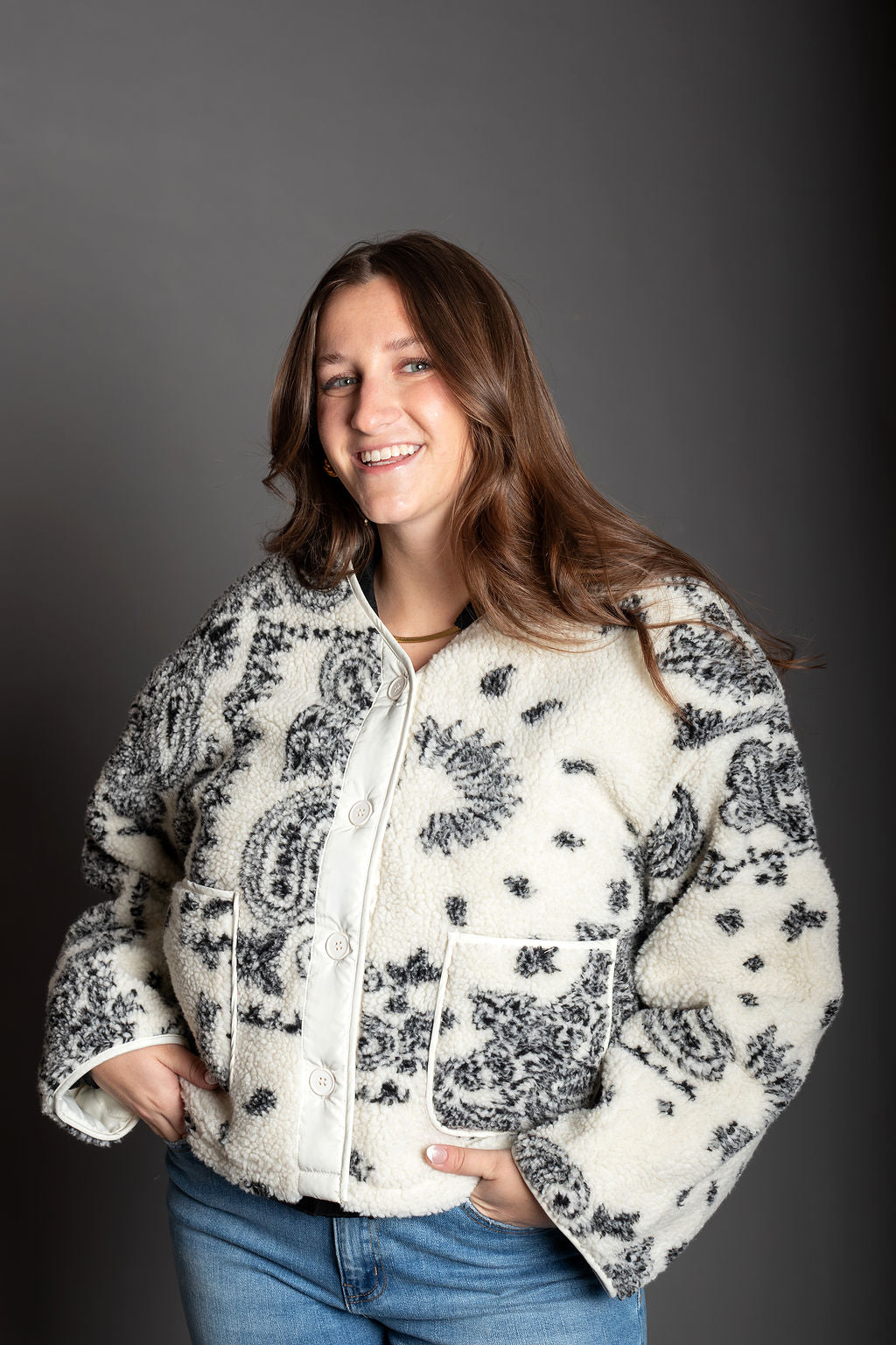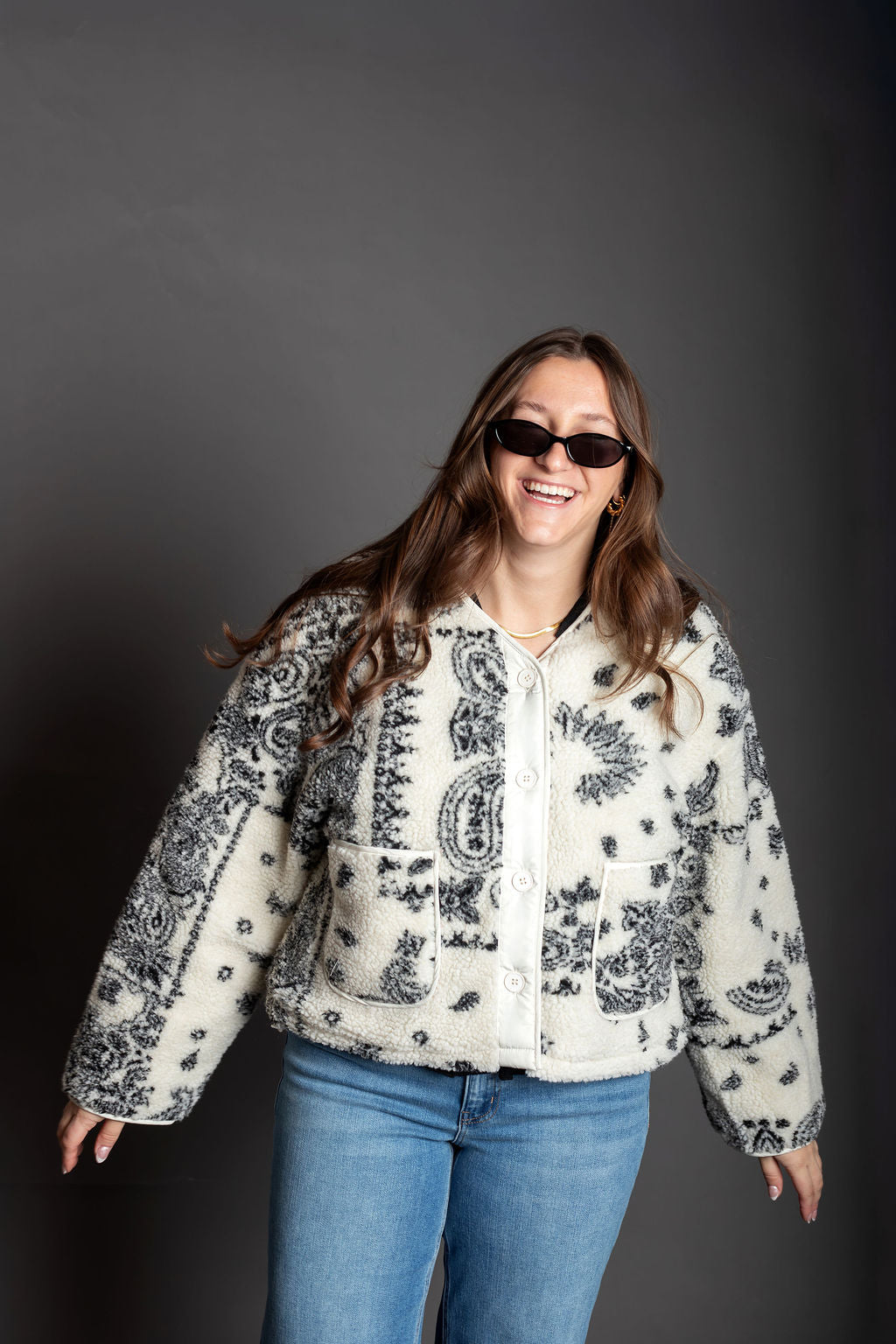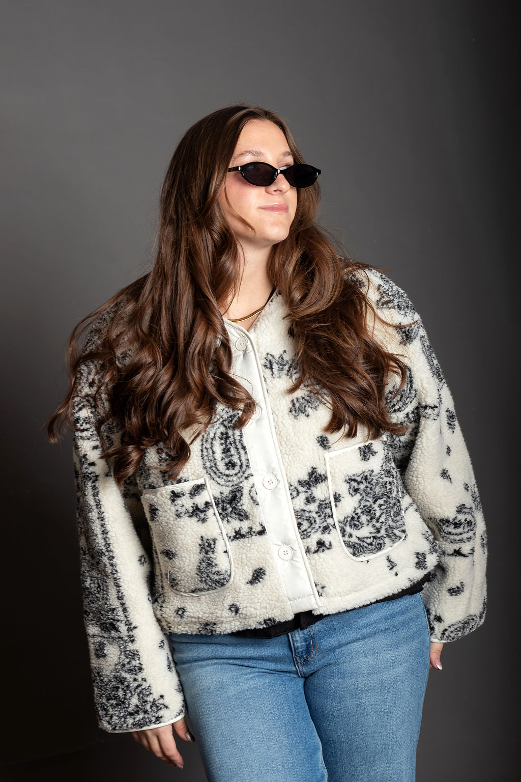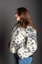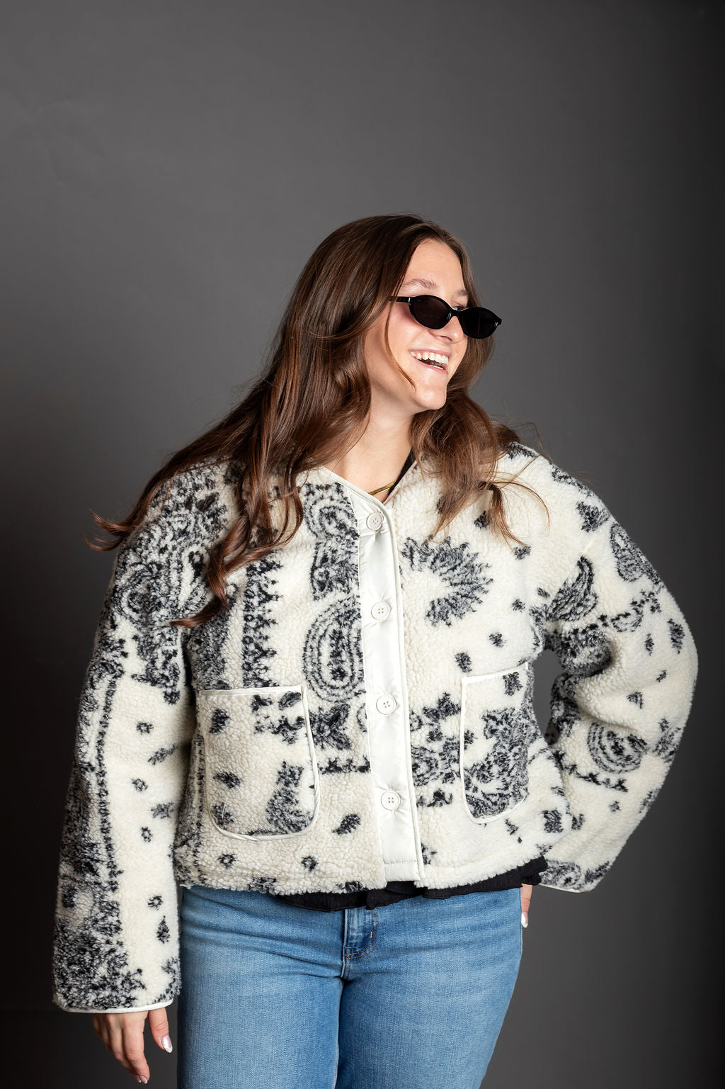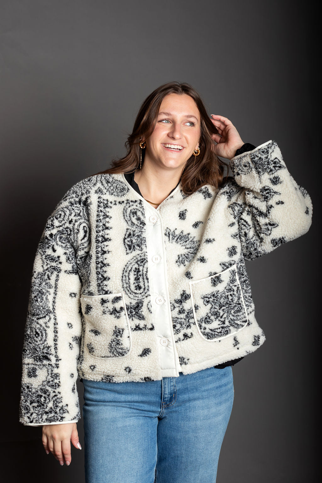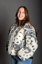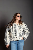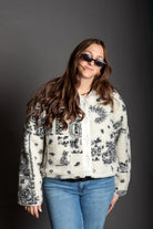 Paisley Print Drop Shoulder Teddy Jacket - Paisley fleece-like texture - Sleek, lined silhouette with long sleeves - Drop shoulder - Button closure - Front pockets, and a cozy - Slightly crop jacket
