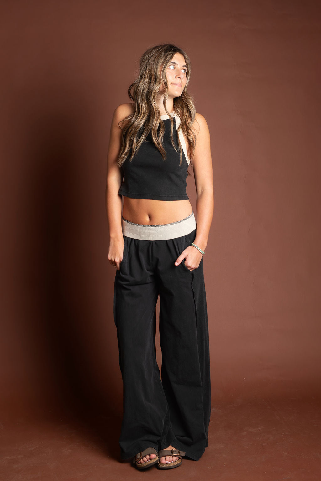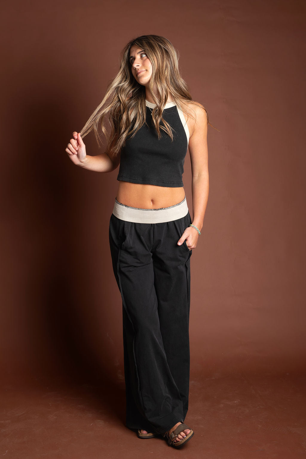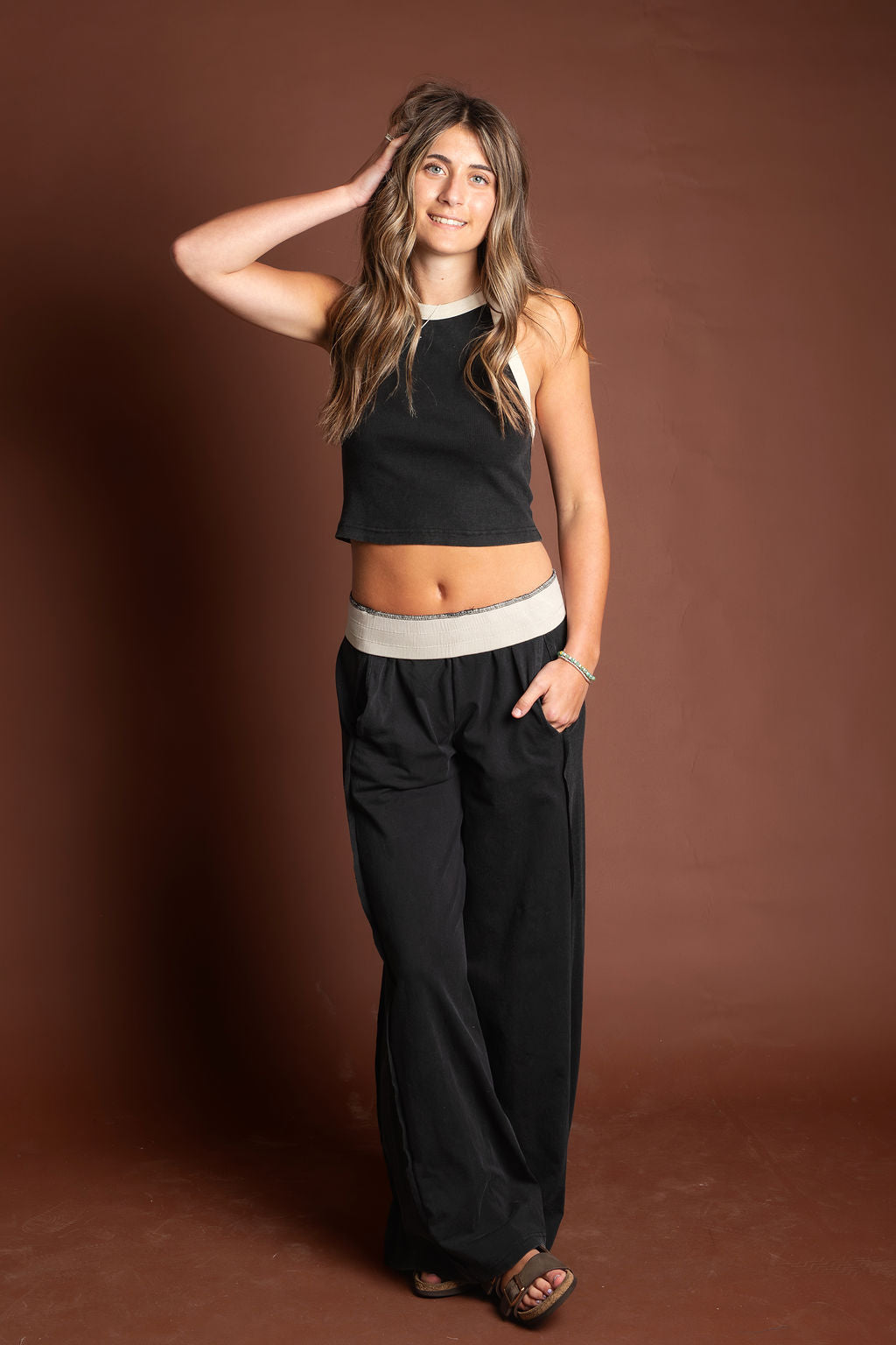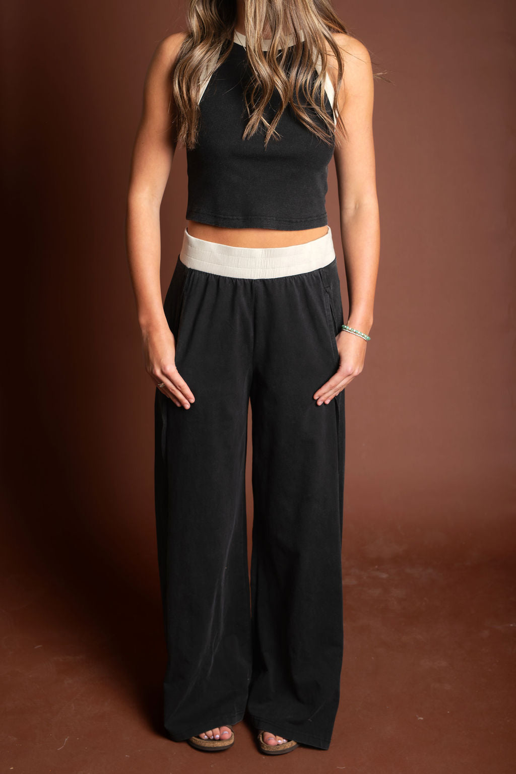 JOGGERS: These effortless, wide leg lounge pants feature a comfortable high rise silhouette with a contrasting elastic waistband, designed with relaxed side hip pockets and a ribbed side panel for an elevated, laid back aesthetic.