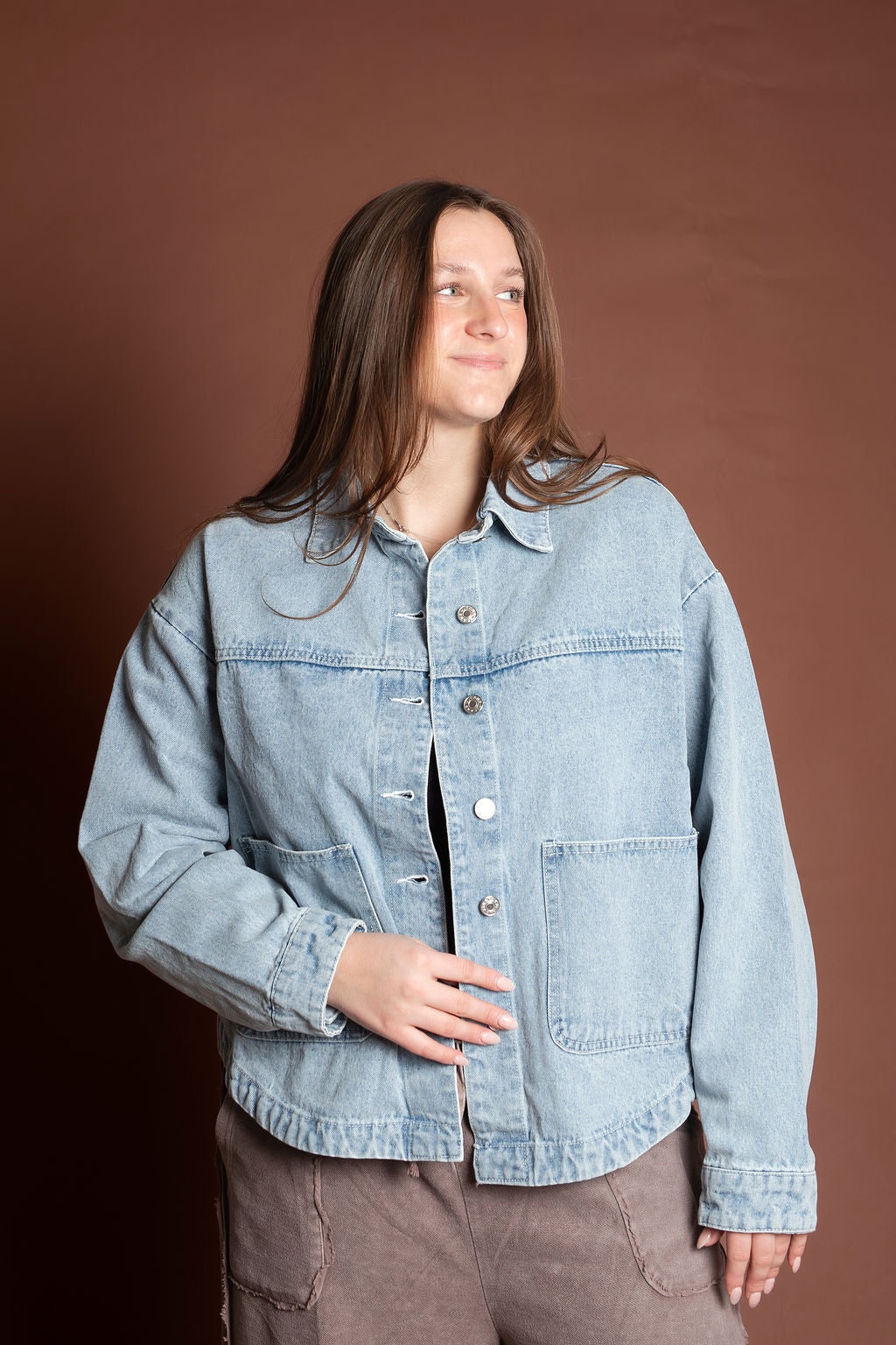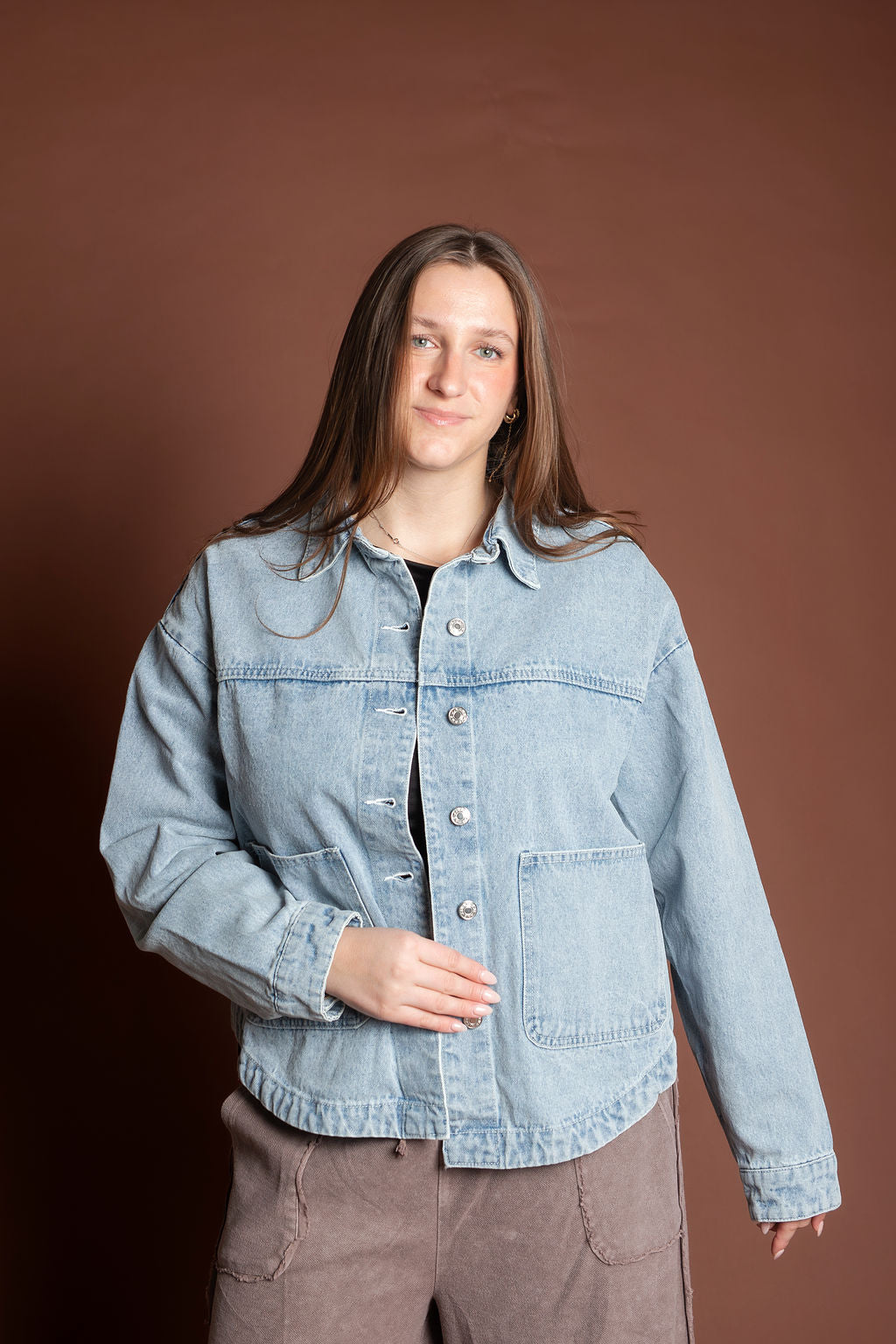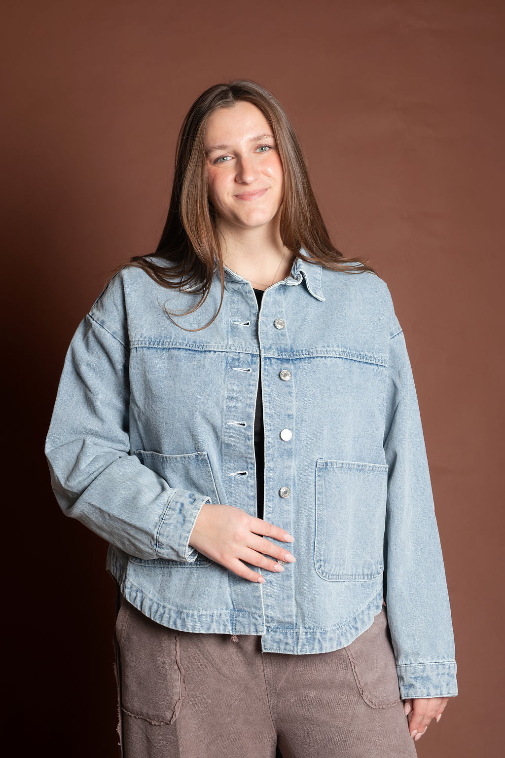 This short length denim jacket features a slight boxy fit that's perfect for spring and summer layering. Crafted from classic denim and imported for quality construction, it's a versatile staple with a buttoned front closure that works with any casual wardrobe.