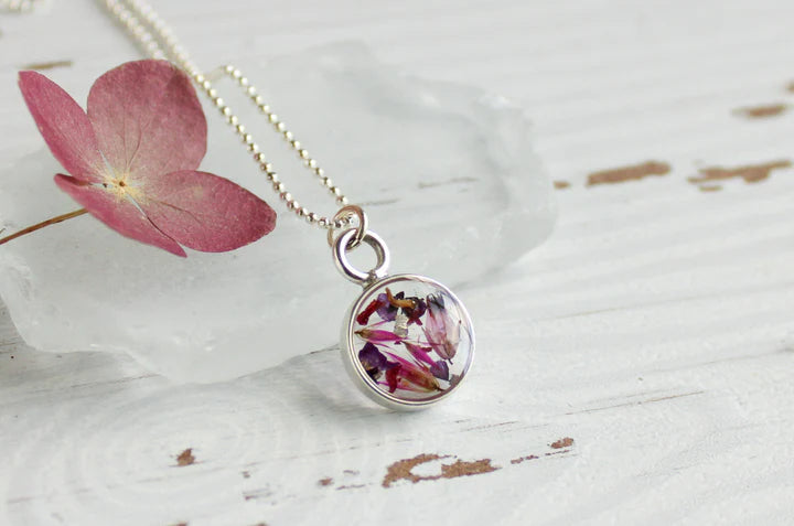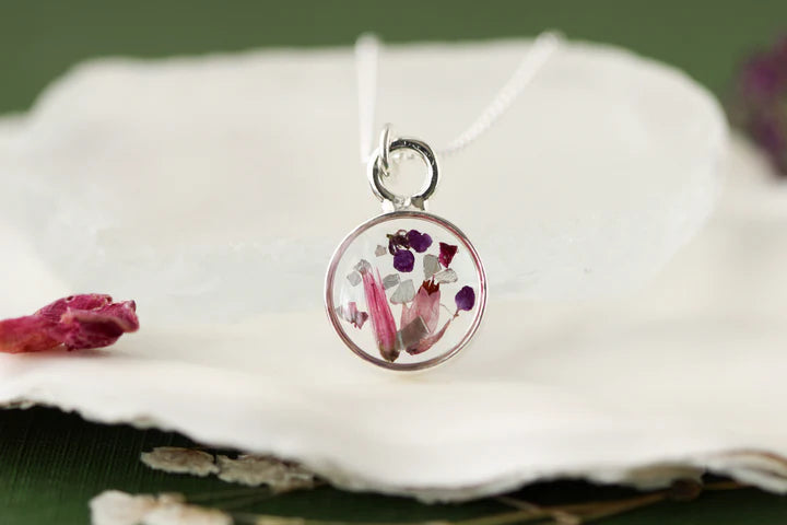 A wonderful bouquet of pink dried flowers inside glossy resin fill this tiny circle. Flowers are rose petals, heather, alyssum, and celosia. Bits of gold glass glitter are added for some extra sparkle. So sweet and dainty! Charm hangs on an 18” gold filled chain.