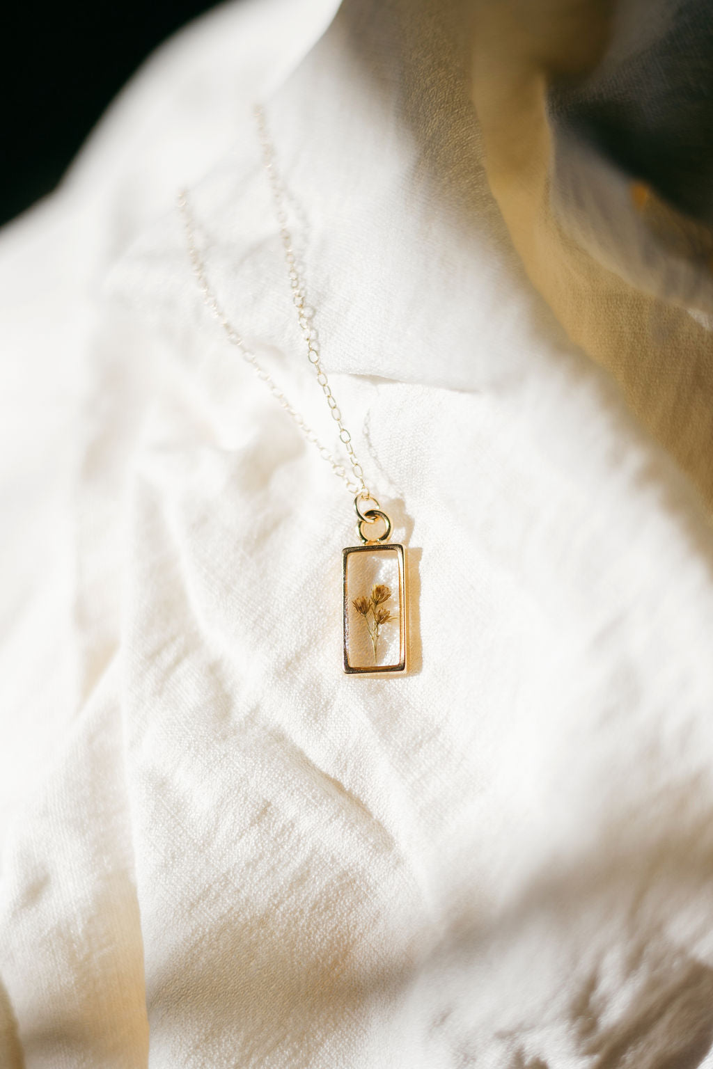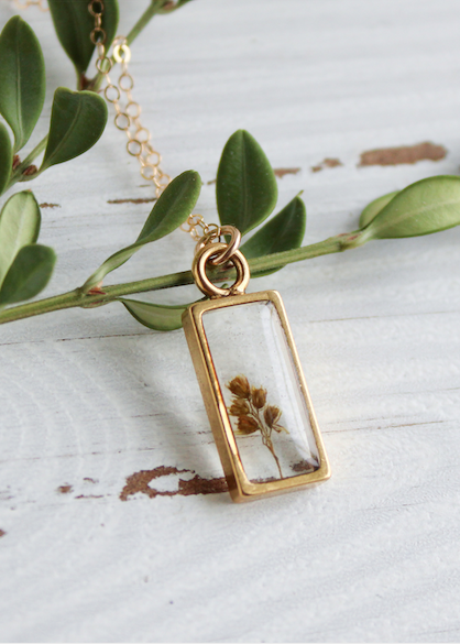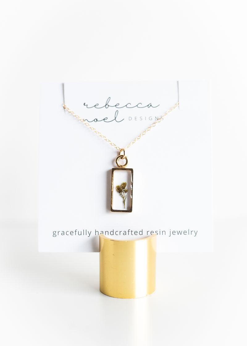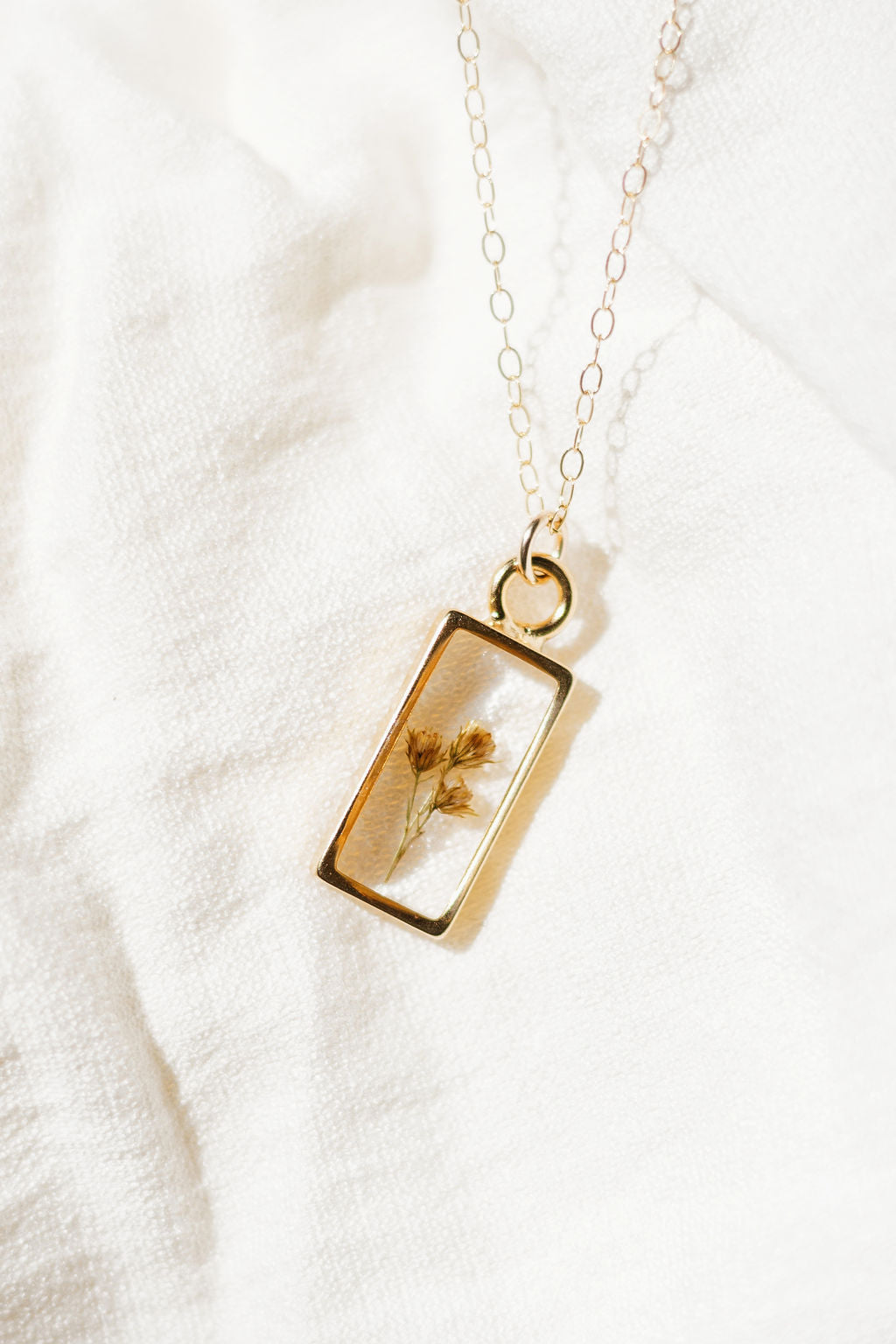 This handcrafted necklace features tiny solidago flowers encased in clear resin within a sleek mini rectangle pendant. It hangs gracefully from an 18-inch gold-filled chain, combining natural beauty with refined elegance.