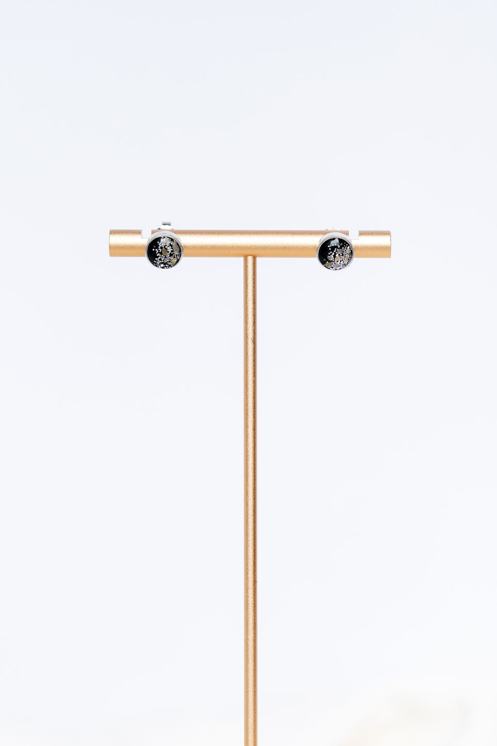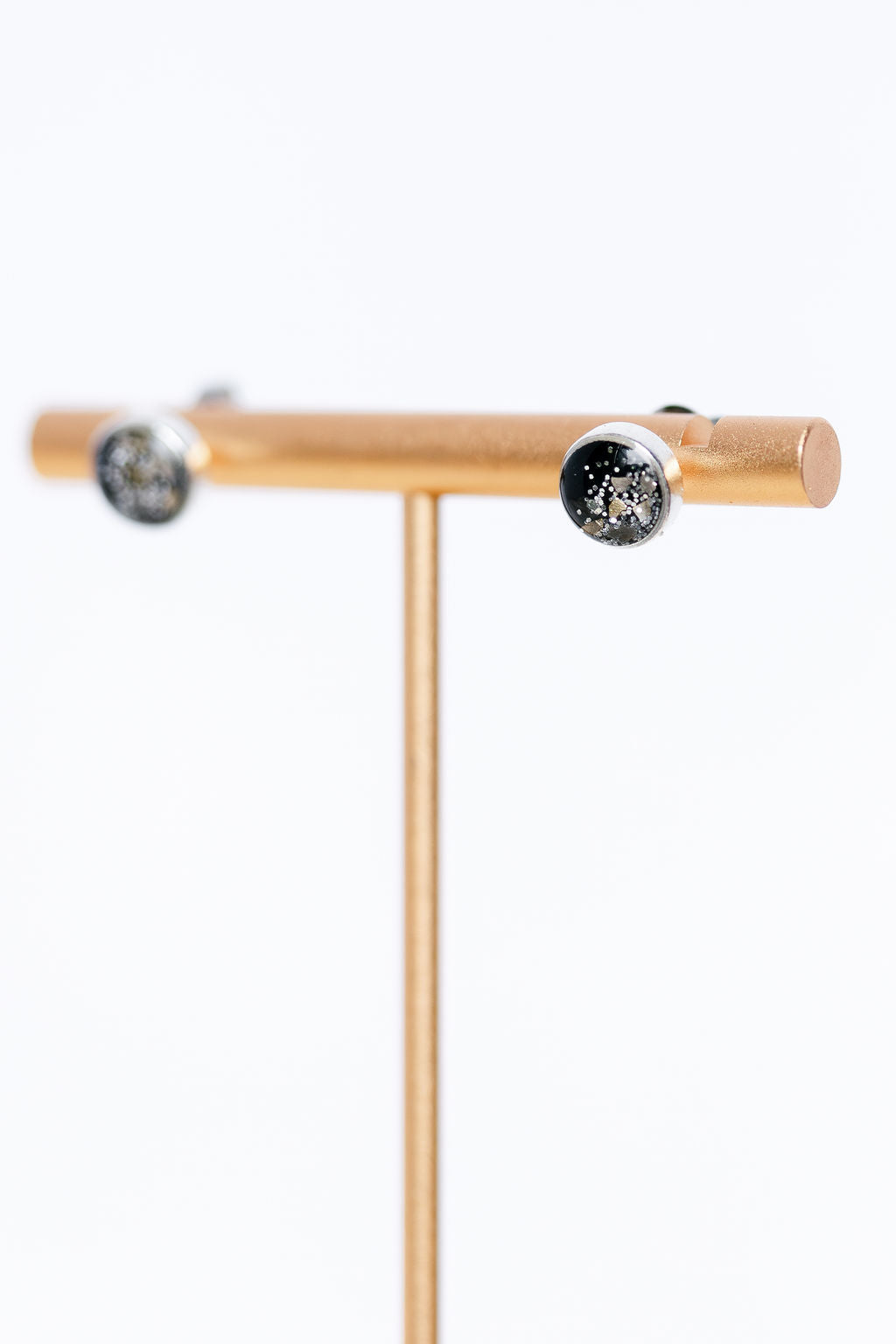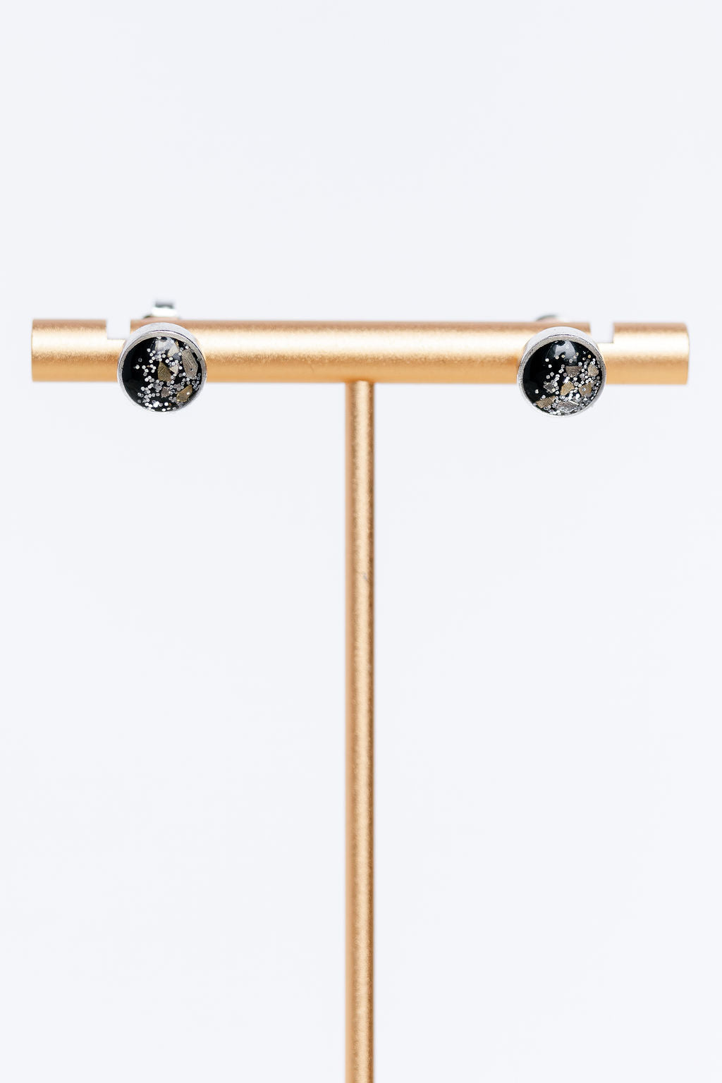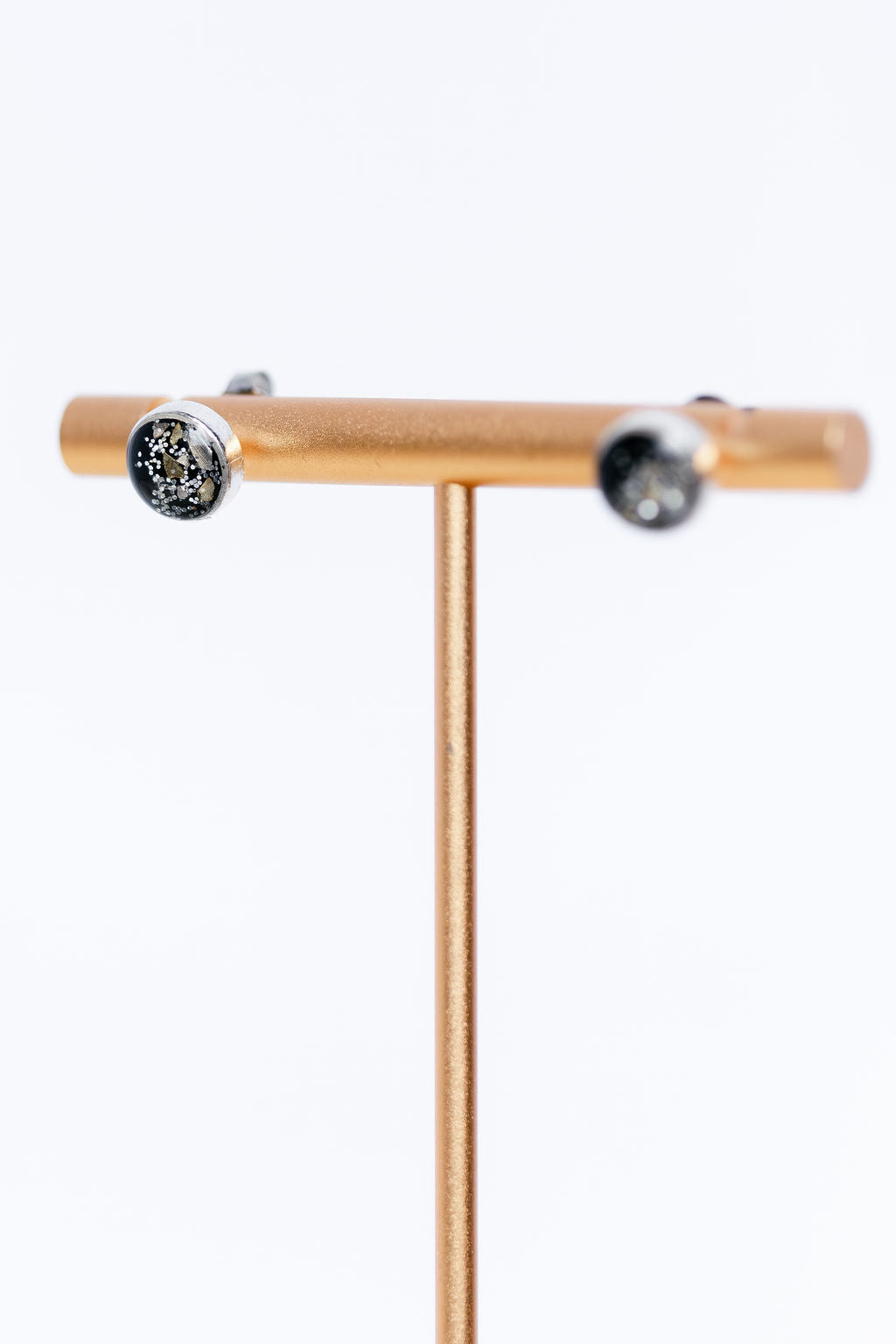 Introducing our new Black Shimmer Stud Earrings in Silver. Made with hypo-allergenic stainless steel posts, these earrings feature a unique blend of epoxy clay, mica dust, crushed glass, and glitter, all topped with resin for a stunning finish. The circular shape and silver tone bring a touch of elegance to any outfit.