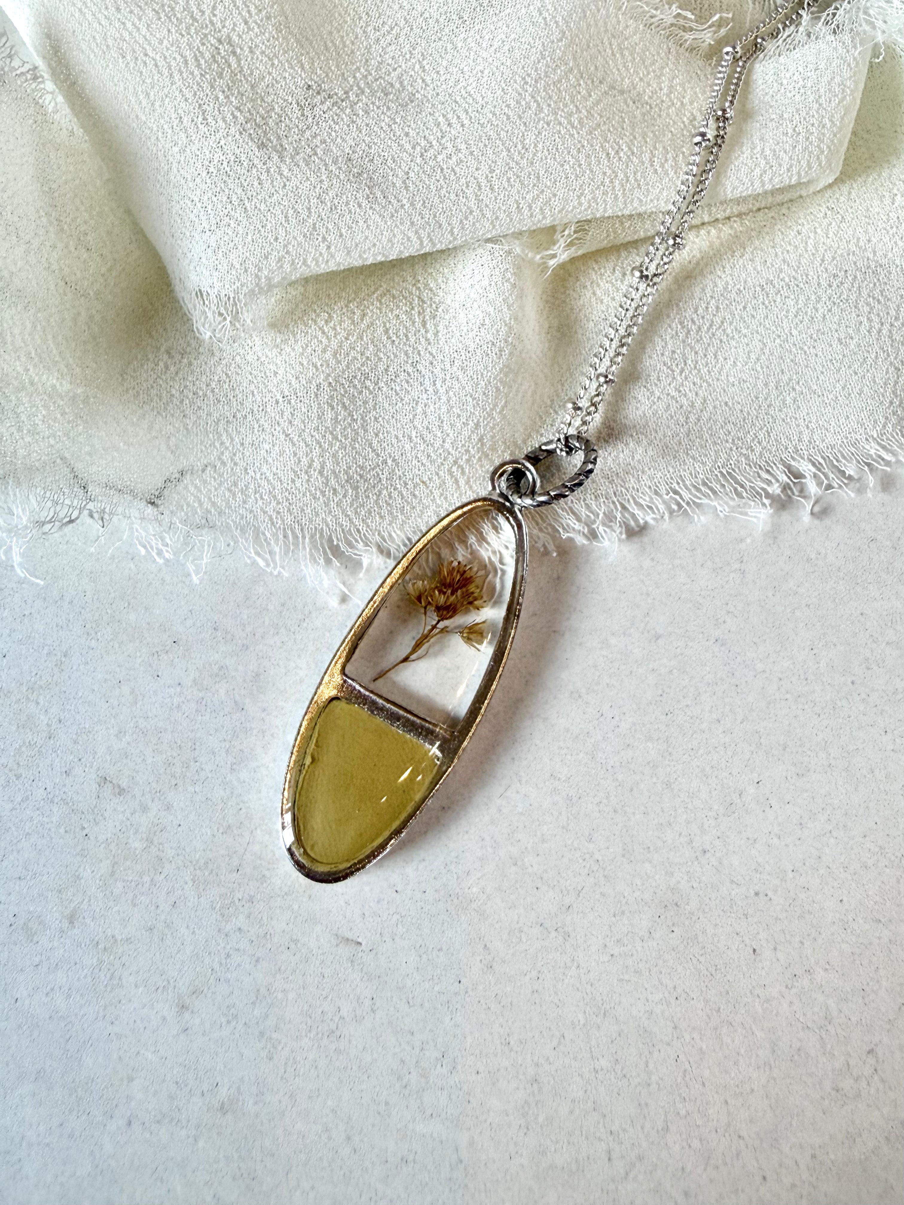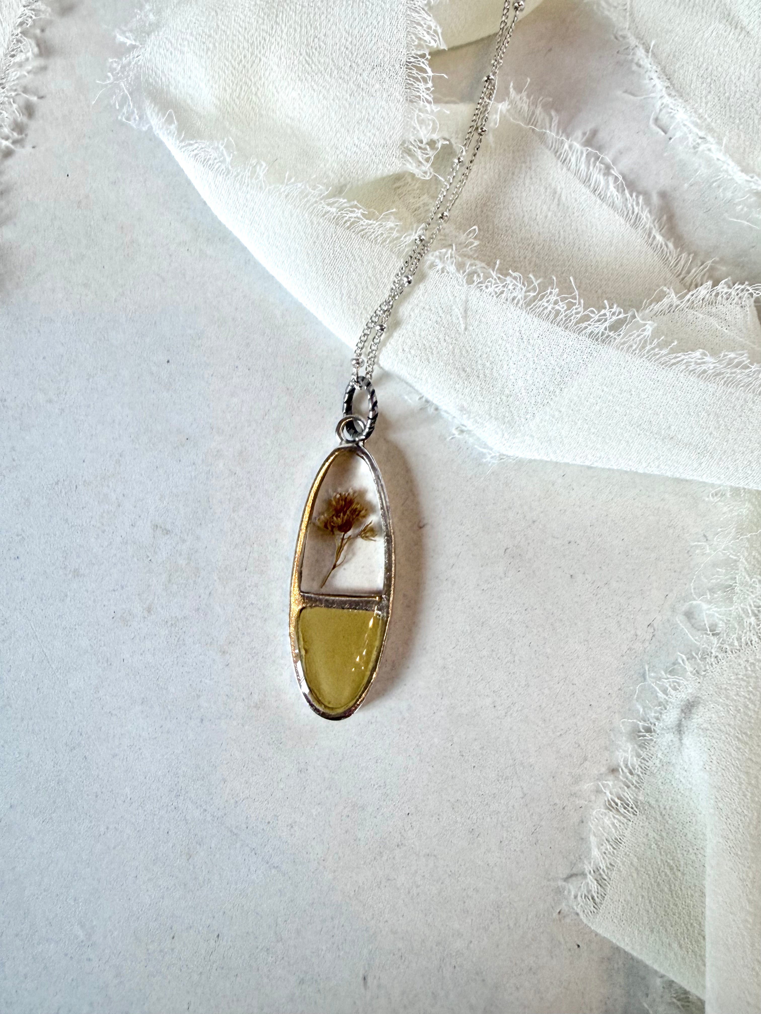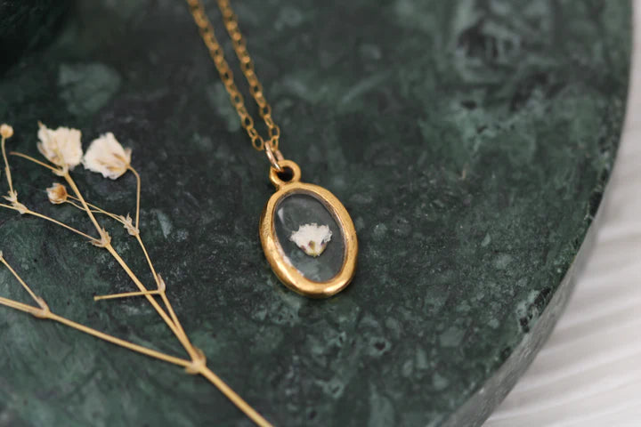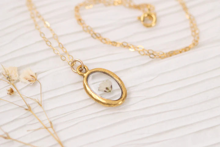Oval Gold + White Baby's Breath Necklace by Rebecca Noel Designs