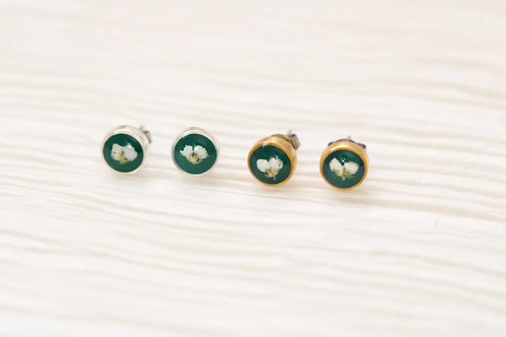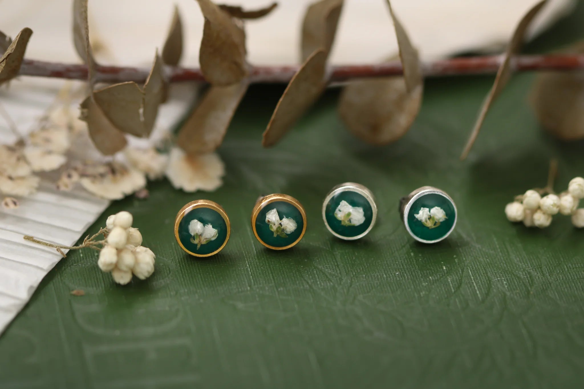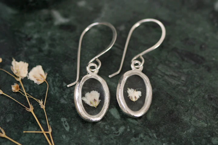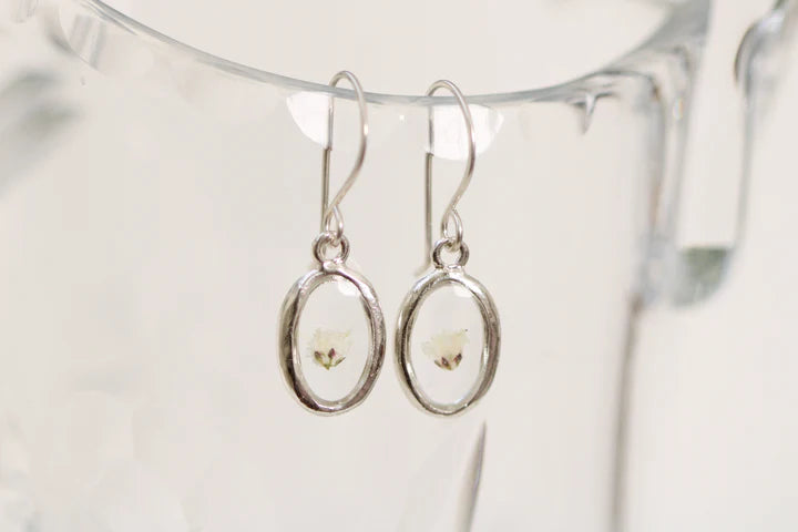Oval Silver +Baby's Breath Earrings by Rebecca Noel Designs