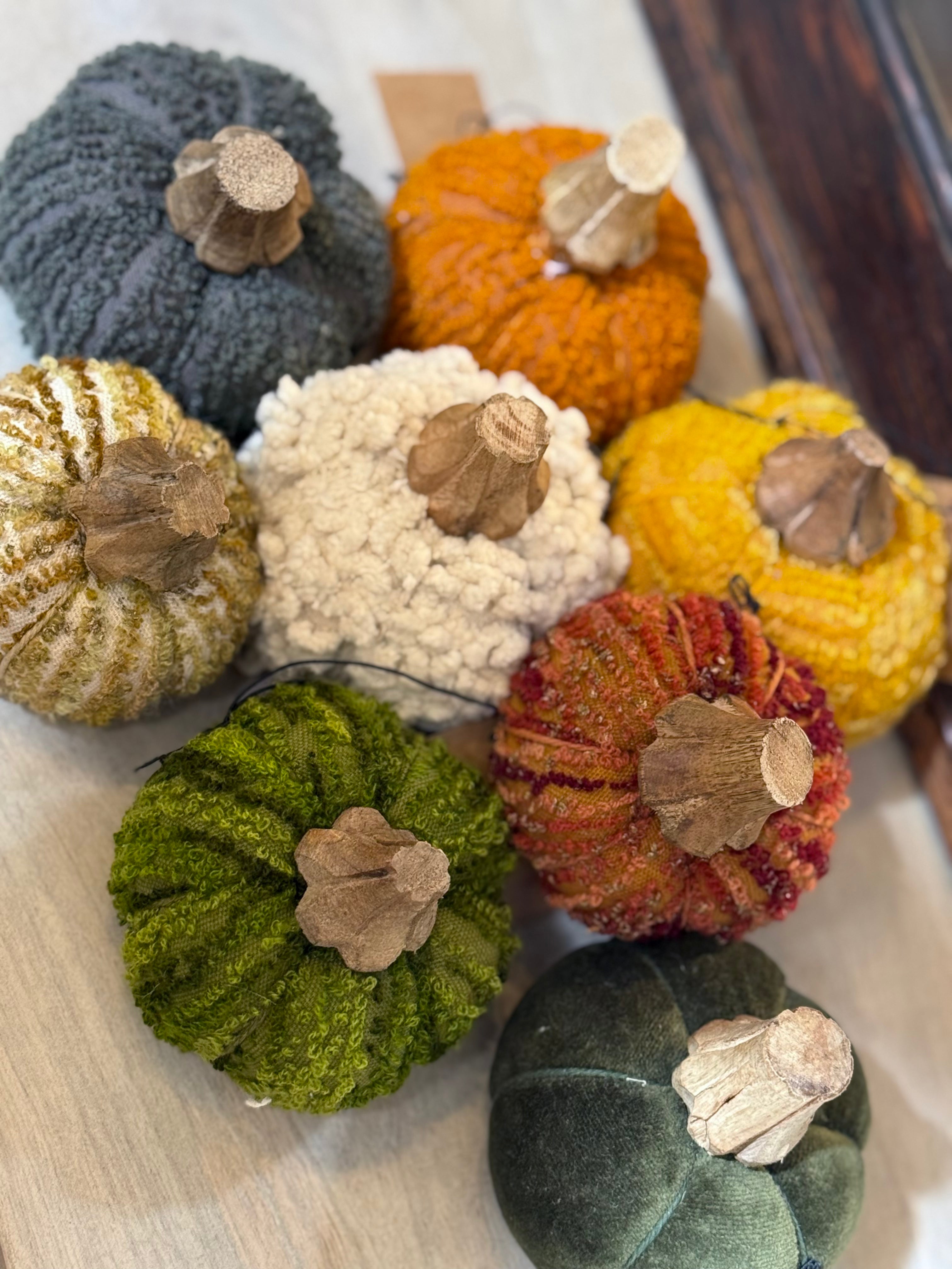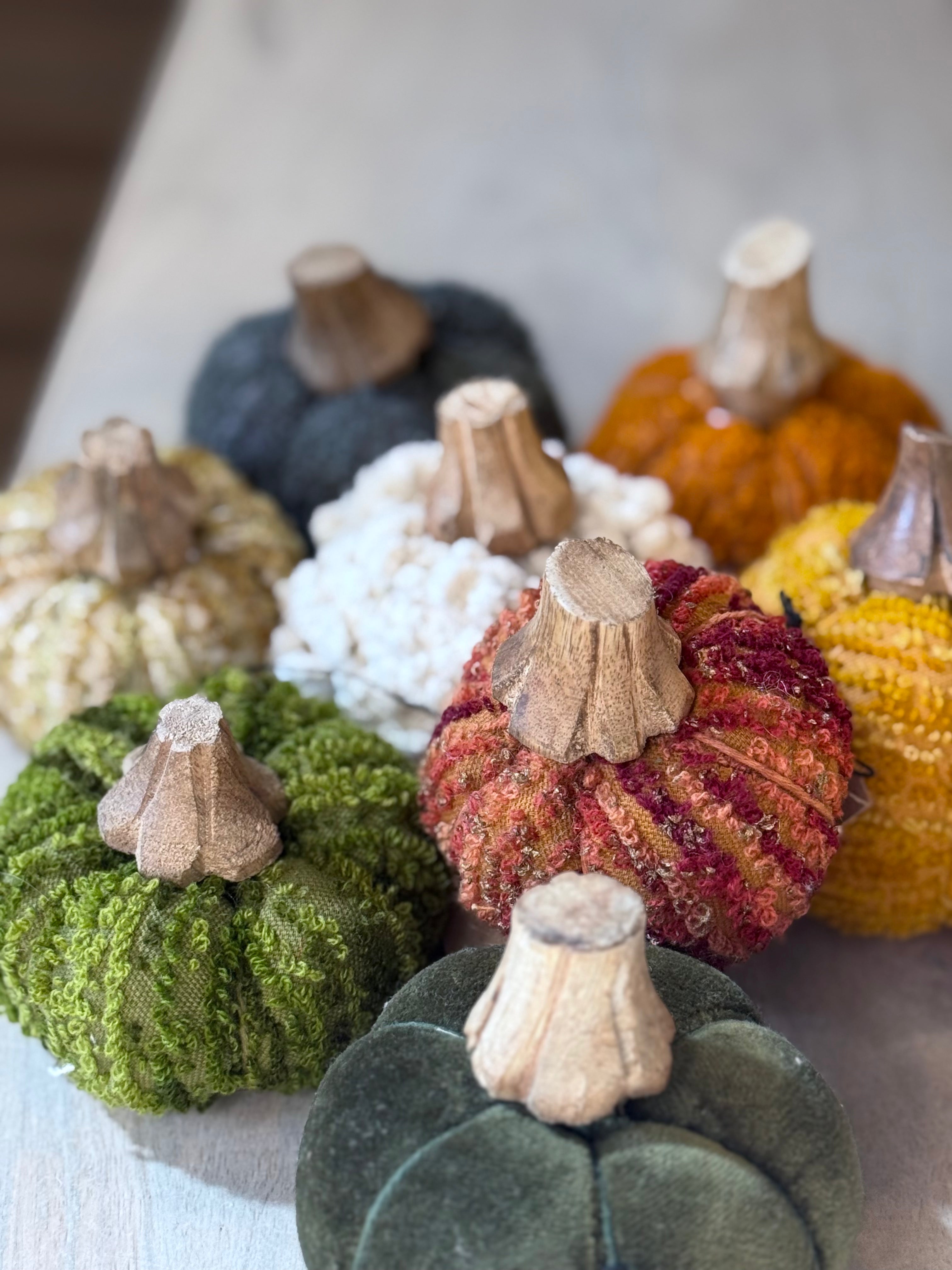 This multicolor cotton blend bouclé/velvet pumpkin with wood stem is a charming and festive decoration that adds warmth and color to any space. It features a round pumpkin shape with a soft, textured bouclé/velvet cover and a natural wood stem. This versatile accessory can be used to decorate homes, offices, or shops during the fall season or as a centerpiece or gift basket. Made of high-quality polyester blend and mango wood, it is durable, eco-friendly, and easy to clean. Measuring 3.5 inches in diameter and 3 inches in height, it's available in six colors: Rust, Mustard, Charcoal Grey, Velvet Forest Green, Forest Green, and Cream, this item is perfect for creating a cozy atmosphere or celebrating the harvest and Halloween season.