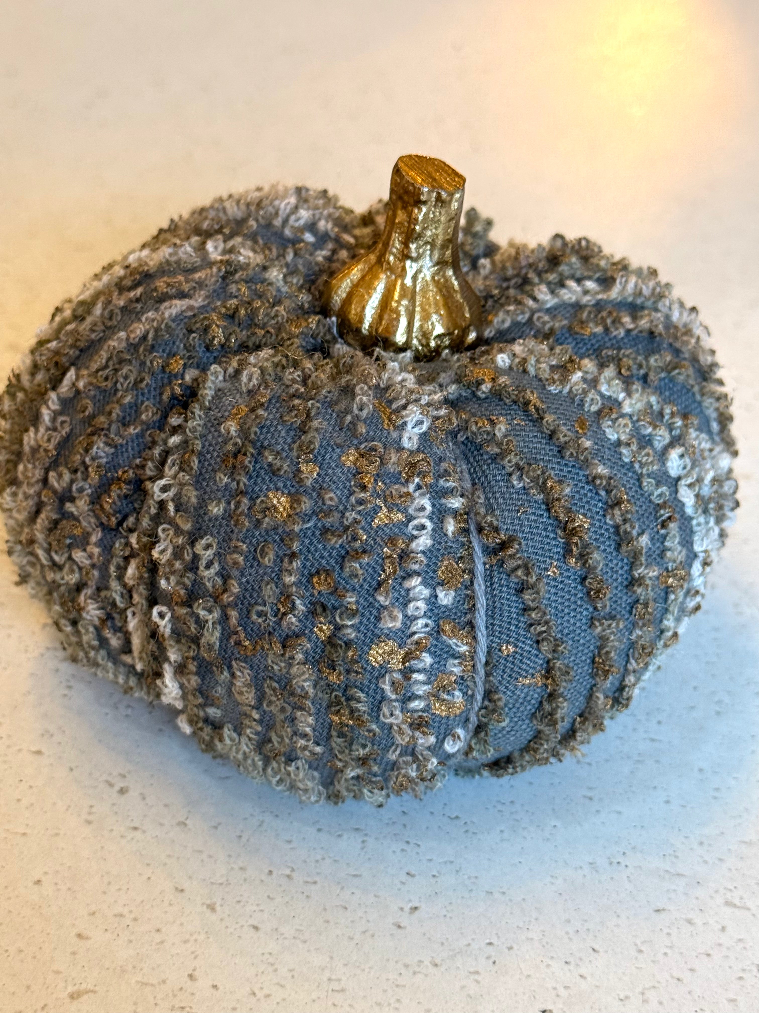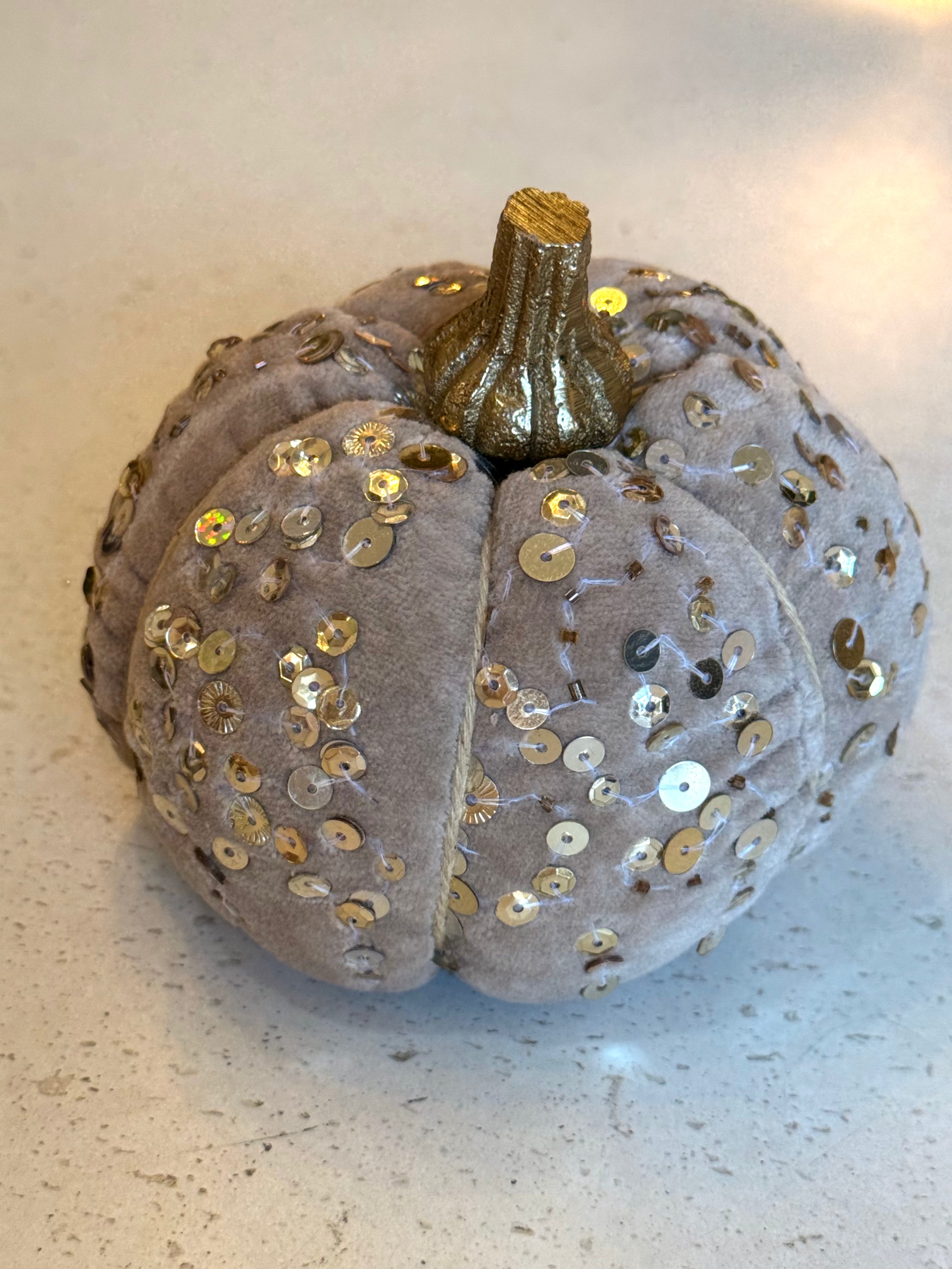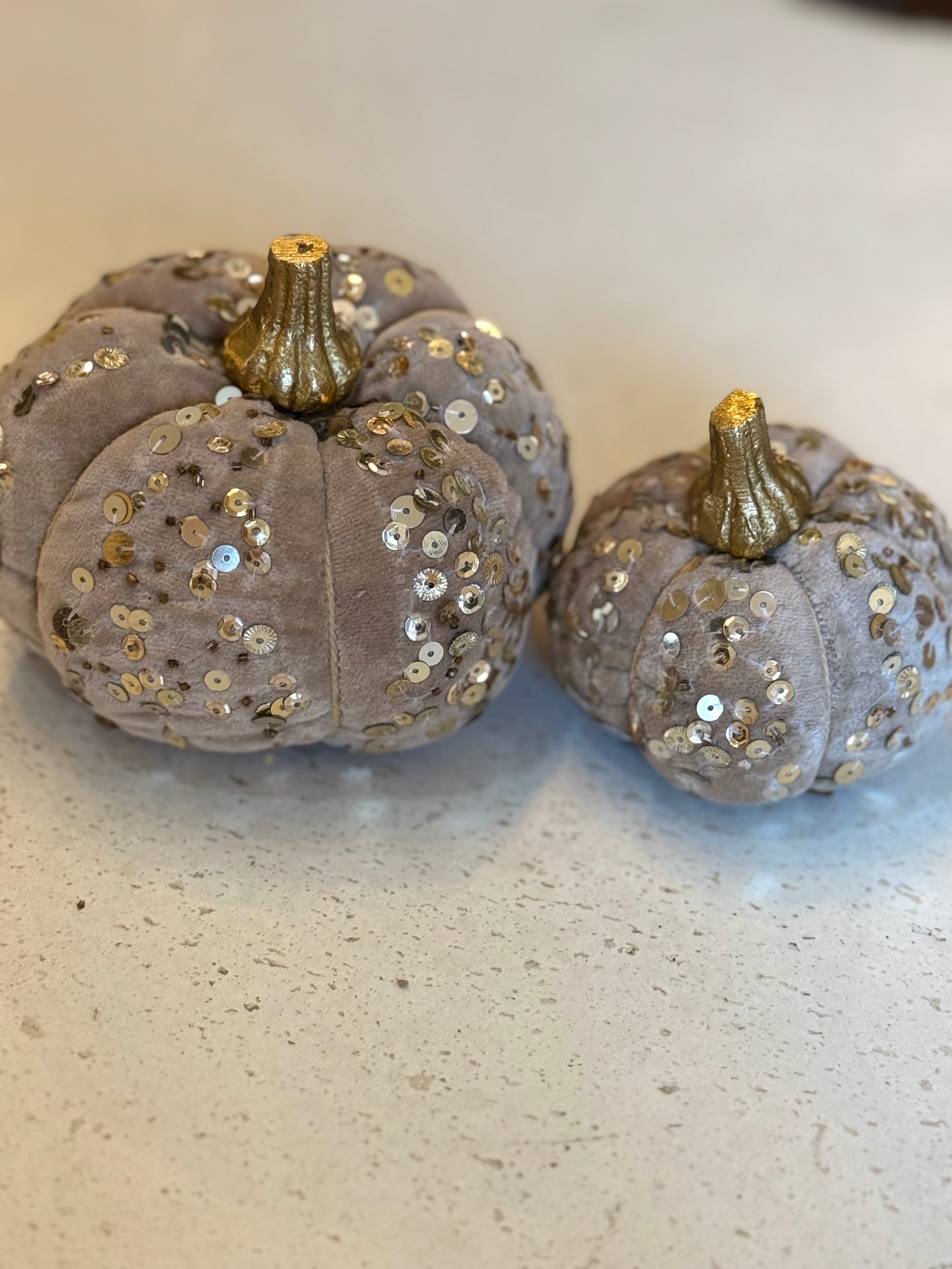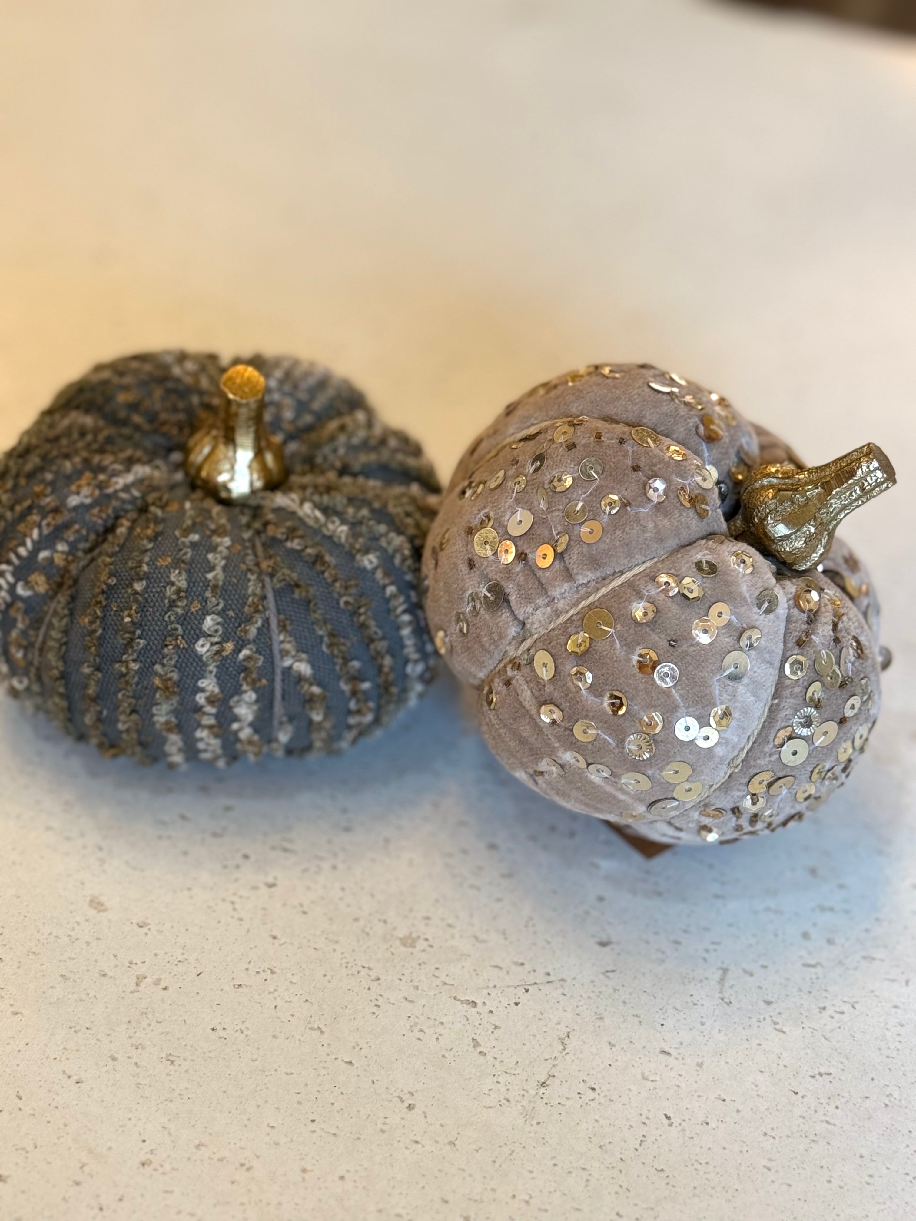 Charming 3" and 4.5-inch decorative pumpkin crafted from cotton velvet and adorned with sequin and bouclé details, perfect for seasonal autumn décor.