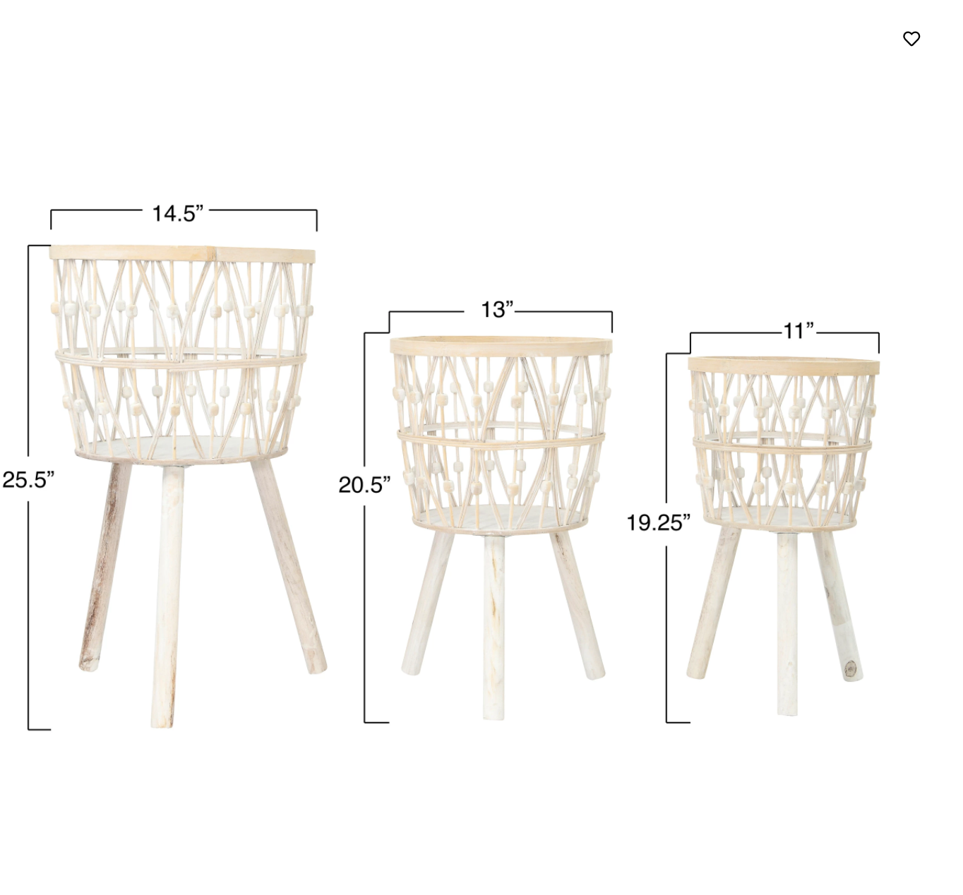 Raised baskets are always an attention getter in any setting. This trio of white bamboo baskets are designed to hold a variety of potted plants up for all to see. Their uses can also be altered to create an amazing space in the entryway. Sold individually.