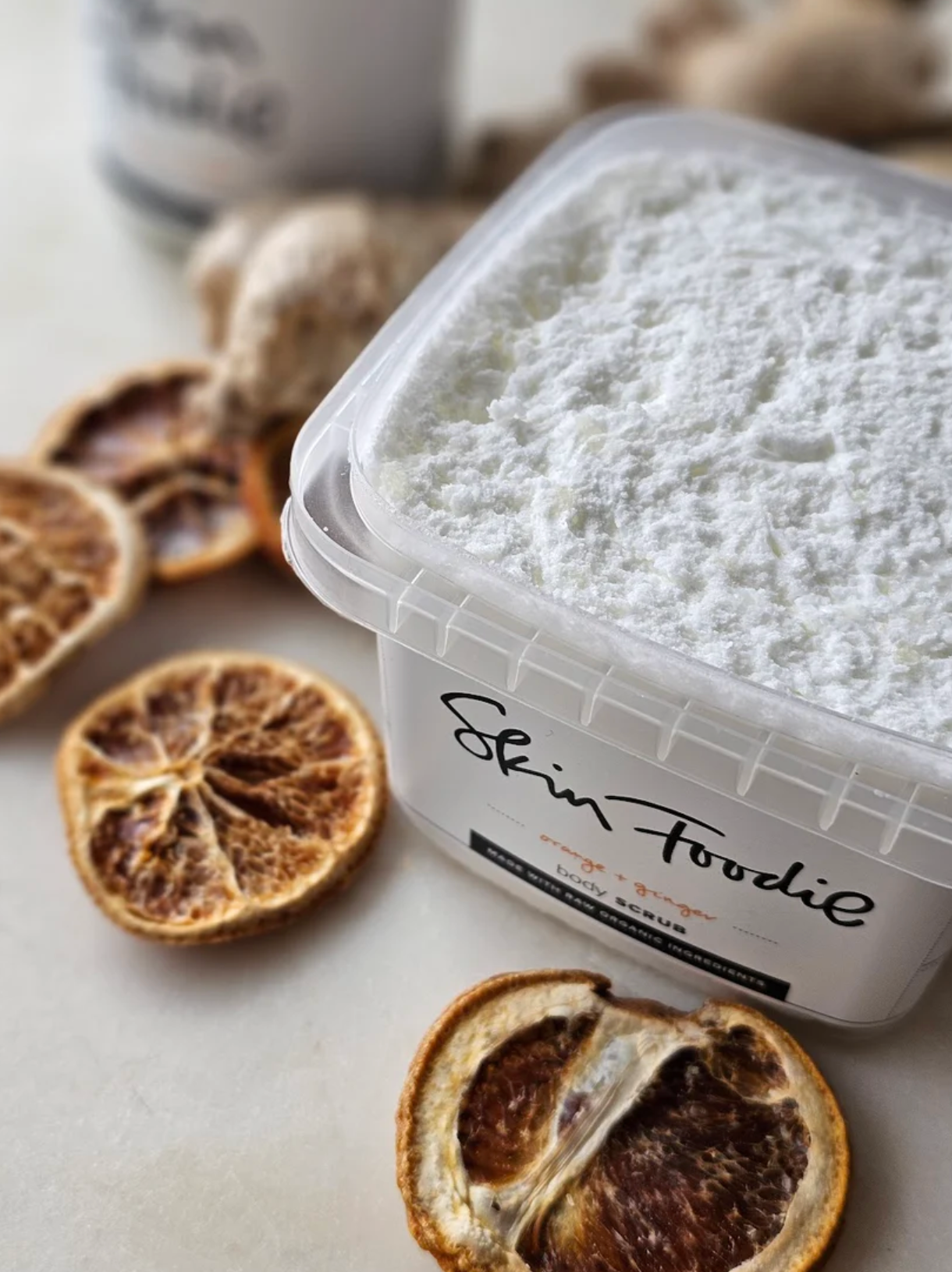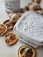 The Orange + Ginger Body Scrub is a rejuvenating exfoliant that invigorates your skin and senses with the energizing blend of orange and ginger oils. Enriched with Dead Sea salt, shea butter, and coconut oil, this scrub gently buffs away dead skin cells while hydrating and revitalizing your skin. Its bright citrus and spicy ginger aroma provides a refreshing and uplifting experience, leaving your skin smooth, glowing, and refreshed.