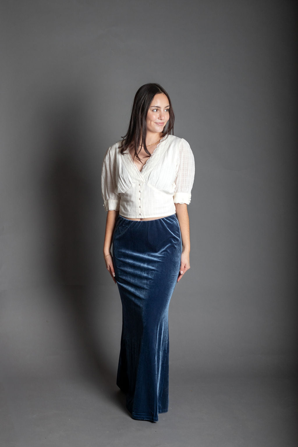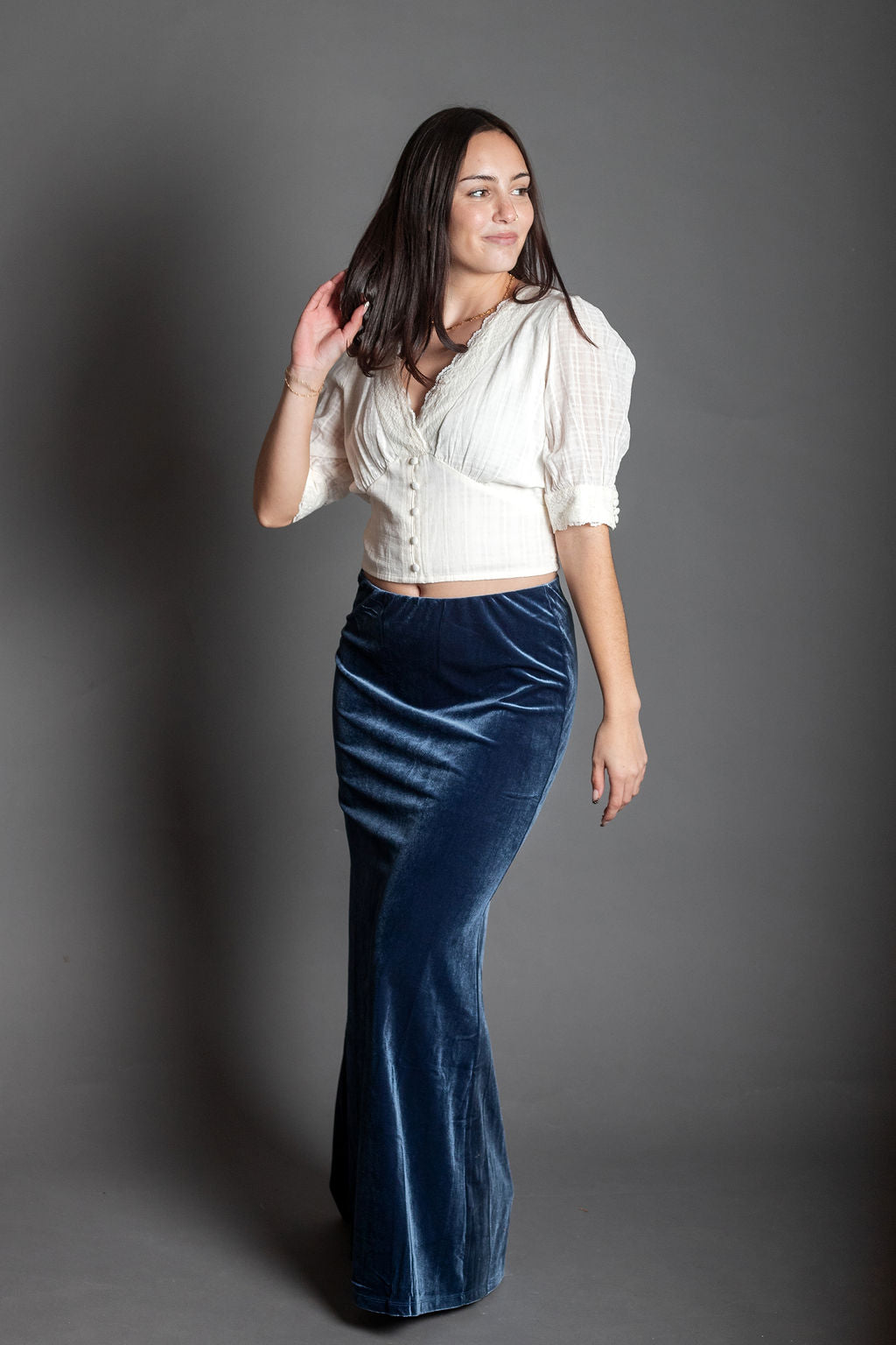 Slip into effortless elegance with our Lolita Dusty Blue Velvet Maxi Skirt. This luxurious pull-on style features sumptuous velvet fabric in a soft, muted dusty blue that pairs beautifully with everything in your closet. No zippers, no fuss—just smooth, comfortable wear from morning to night. The flowing maxi silhouette creates a romantic, twirl-worthy look that's perfect for date nights, special occasions, or whenever you want to feel absolutely fabulous. Velvet never goes out of style, and neither will you in this dreamy piece.