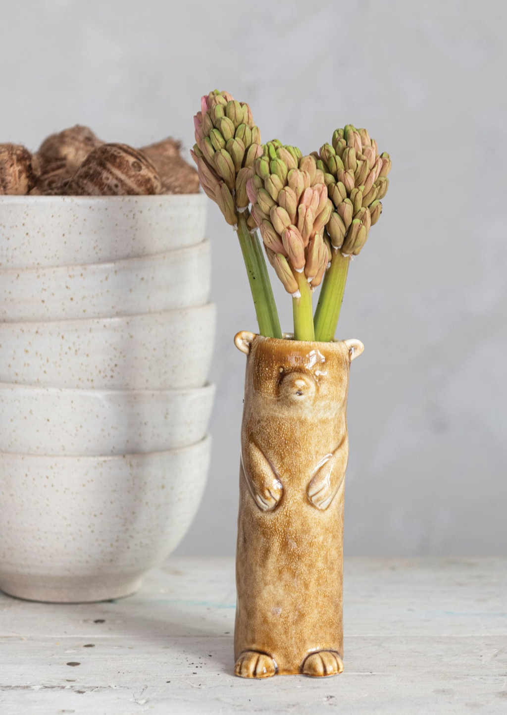 This charming stoneware vase features a whimsical bear design that adds a touch of playfulness to every home decor, with reactive crackle glaze in a warm brown hue. Perfect for homes with rustic, woodland, or nature-inspired decor styles, its cute bear design and earthy color palette create a warm and inviting ambiance. Its compact size allows for easy placement on various surfaces, while the opening at the top provides a small space to hold a single stem or a small bouquet of flowers. Made of stoneware.