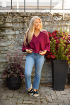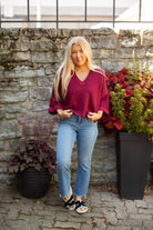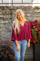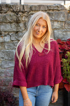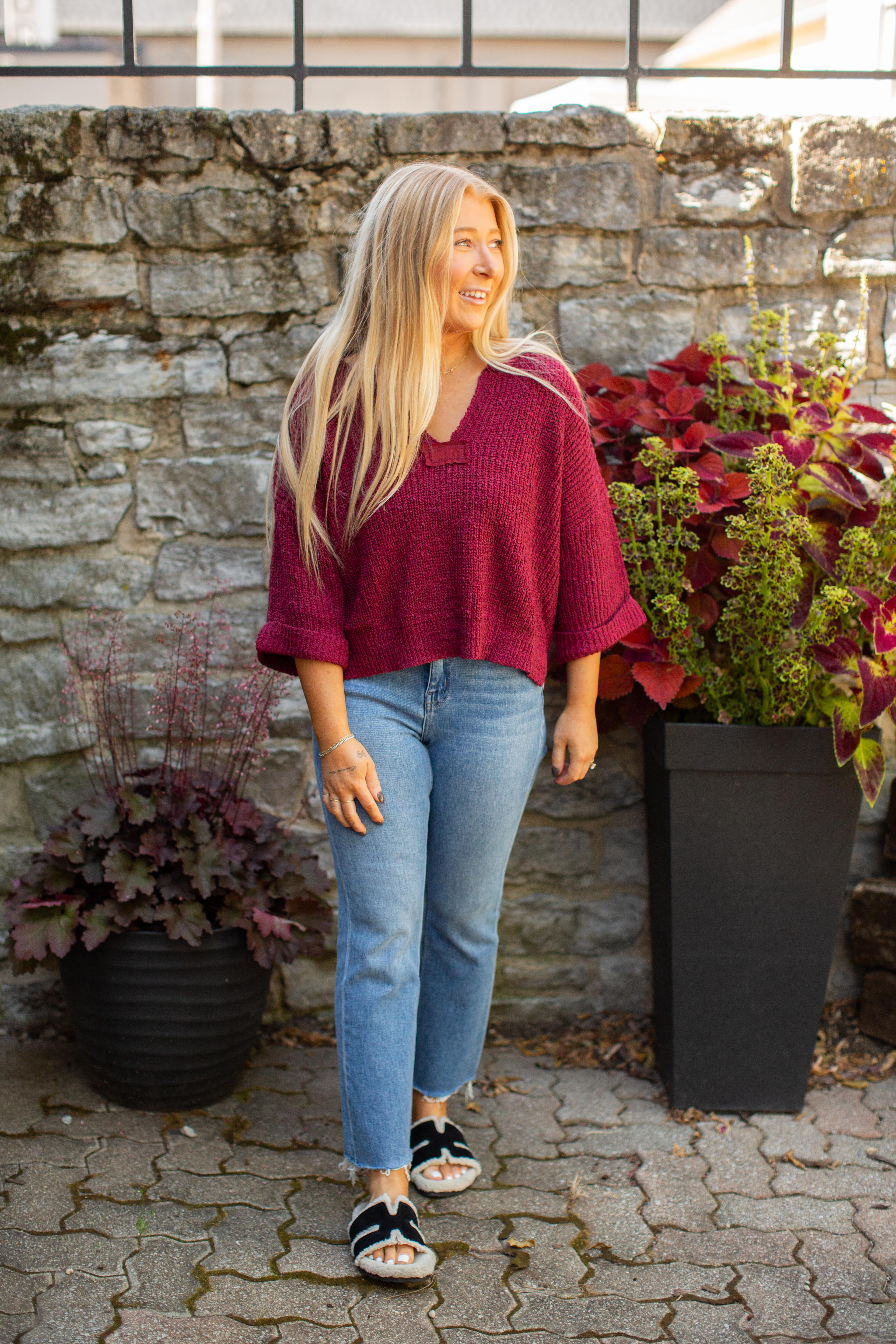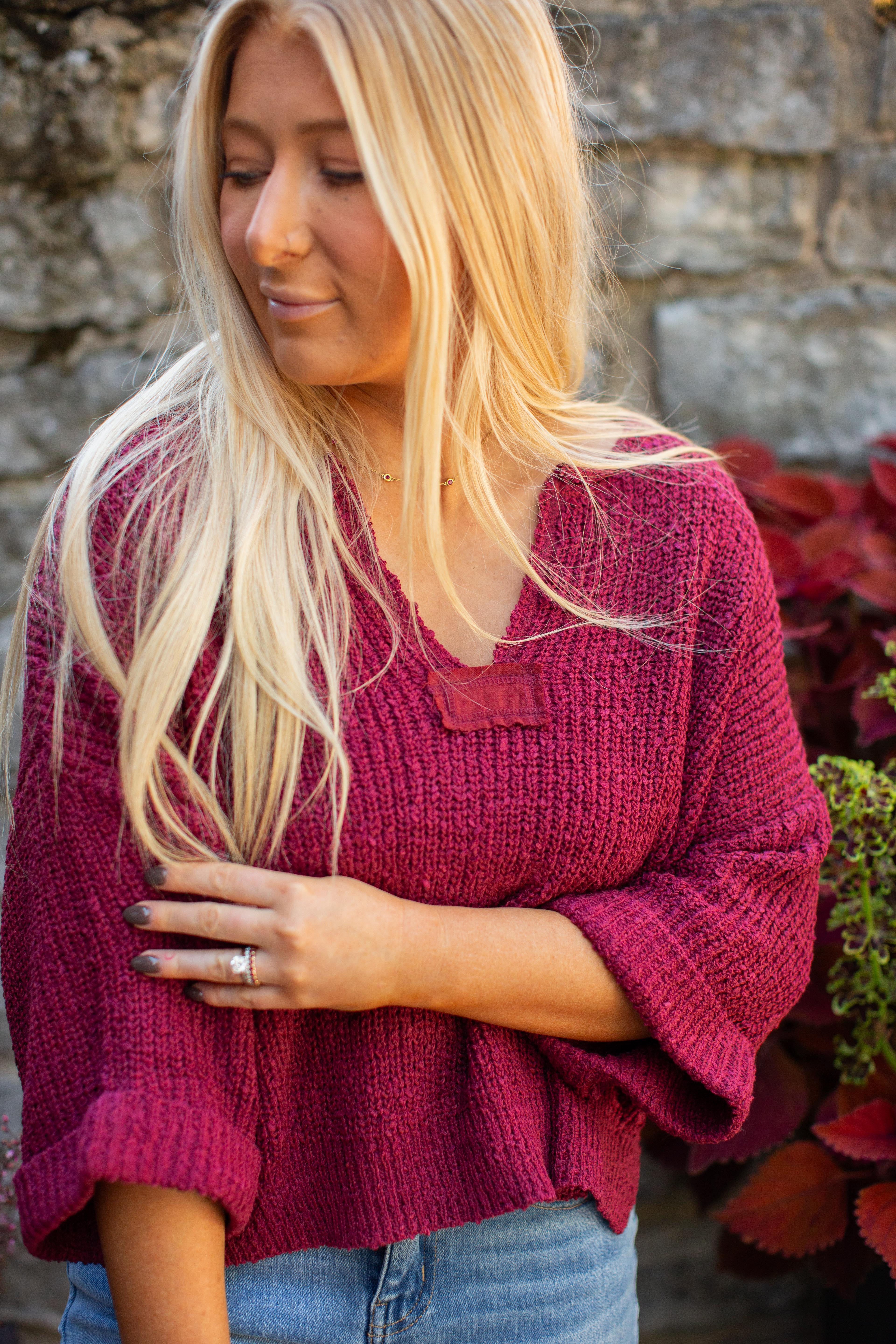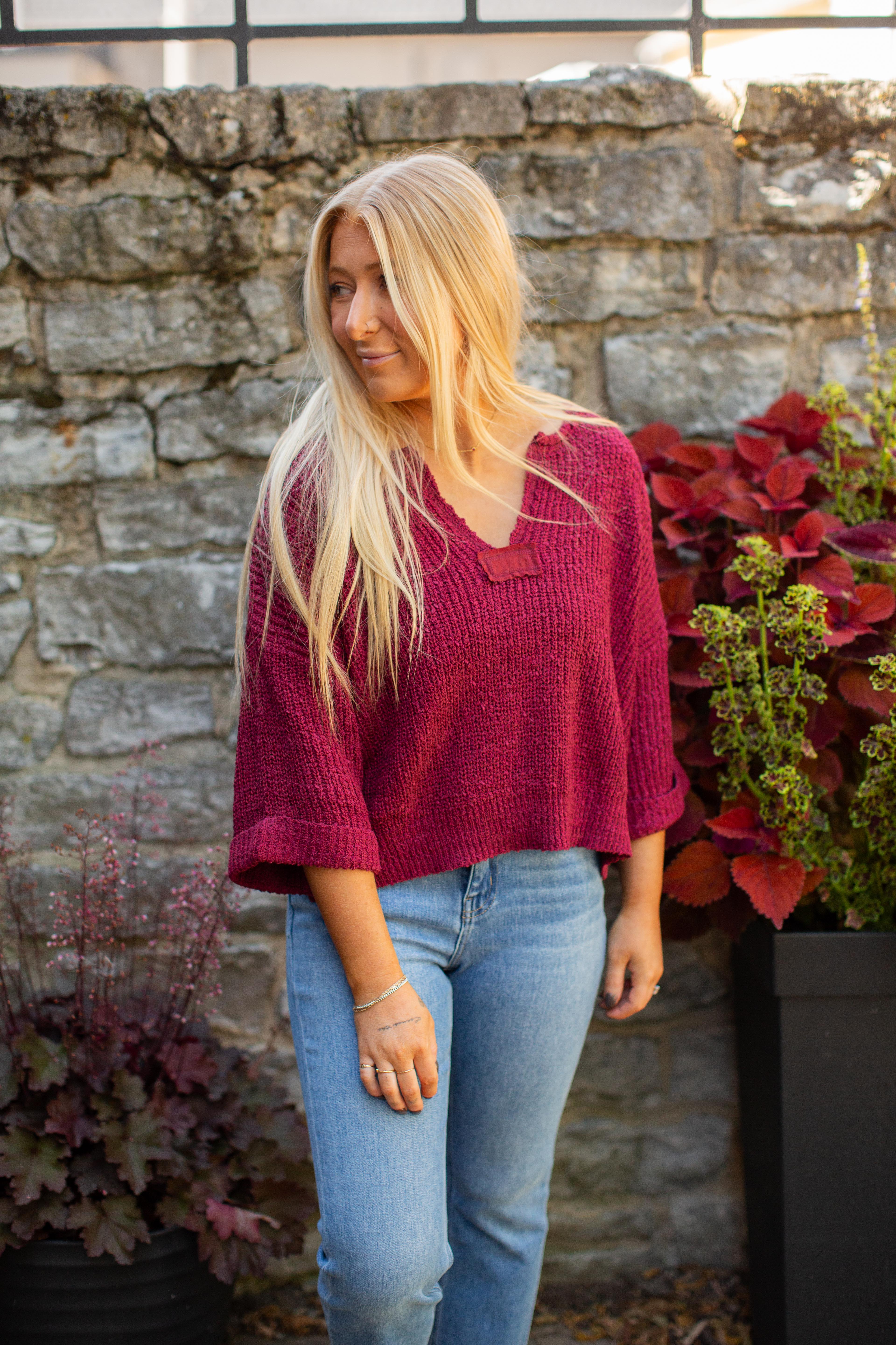 Textured long sleeve sweater top featuring a notched neckline with a front patch detail, rolled 3/4 sleeves, two side slits and is a slightly cropped but boxy body.