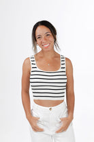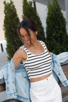 This playful tank top features a cozy knit with charming stripes, perfect for adding a fun twist to your casual wardrobe.