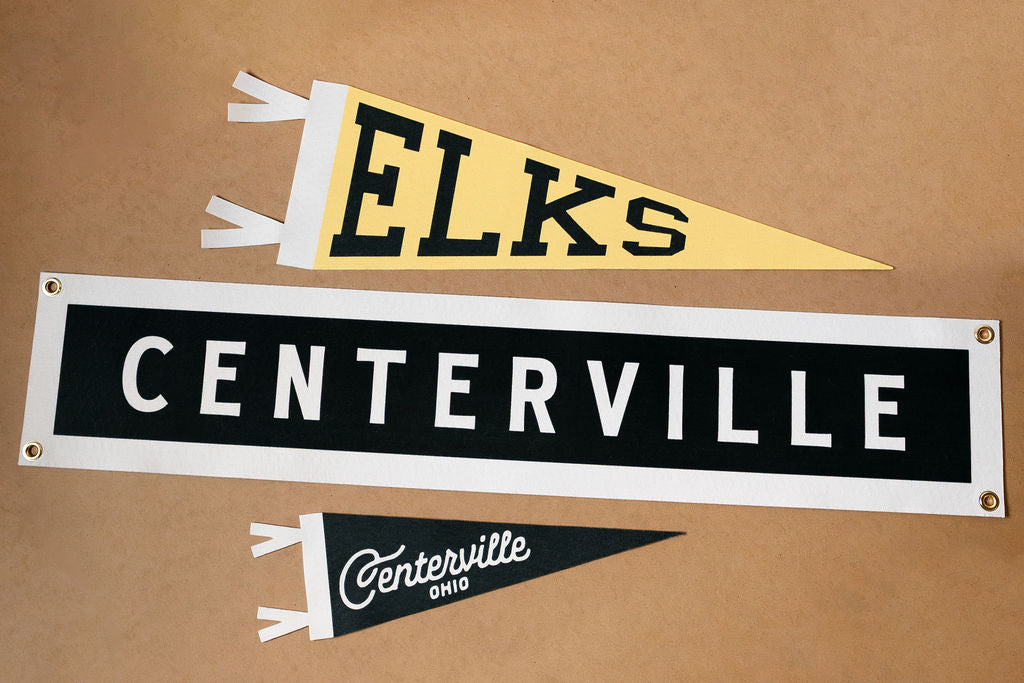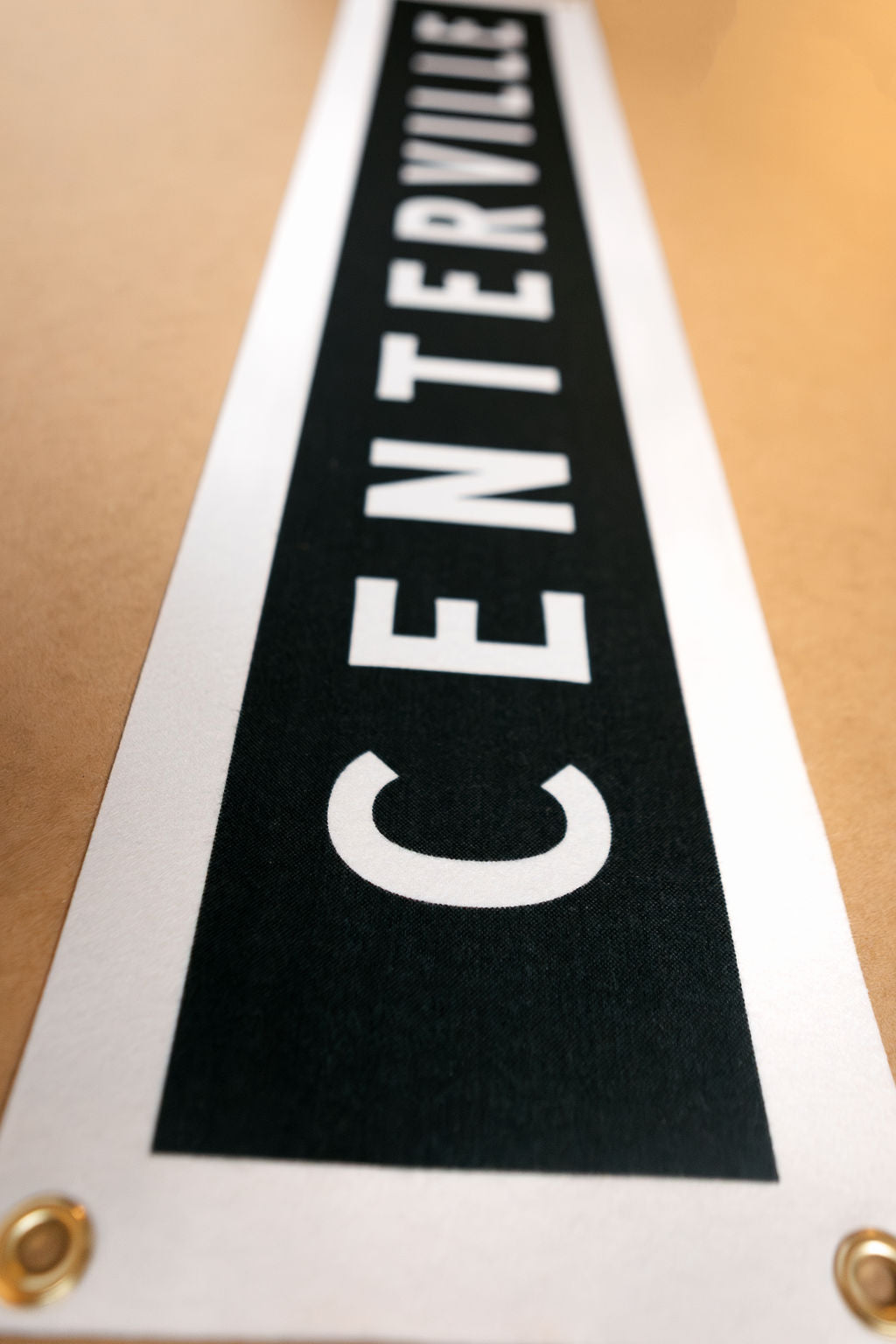 Centerville's very own vintage-style felt banner! Great for that Centerville pride, with a one-of-a-kind flag. Make an impression with a unique gift for friends or yourself. Available in black|cream, with a vintage, weathered aesthetic.