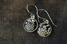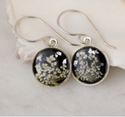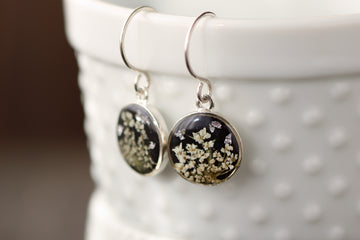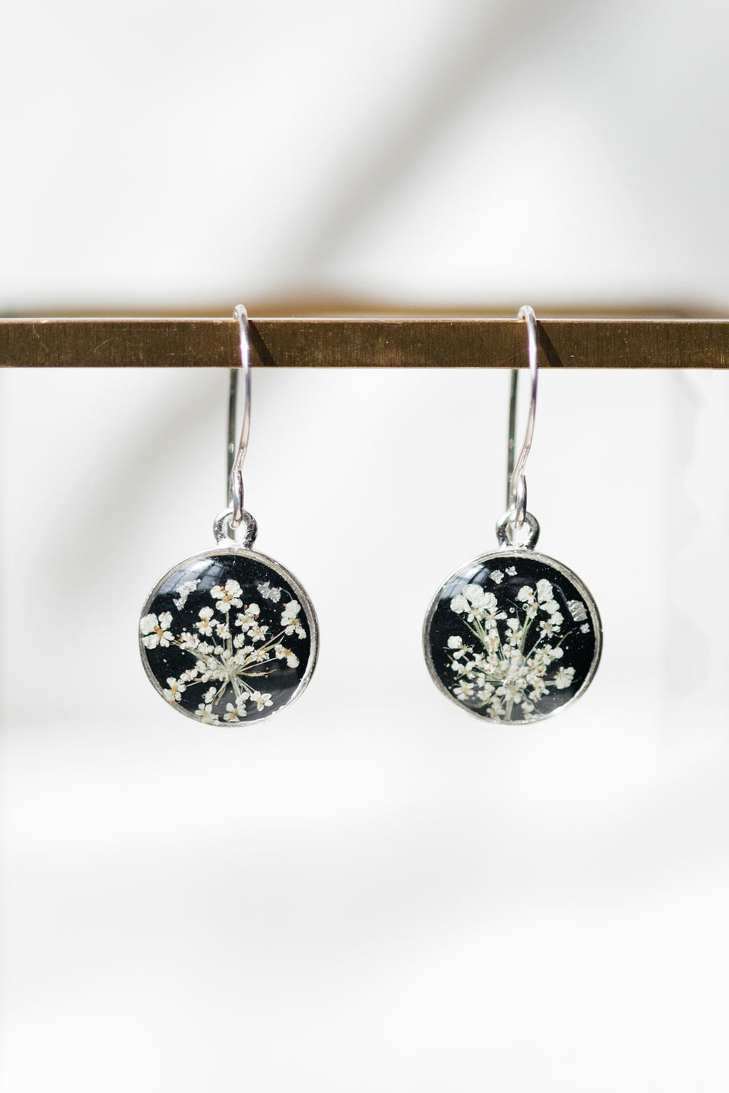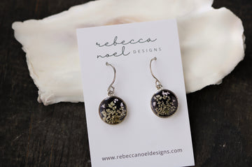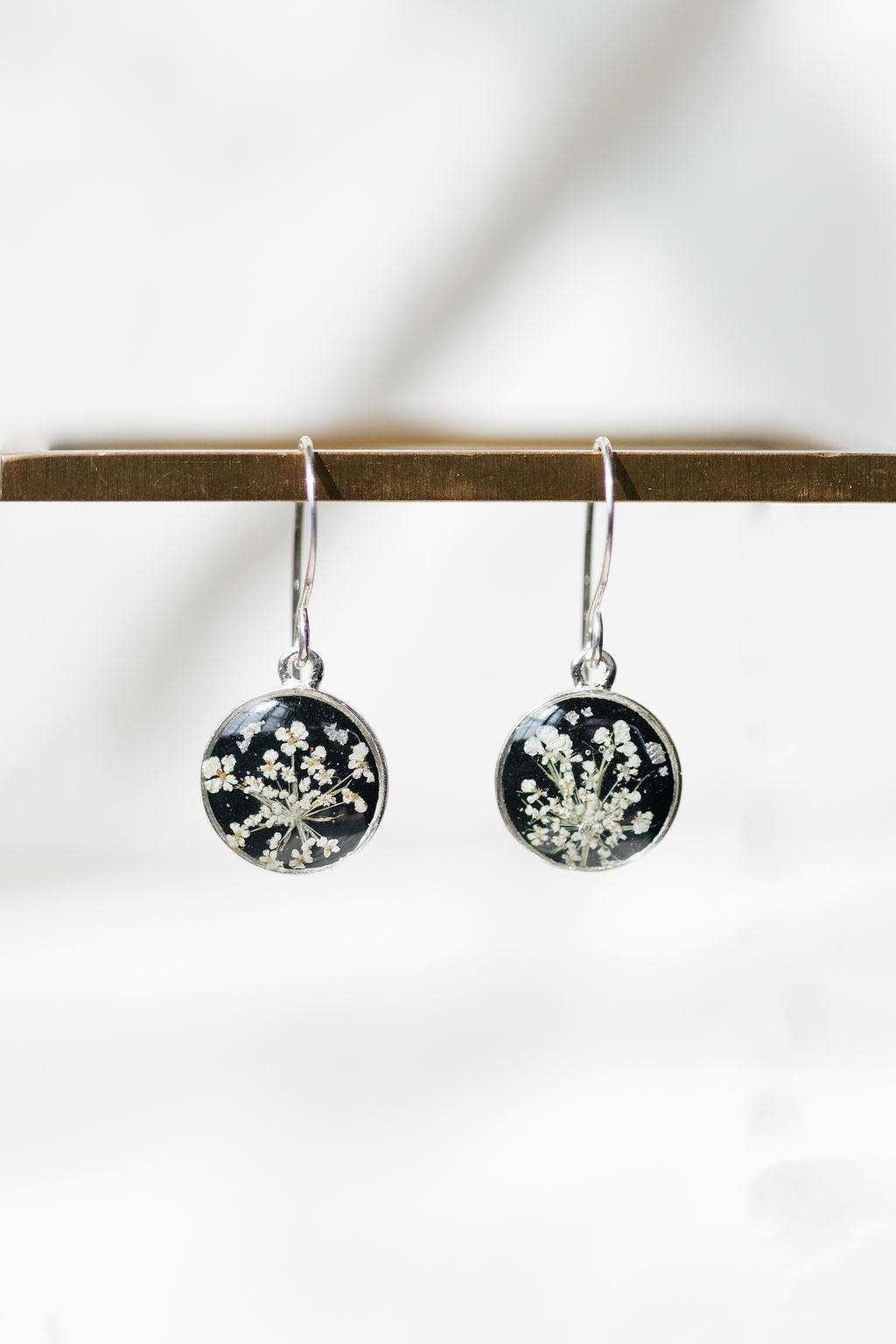 Stunning in contrast, dainty and so sweet, Ohio foraged Queen Anne’s Lace flowers are pressed and then set in black with specks of imitation silver leaf. A glossy top layer of resin completes the drop. Earwires are handmade from sterling silver wire. Circle measures 5/8” in diameter.