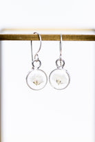 Sweet and feminine, these dainty silver circles are filled with baby's breath white florals. Bits of glass glitter add additional shine. They are filled with glossy resin and hang on handmade sterling silver ear wires.
