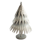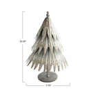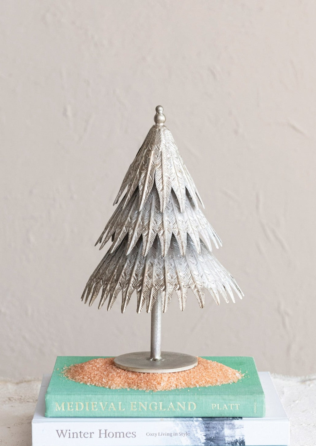 This distressed pewter embossed metal tree on stand is a lovely and unique way to decorate for the holidays. It features a round metal tree on a stand that has a distressed pewter finish and an embossed pattern, creating a cozy and rustic effect. It has a natural and elegant look that can suit any festive theme, from traditional to modern. This is ideal for displaying on a table, mantel, shelf, or window sill, where it can add a touch of warmth and charm to the space. It can also stand on its own or be paired with other trees or ornaments, making it a versatile and customizable option. It's made of metal that is durable, sturdy, and easy to clean, making it a convenient and reusable option. It measures 7.75 inches in diameter and 12.25 inches in height, making it a graceful and noticeable centerpiece.