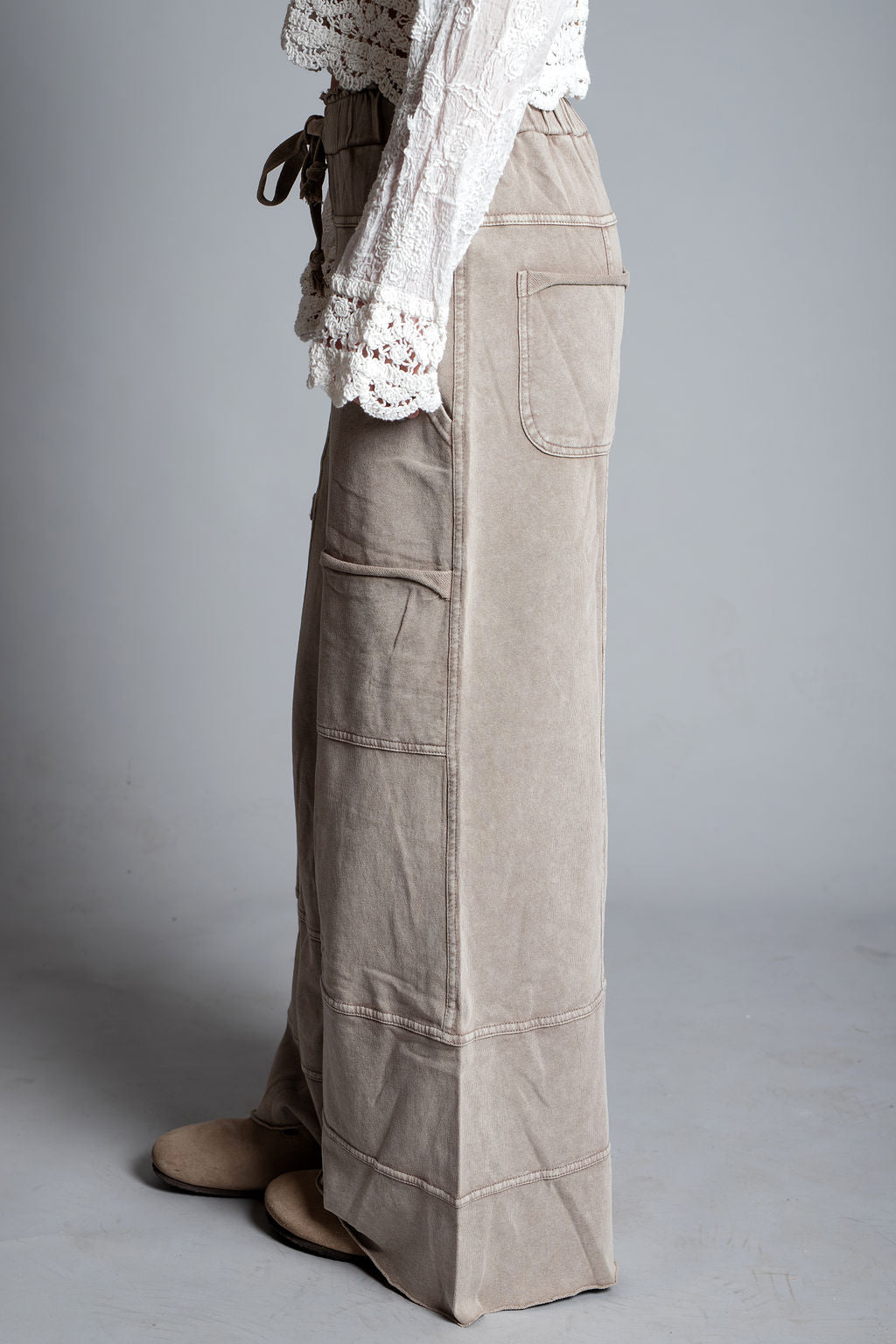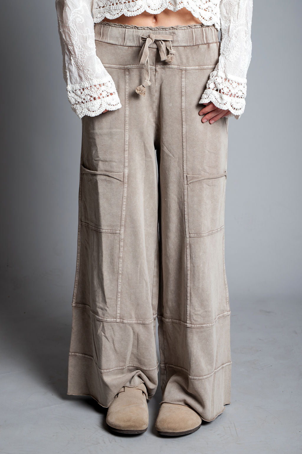 These cozy terry knit pants combine comfort and style with a mineral-washed taupe finish. Featuring a relaxed wide-leg silhouette, drawstring elastic waistband, and practical pocket placement, they're the perfect everyday staple. The raw hemline and reverse seam details add trendy boho flair to this versatile piece.