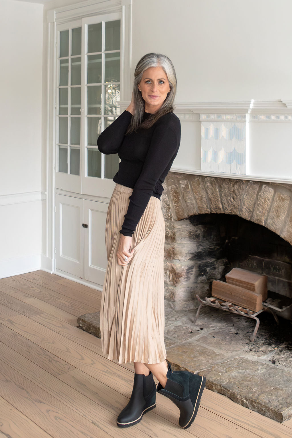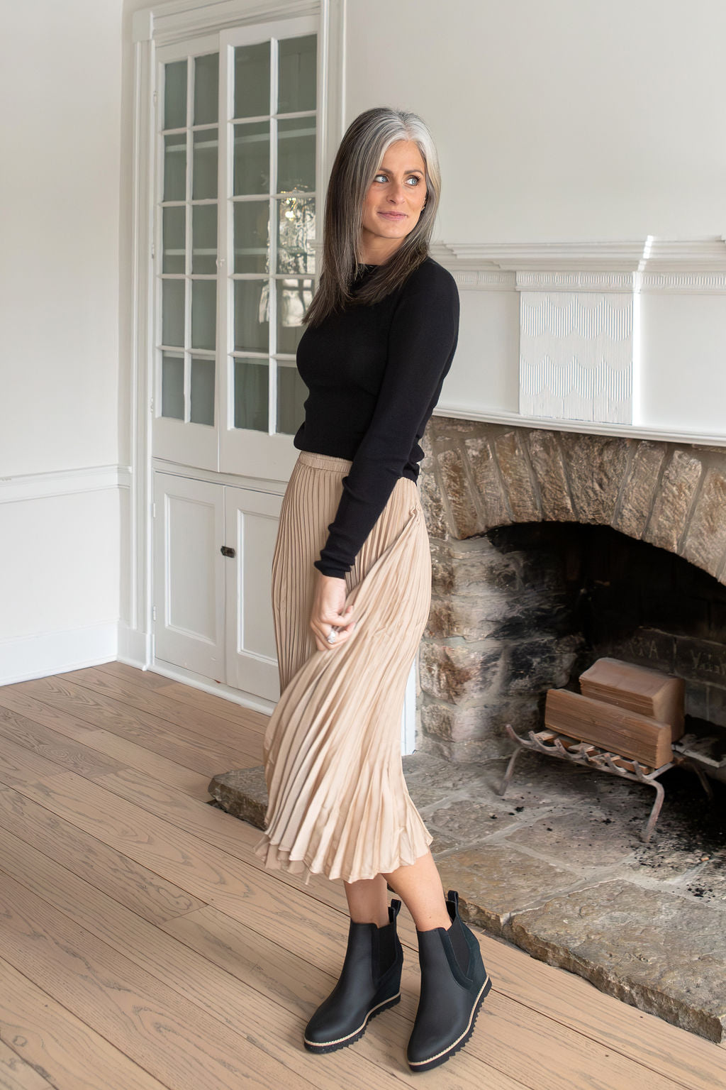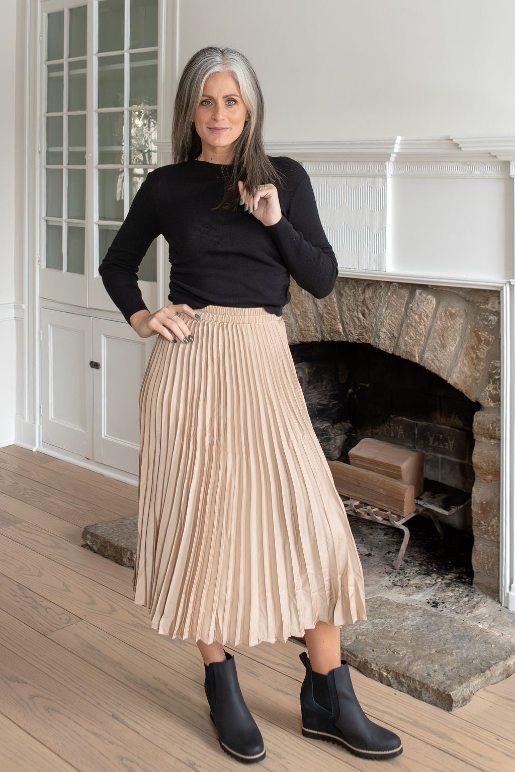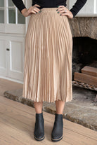 Solid midi skirt featuring accordion pleating throughout, an elastic waistband, a lightweight flowy material and is an A-line silhouette.