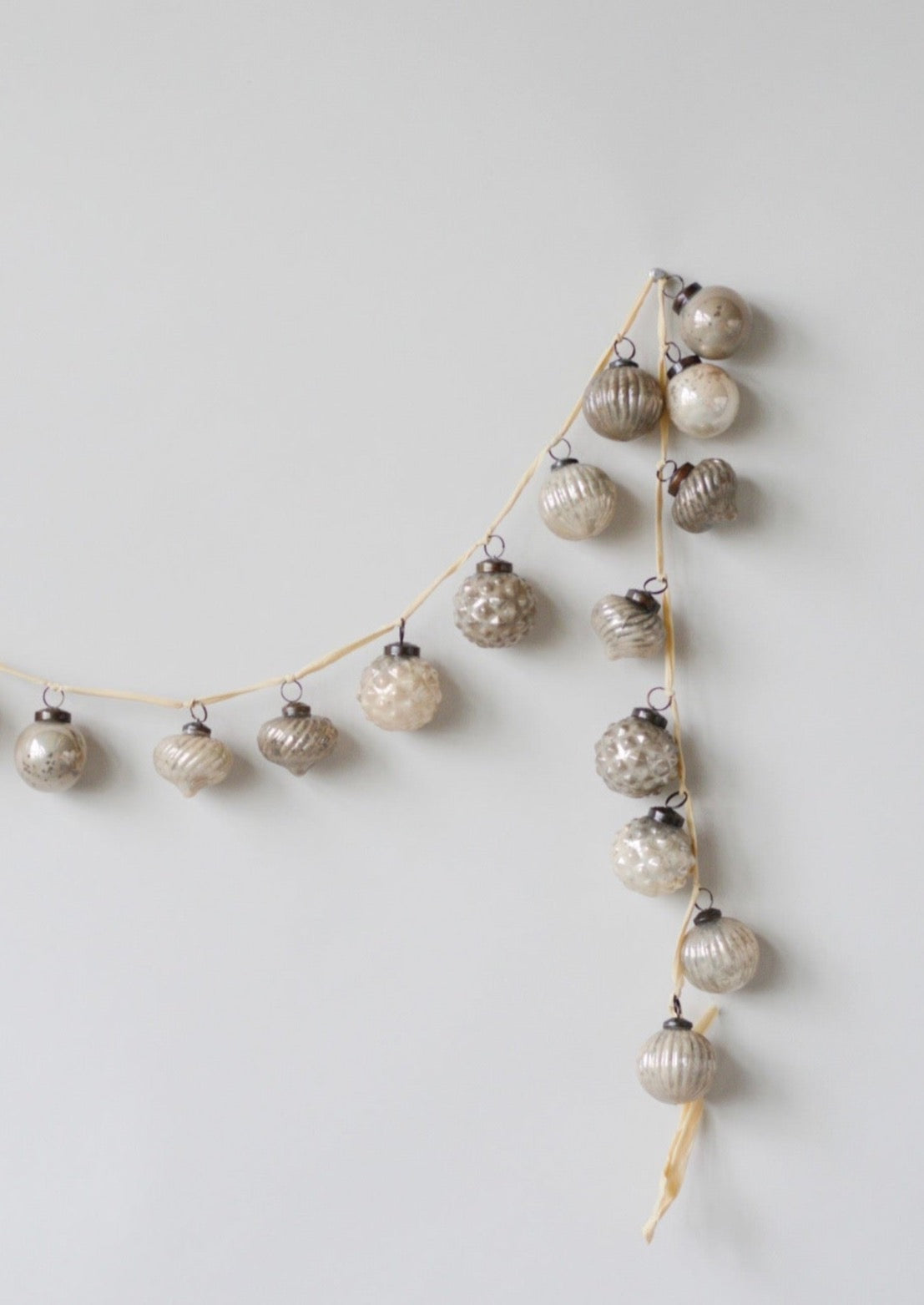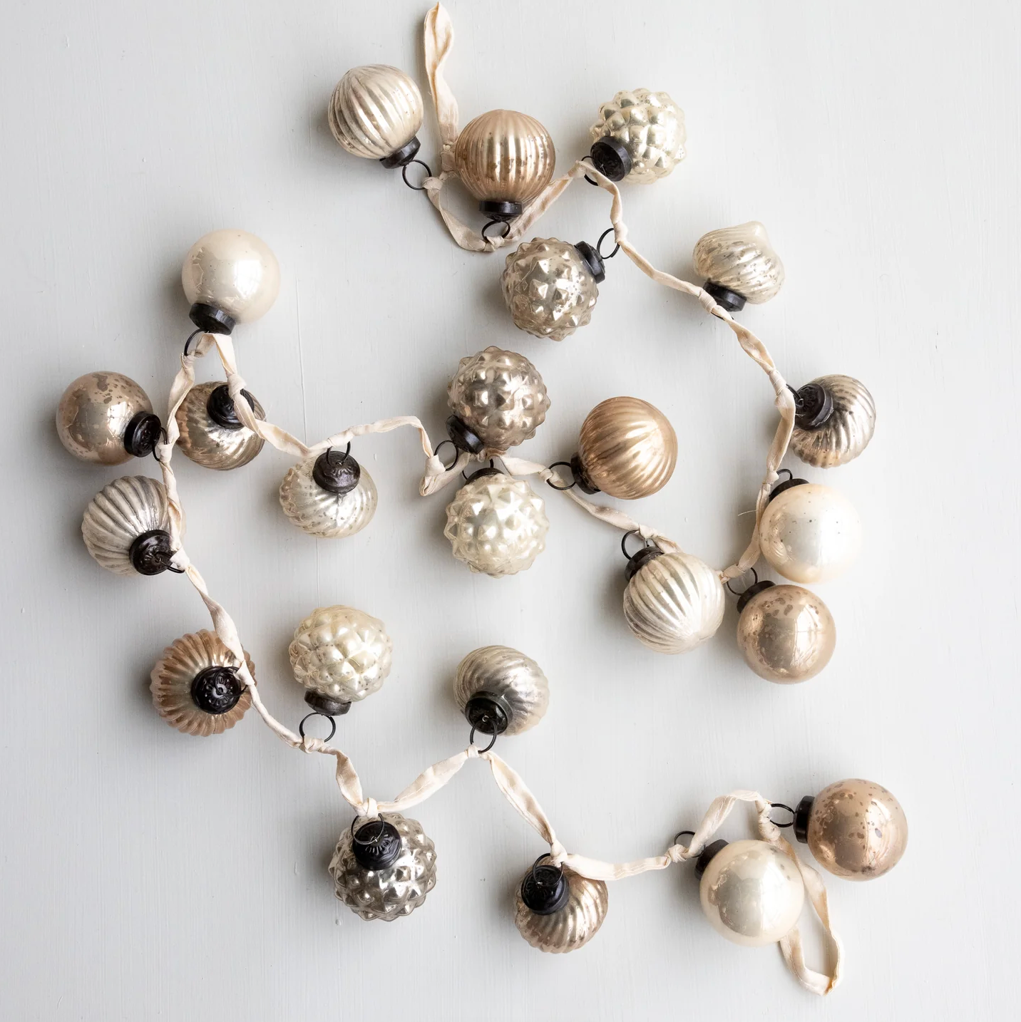 Enjoy the various designs of these glass ornaments. They are attached to a fabric string and create an antique garland to be envied by all. Lay it on a surface around larger items, add to a decorative piece filled with other items, hang on a fireplace mantel or in front of a window.