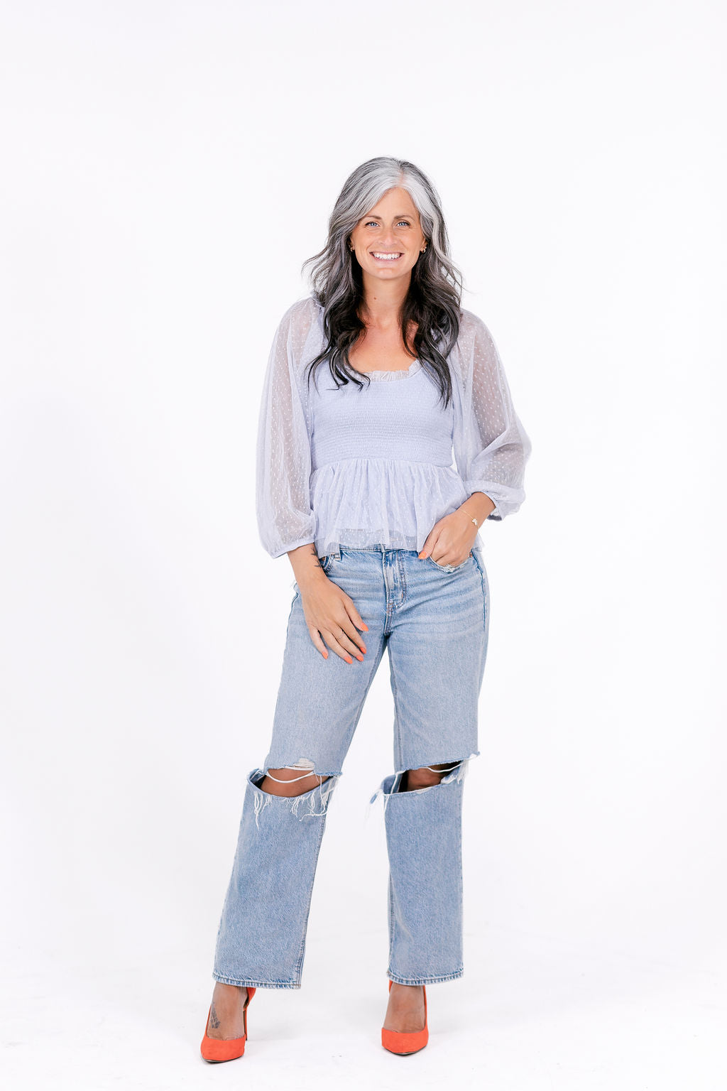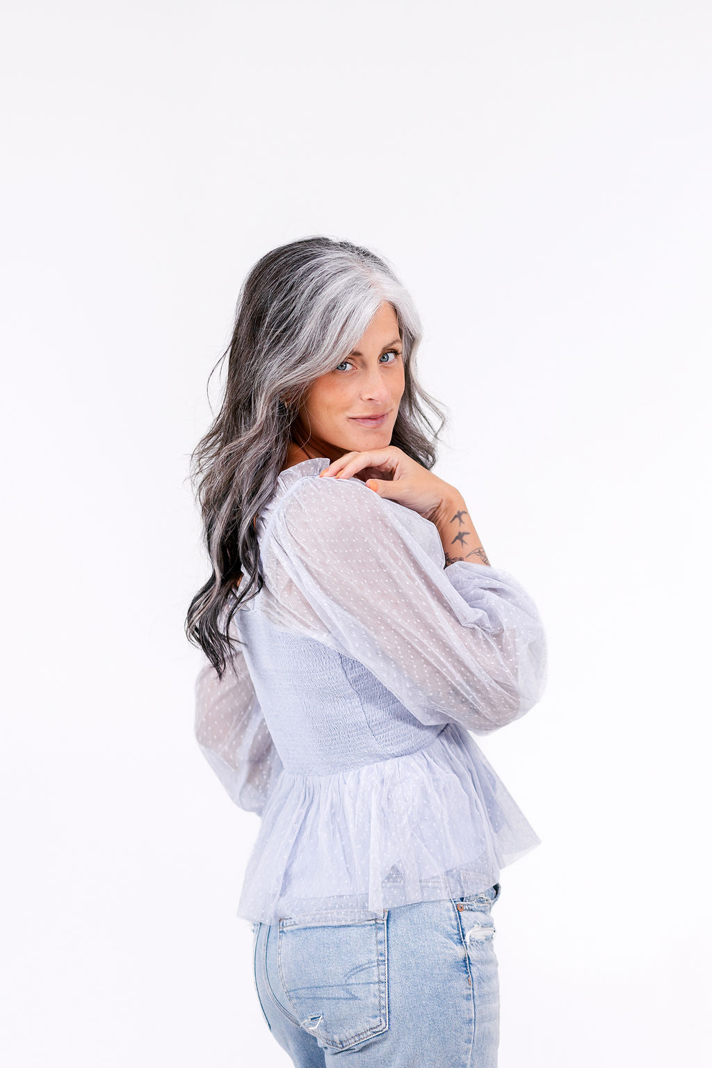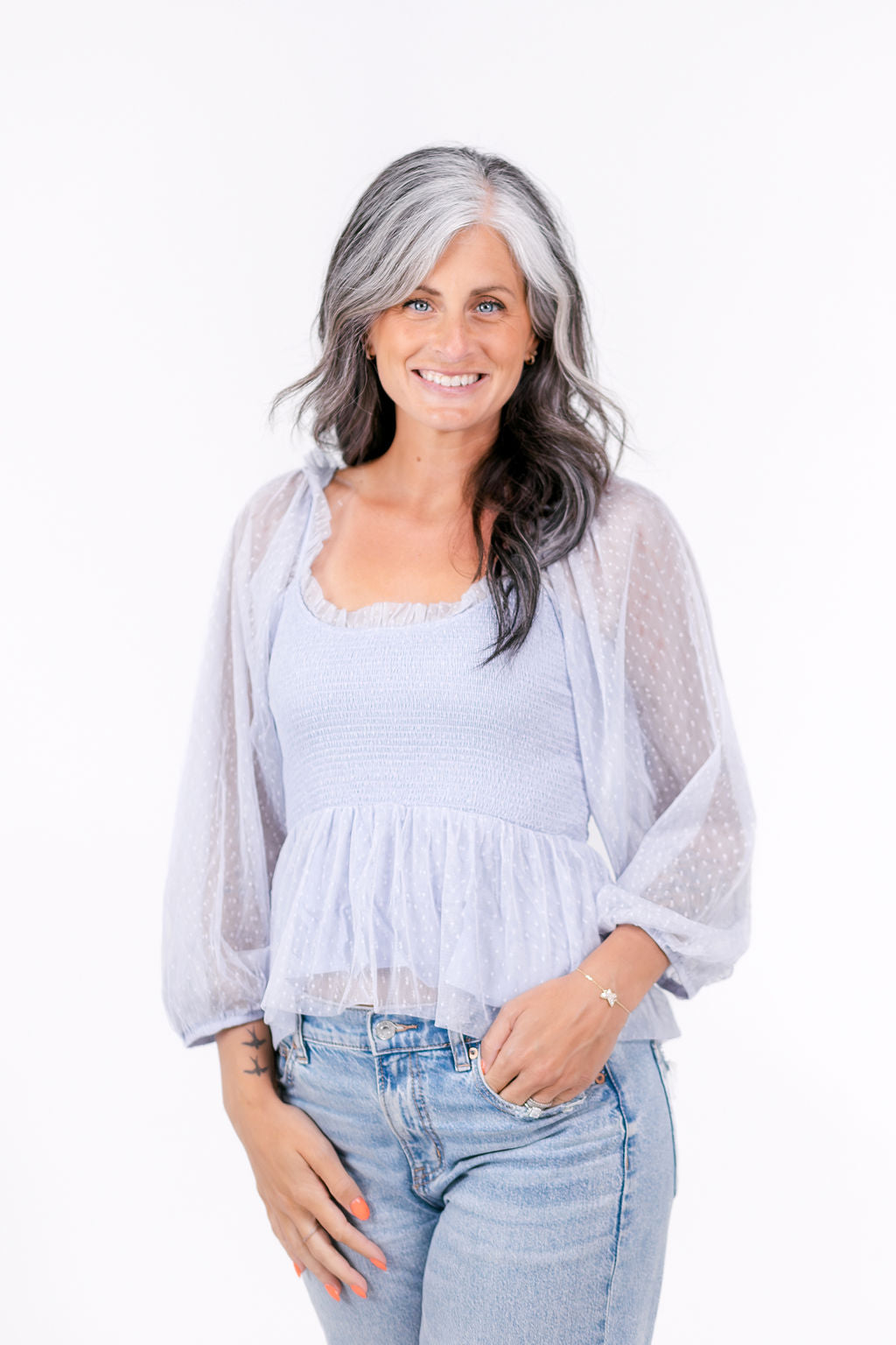 This top is perfect- with its sheer swiss dot fabric, smocked bodice, and ruffle neckline. It's lined, woven, and lightweight, adding just the right amount of semi-sheer flair to any outfit.