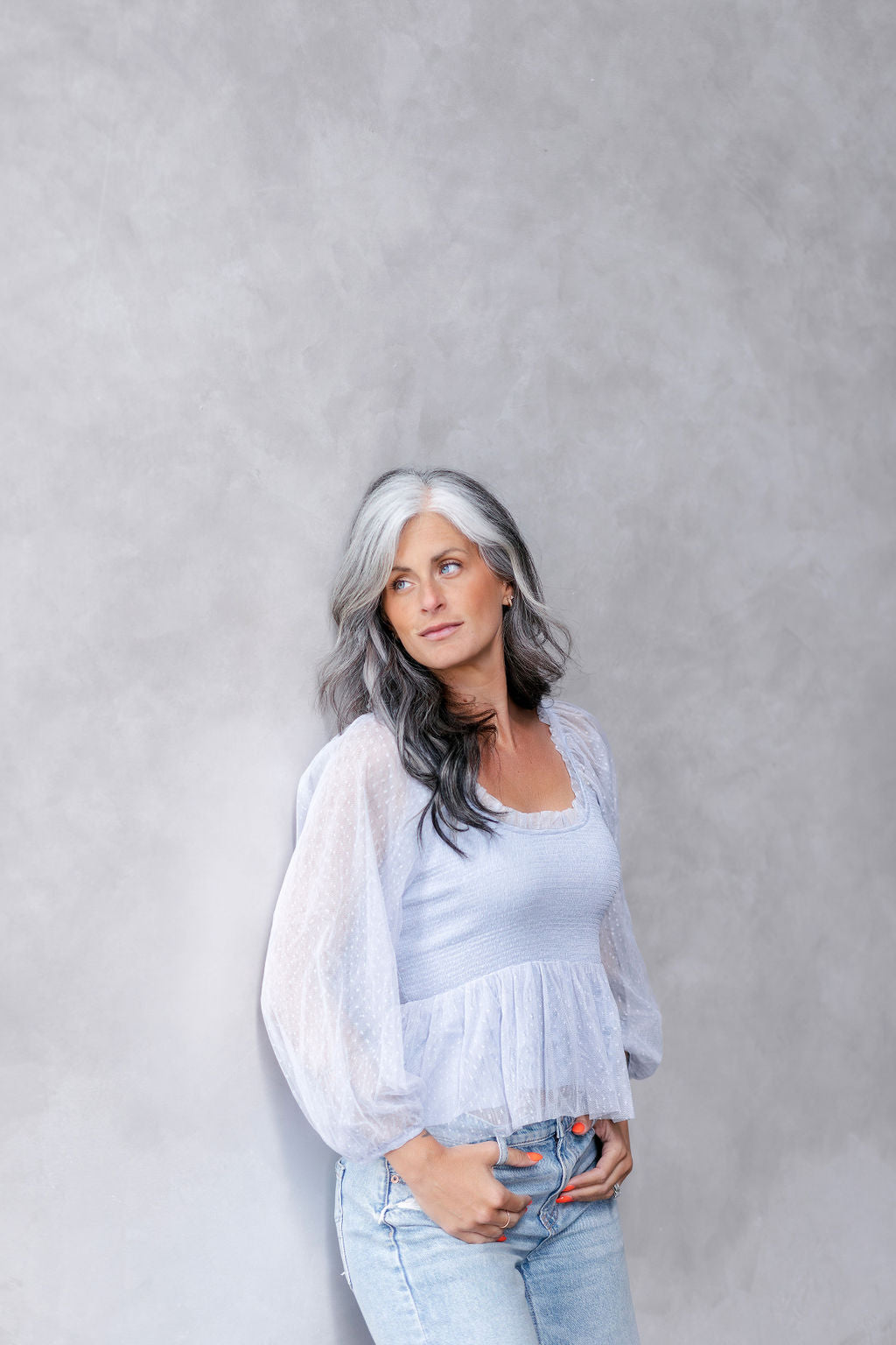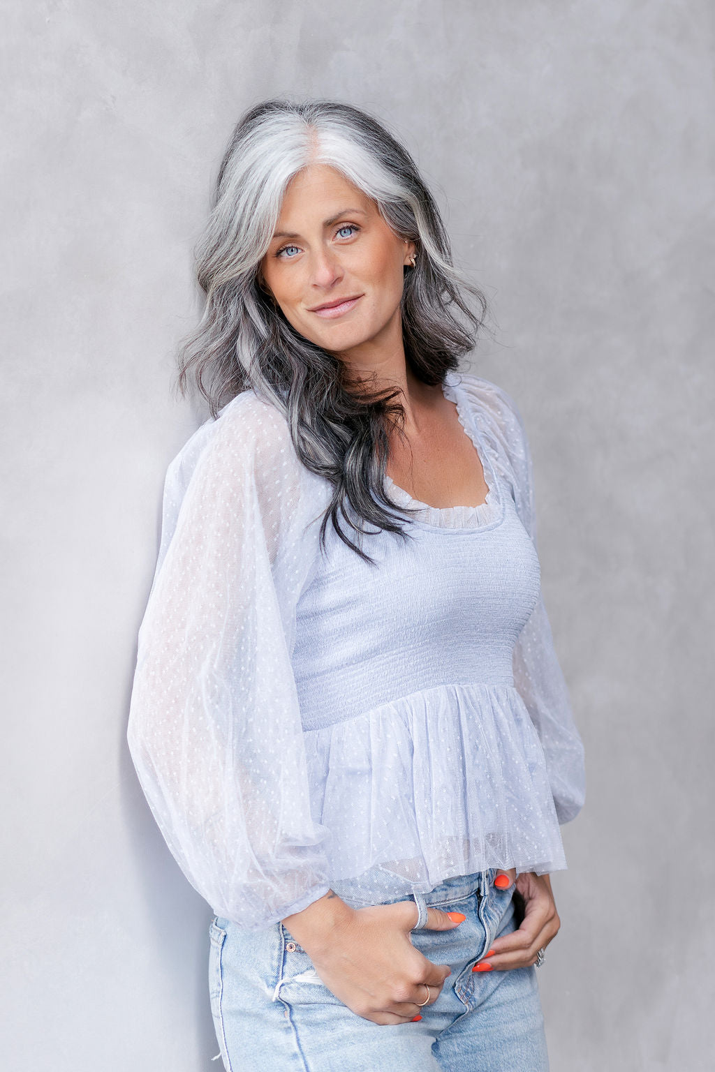 In a Cinch Dusty Blue Dot Peplum Top