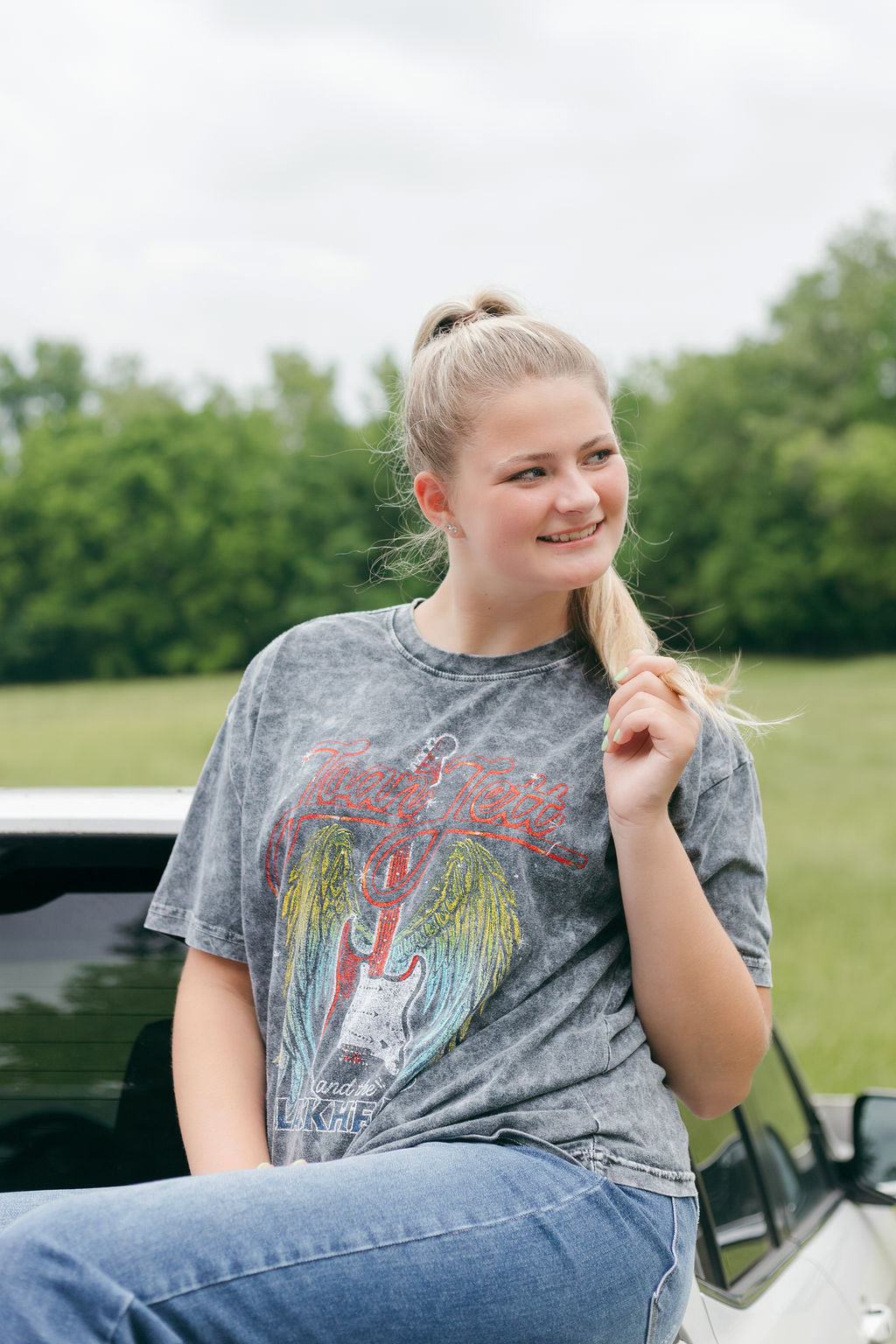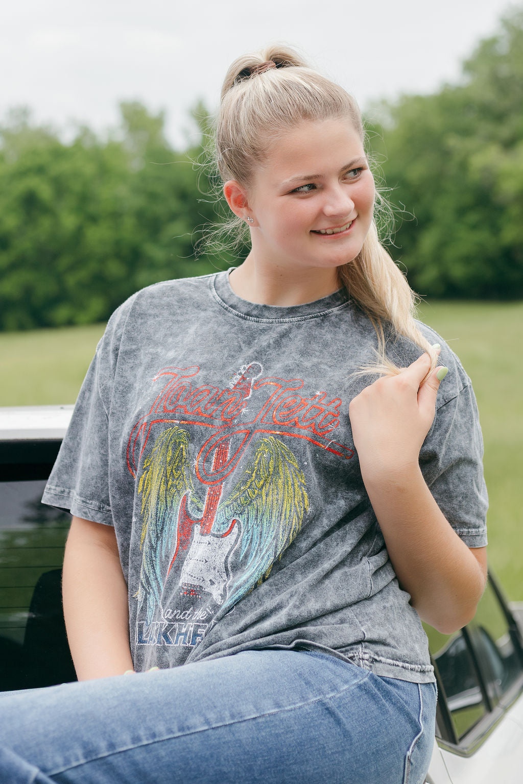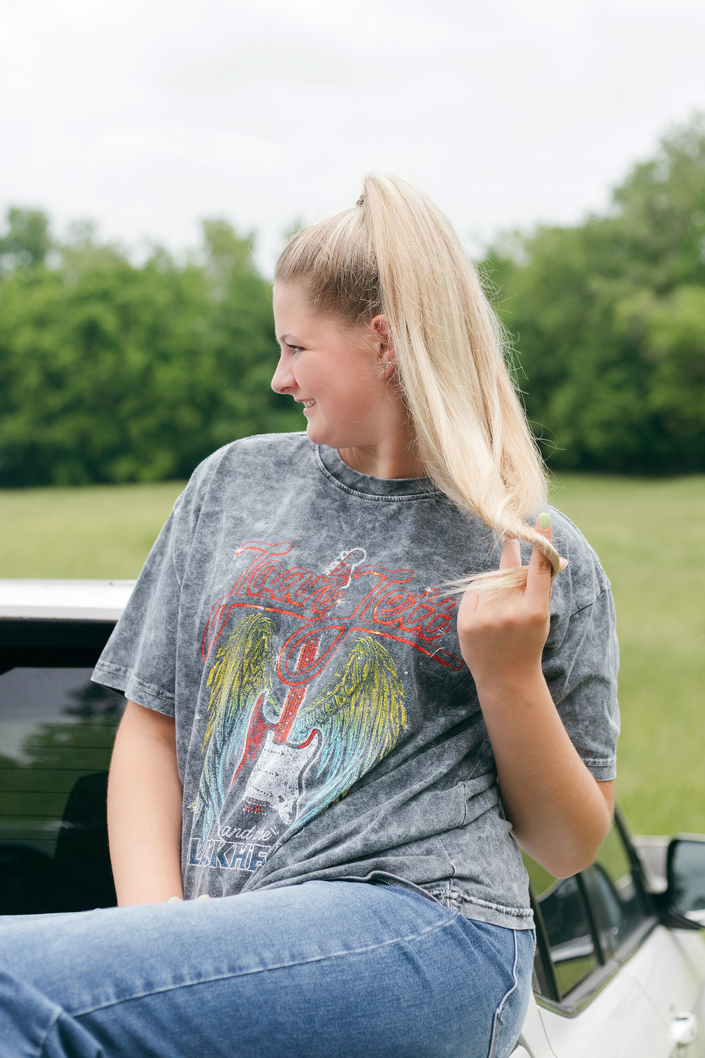 This Joan Jett Wings Mineral Black Washed Tee comes crafted from 100% cotton for a comfortable and soft feel. With its relaxed feel, this graphic will become a staple in your every day wardrobe! It's also the perfect graphic for any summer concert!