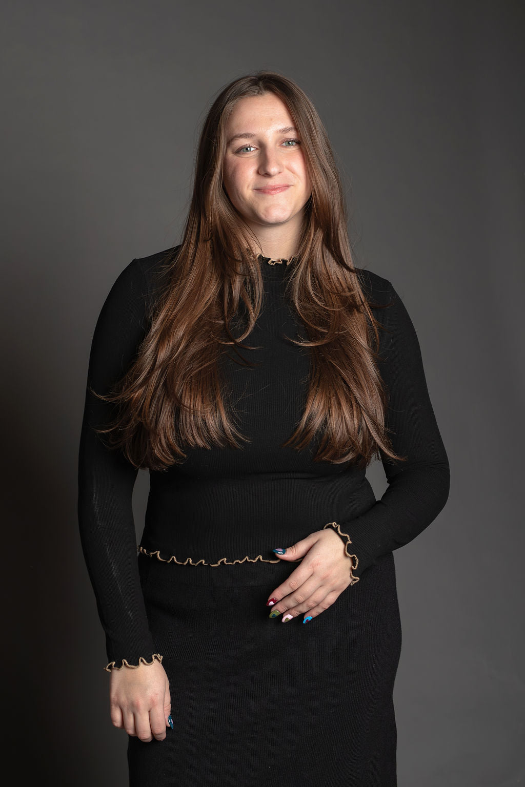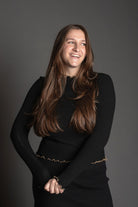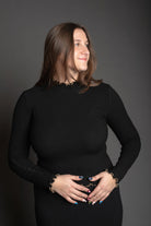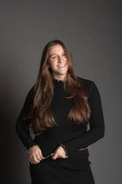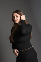 Introducing the Monica knit top from our '24 S/S Basics collection—your new go-to essential piece. This solid ribbed knit long sleeve top features a snug fit, mock neck, and distinctive lettuce trim detail along the neckline, sleeves, and hem. The soft, ribbed fabric and refined details make it perfect for layering or wearing solo with sweatpants or a denim mini skirt.