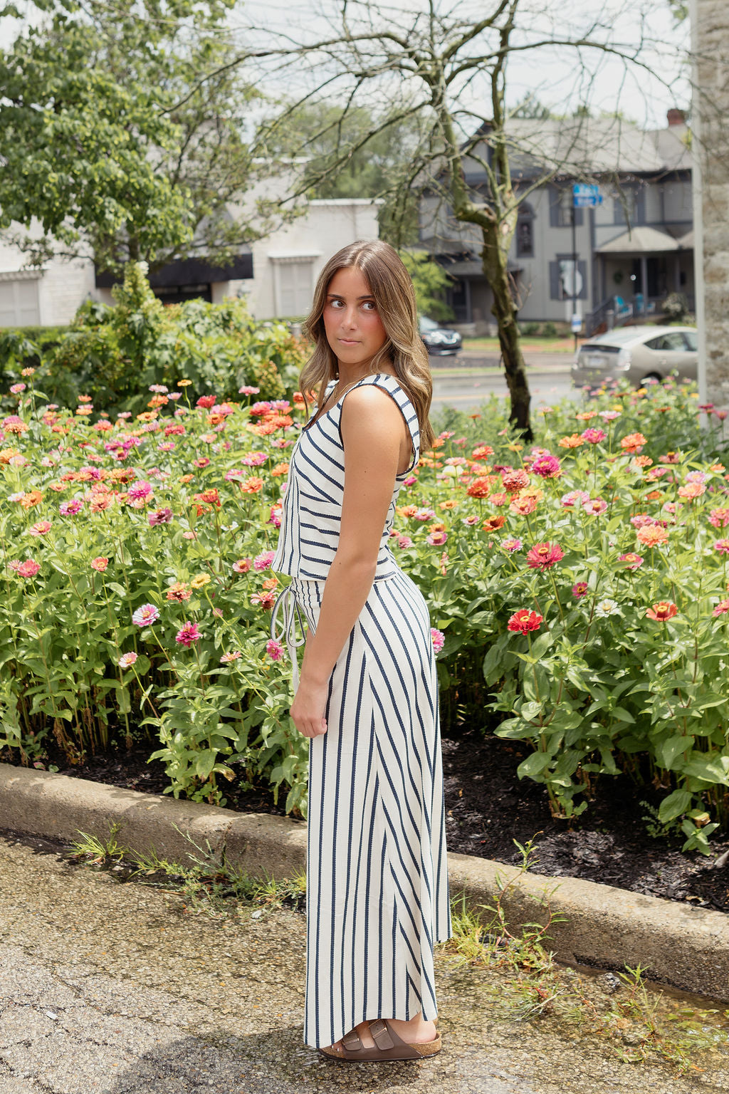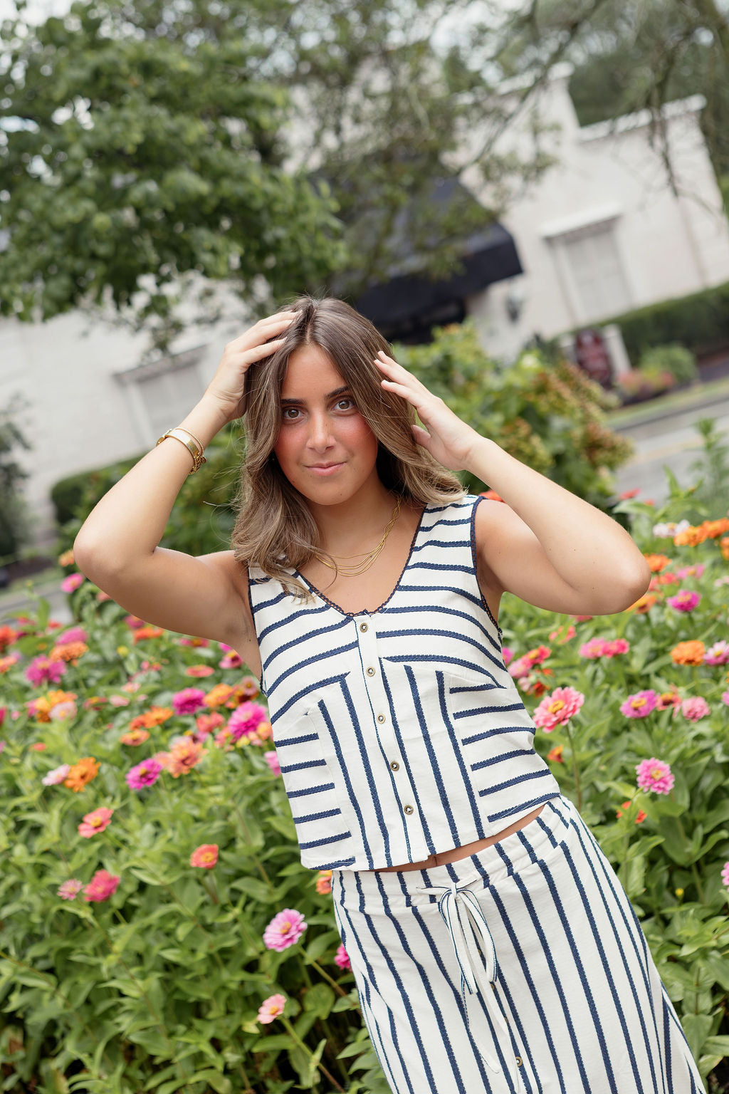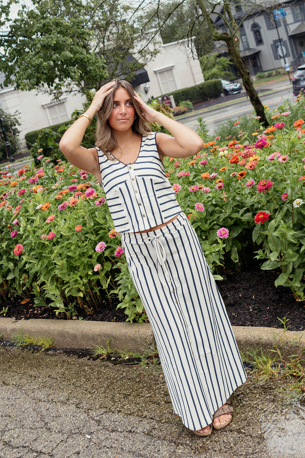 TWO piece set! Classic stripes meet a playful vibe with this linen blend navy striped set, making the two pieces perfect for mixing and matching. The button-front detail and drawstring skirt will be two of your new favorite pieces - together or separately!