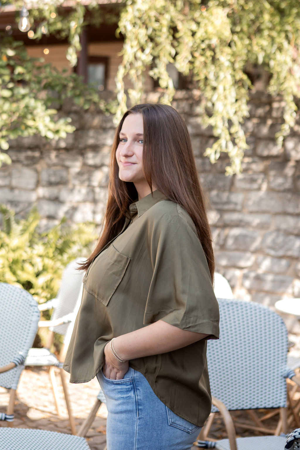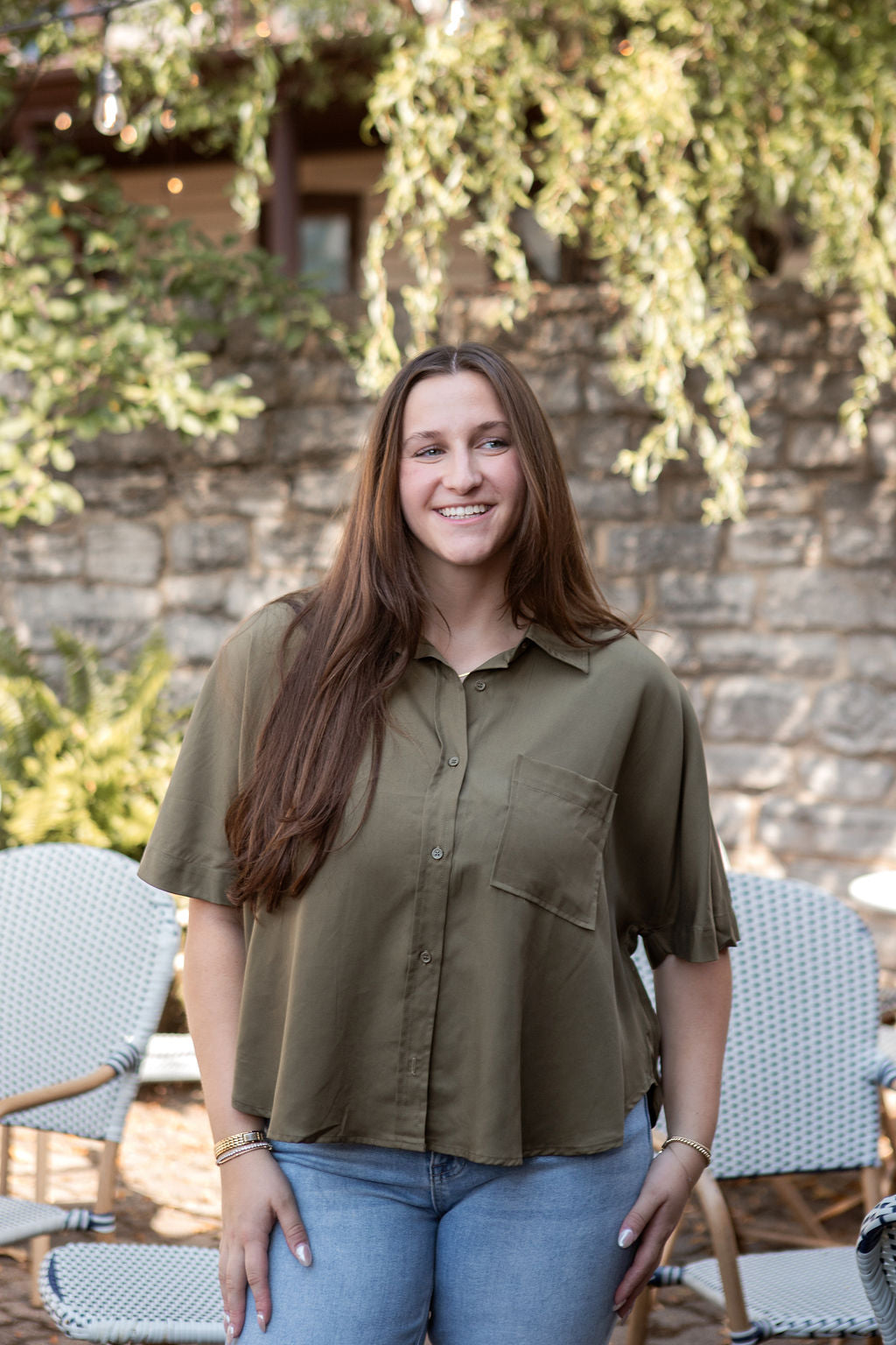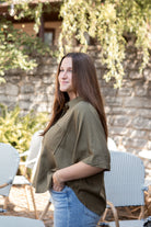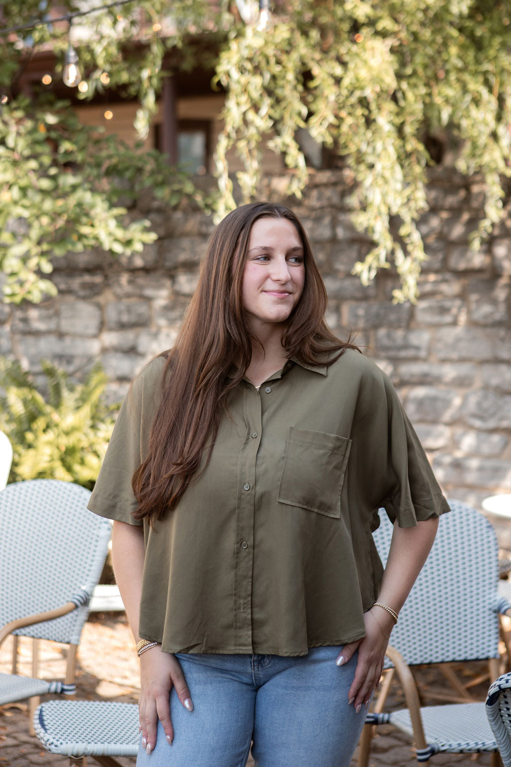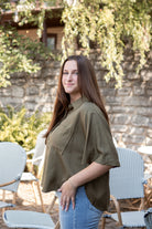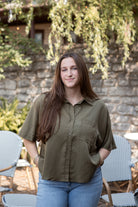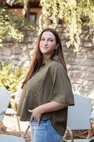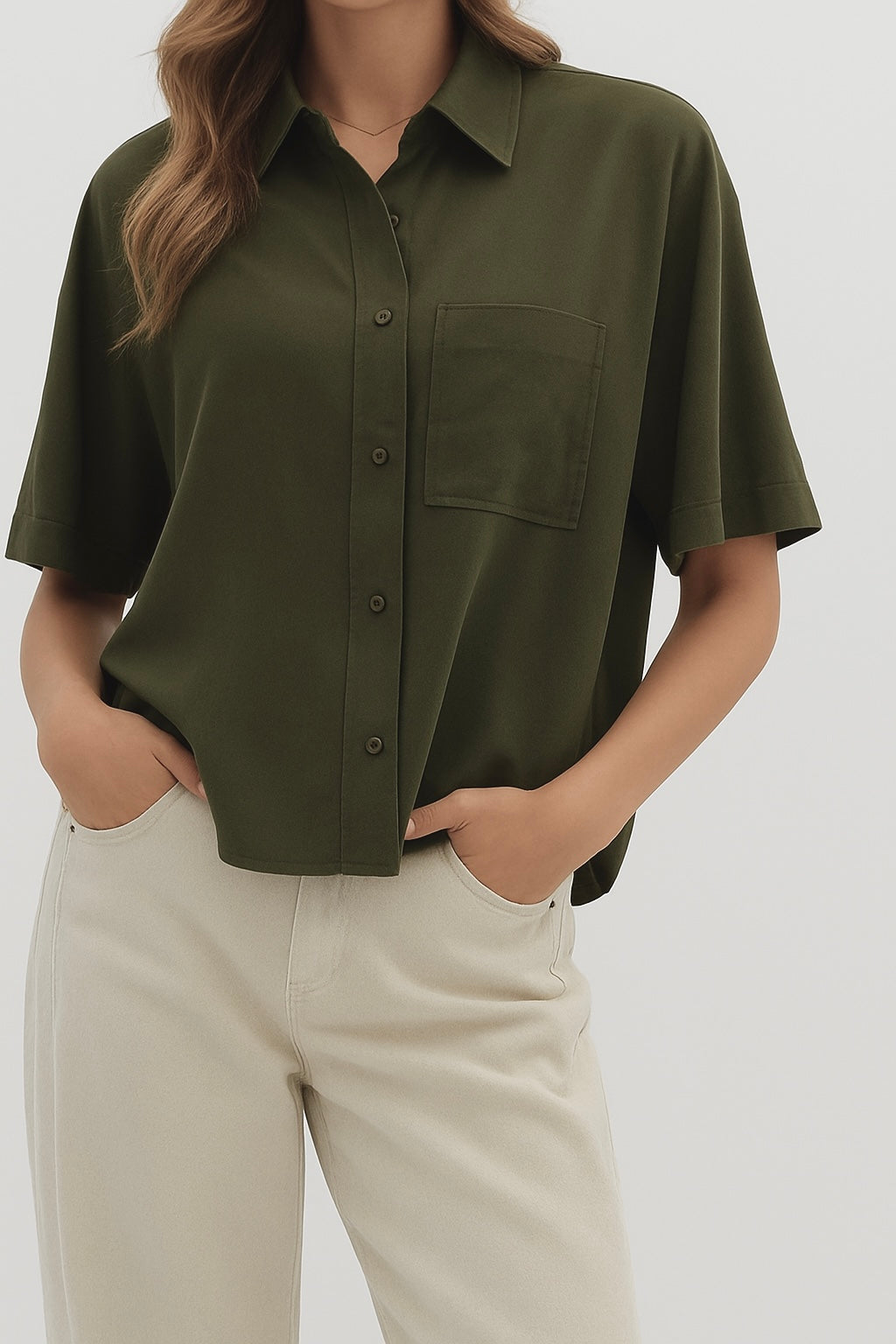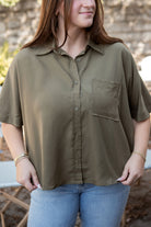 Solid short sleeve button-front top featuring relaxed drop shoulder design and chest patch pocket. Back yoke with pleat. Unlined. Woven. Non-sheer. Lightweight.