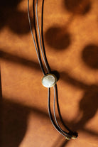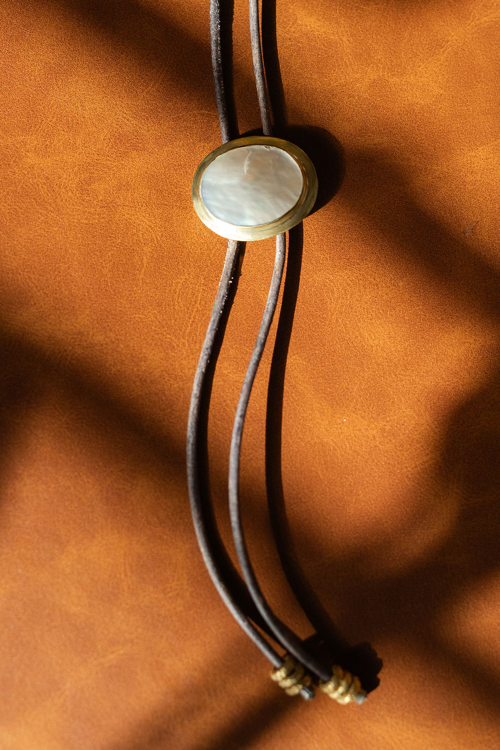 This striking bolo tie features an oval brass pendant with luminous mother of pearl inlay, creating a timeless Western aesthetic. The adjustable leather cord slides smoothly for a custom fit, making it perfect for adding character to any outfit. Whether you're dressing up for a special occasion or elevating your everyday style, this piece brings authentic Southwestern charm with understated elegance.