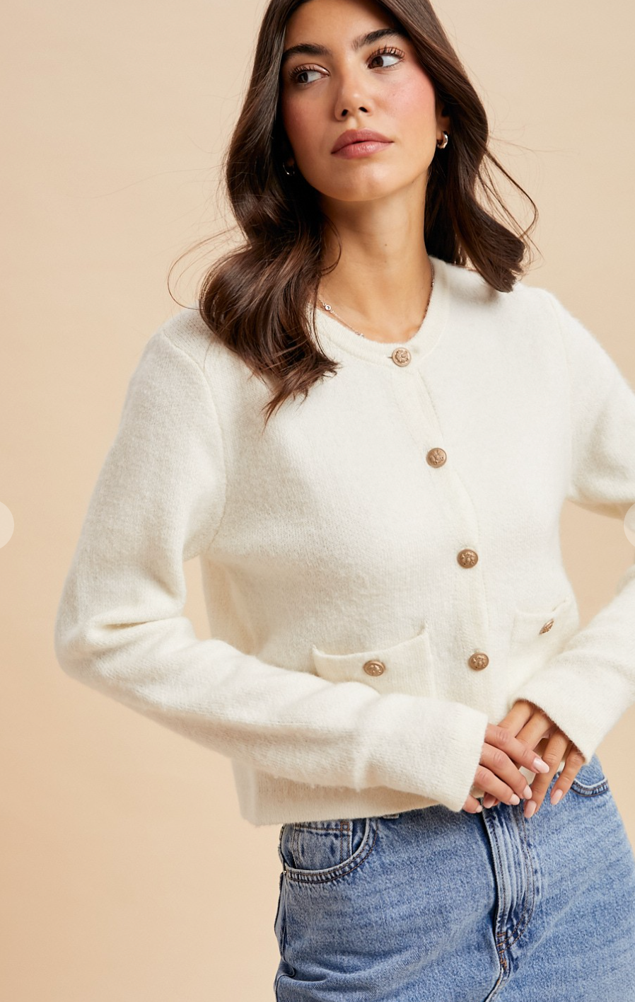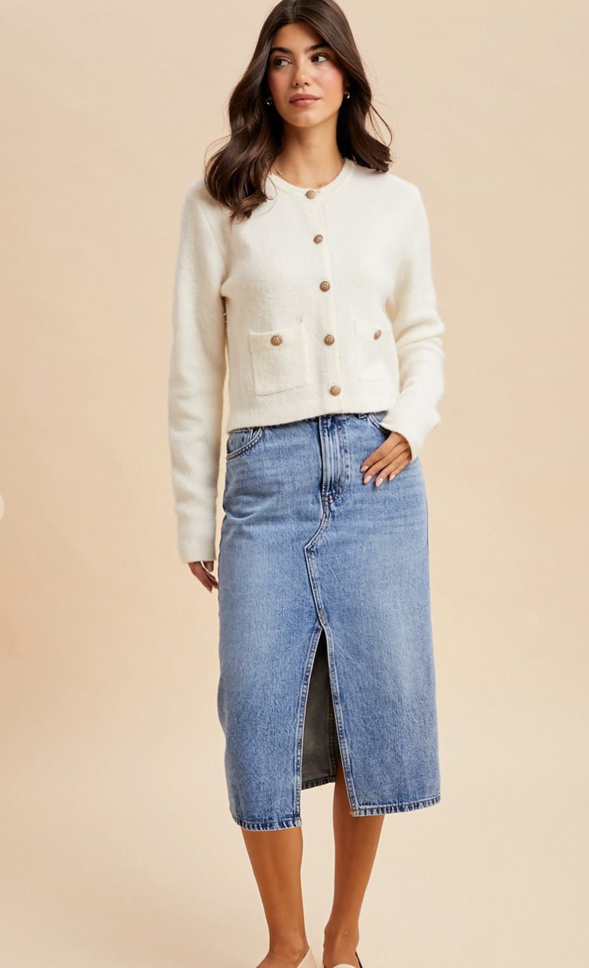 Slip into timeless elegance with the Annette Creme Cardigan, where vintage charm meets everyday comfort. This beautifully knitted piece features two generous pockets and is adorned with ornate antique gold baroque buttons that add a touch of old-world glamour. Whether you're layering over a dress or pairing with your favorite jeans, this creamy neutral cardigan is your new go-to for effortless sophistication with a playful twist.