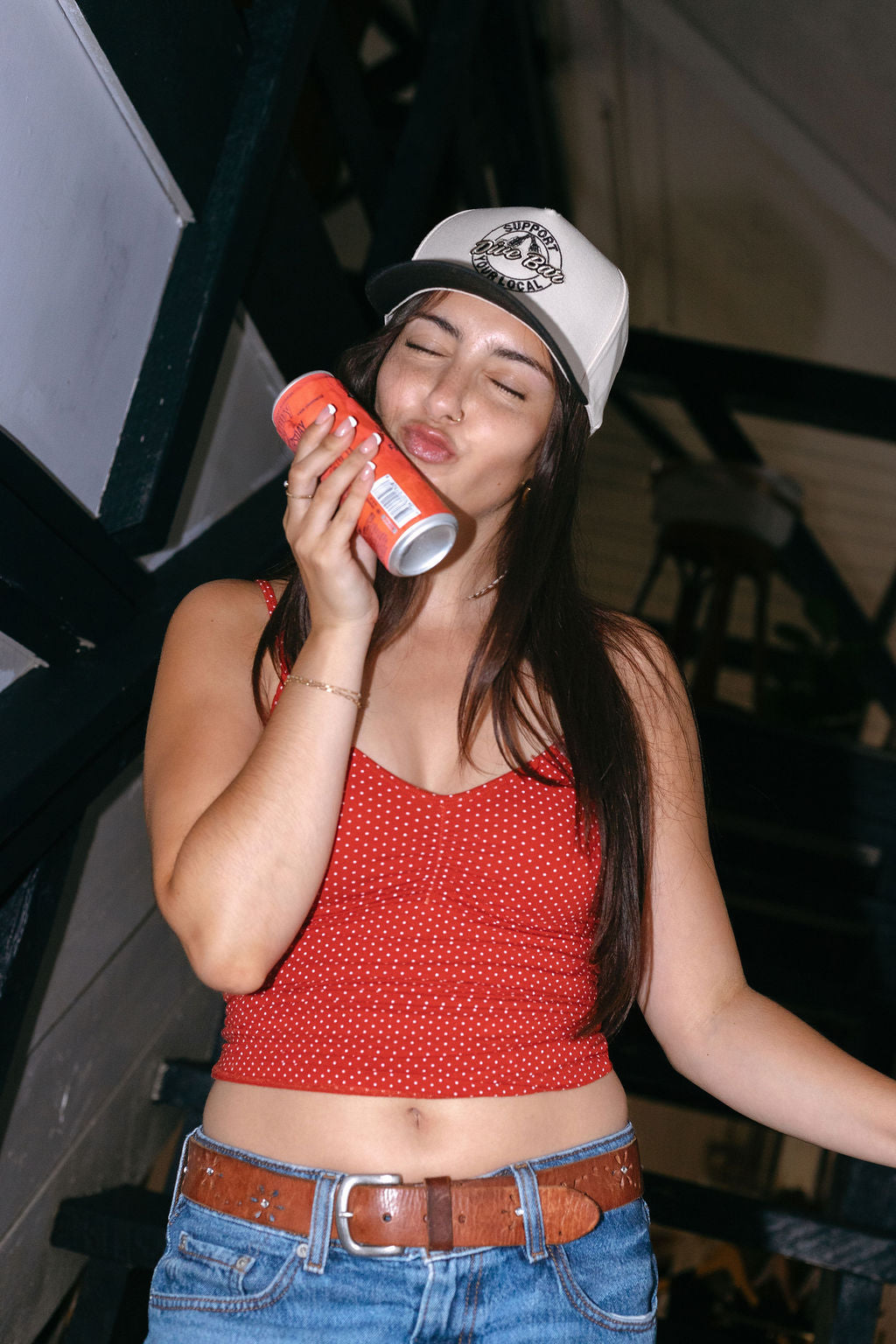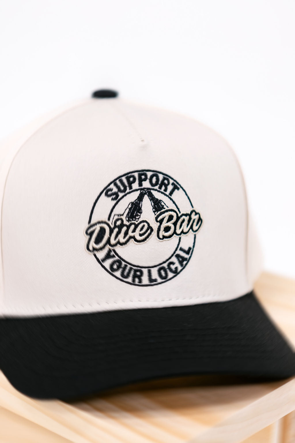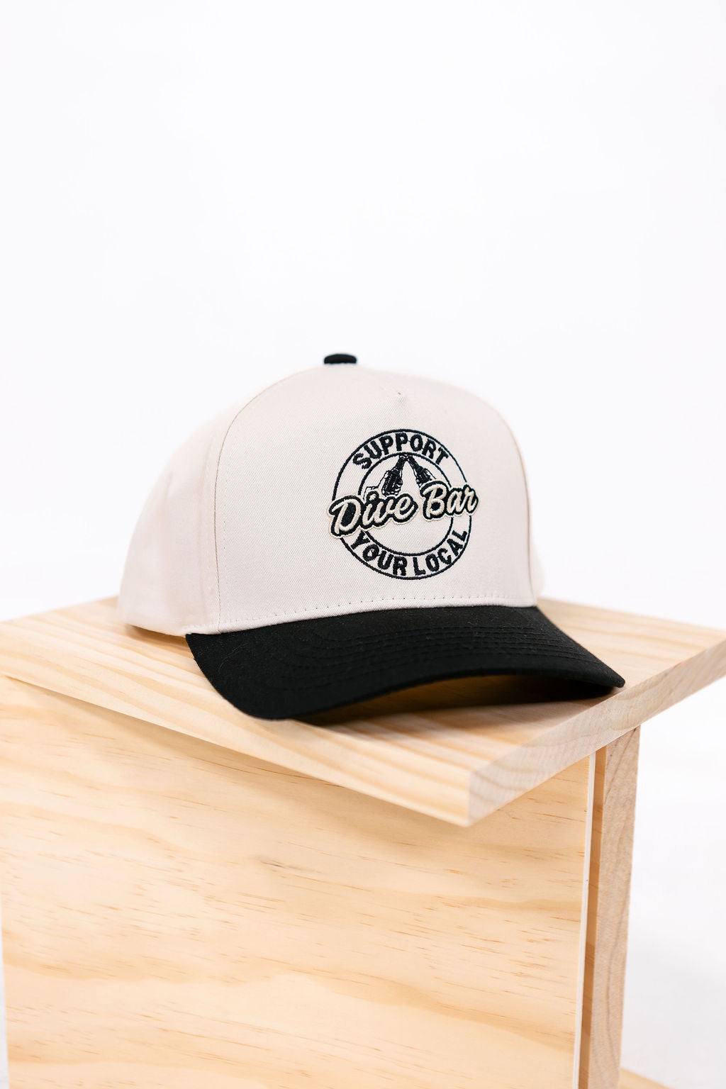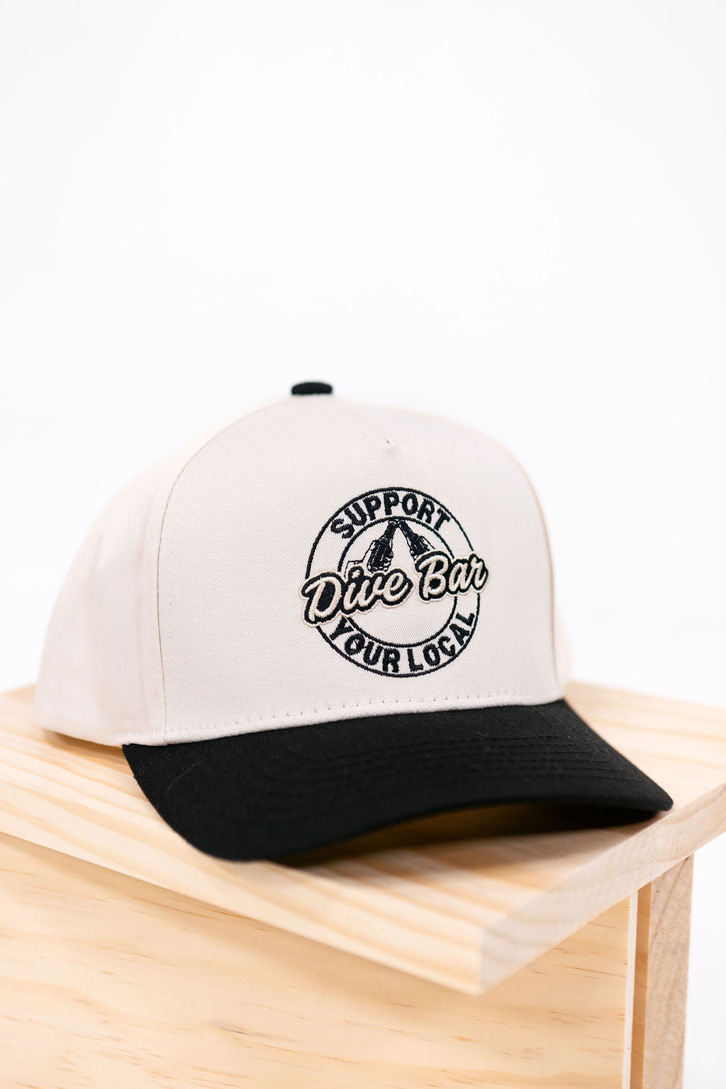 Two-toned black and natural snapback hat. Has “The Happiest” embroidered on the back above the snaps