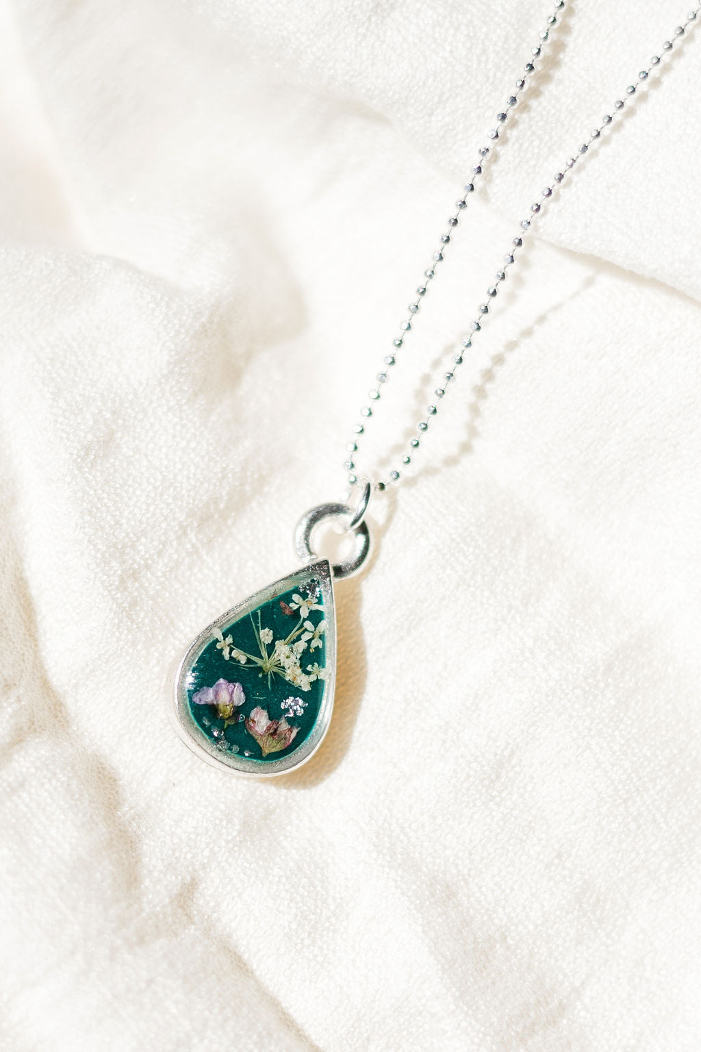 This cute little silver charm is filled with dark green clay, Queen Anne’s lace, spirea, and flowers from the nine bush shrub. All flowers are harvested from gardens in Ohio. Silver gilding flakes adorn the piece, and everything is topped with clear glossy resin. The teardrop bezel is a hollow bezel style meaning you will see the green clay all the way through. Charm hangs on an 18” sterling silver chain. The bezel itself is fine silver plated and tarnish resistant.