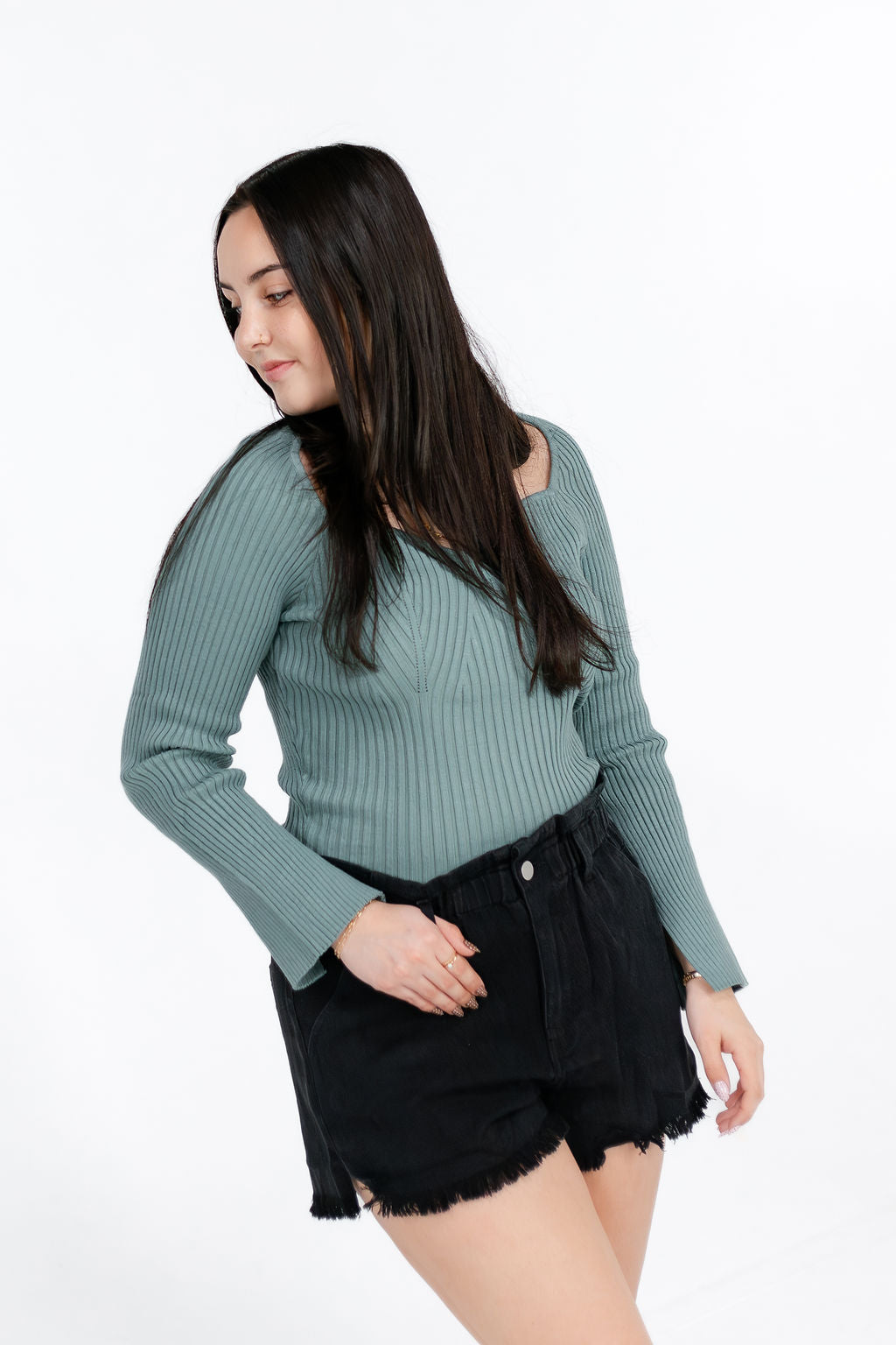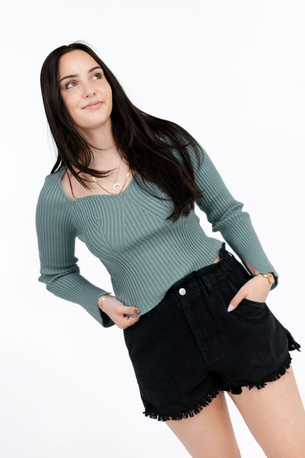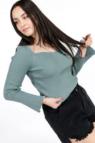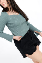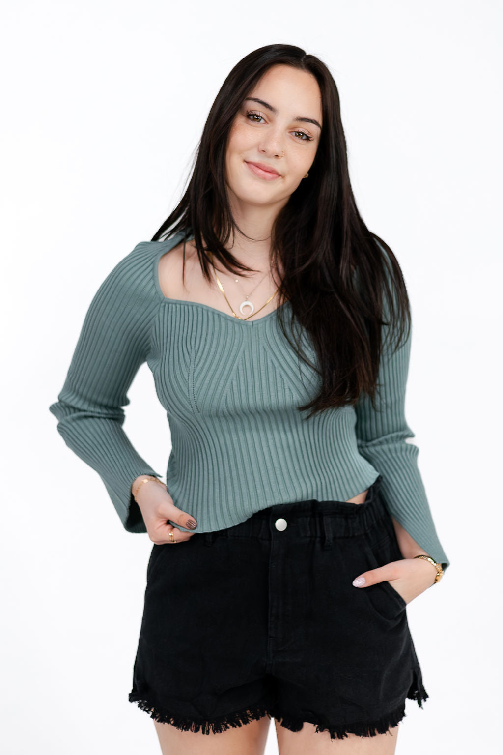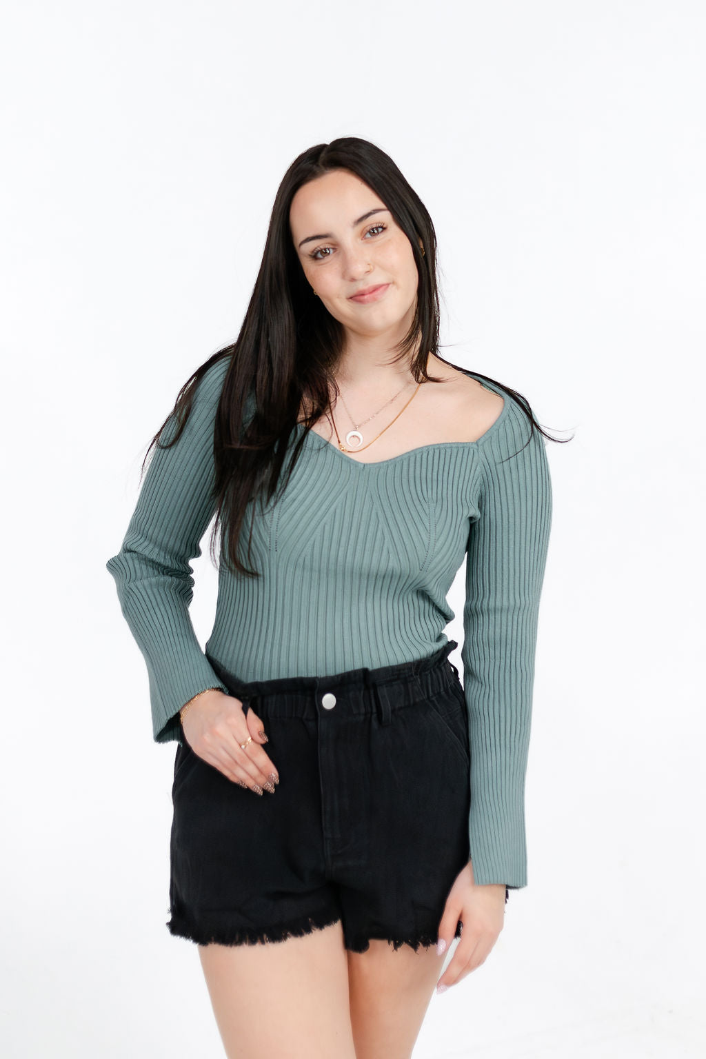 Back again - so cute! This long-sleeved ribbed top features a darling sweetheart neckline, slit cuffs, and a snug fit, making it a perfect addition to your wardrobe.