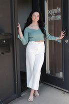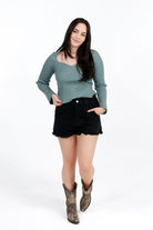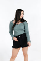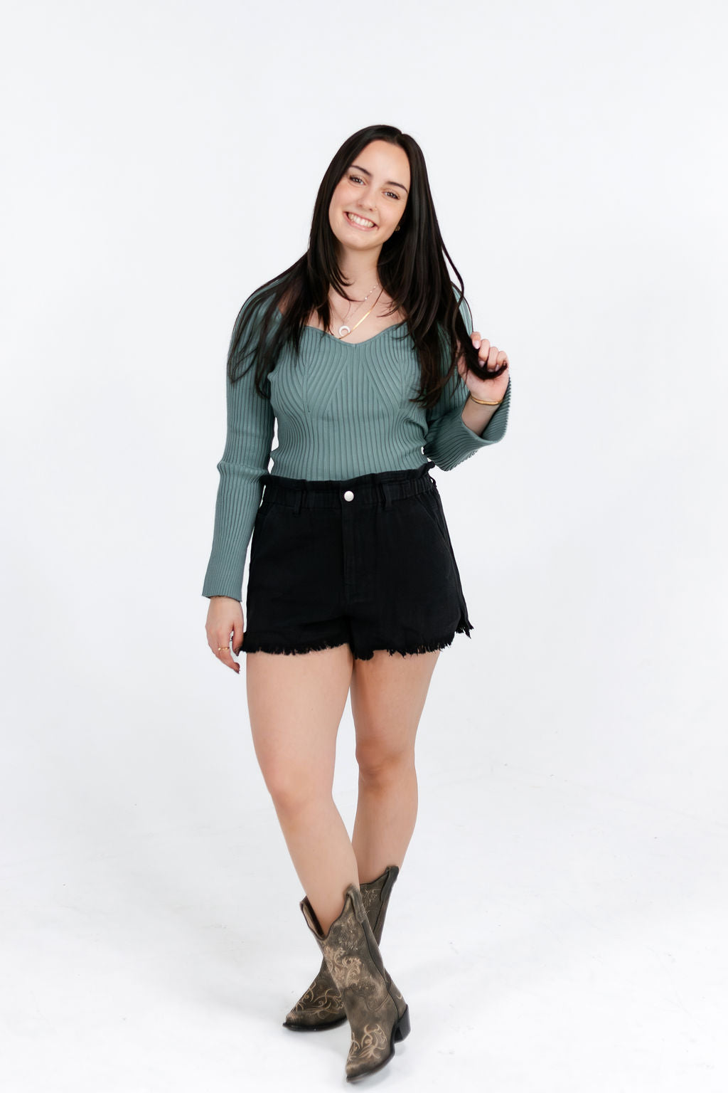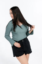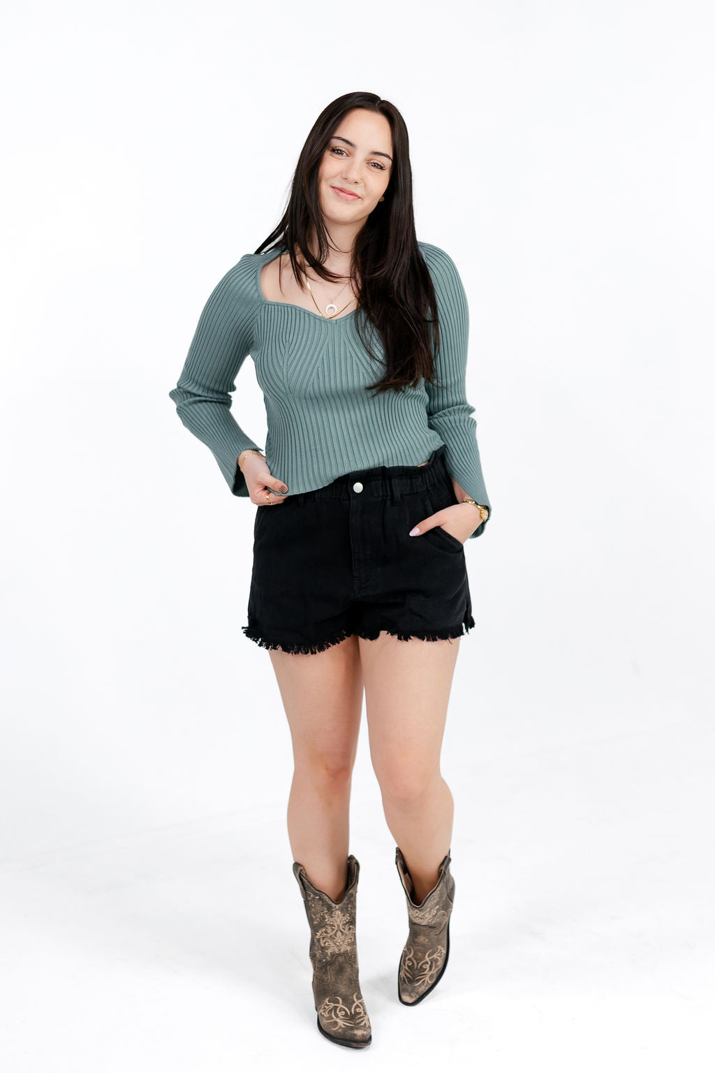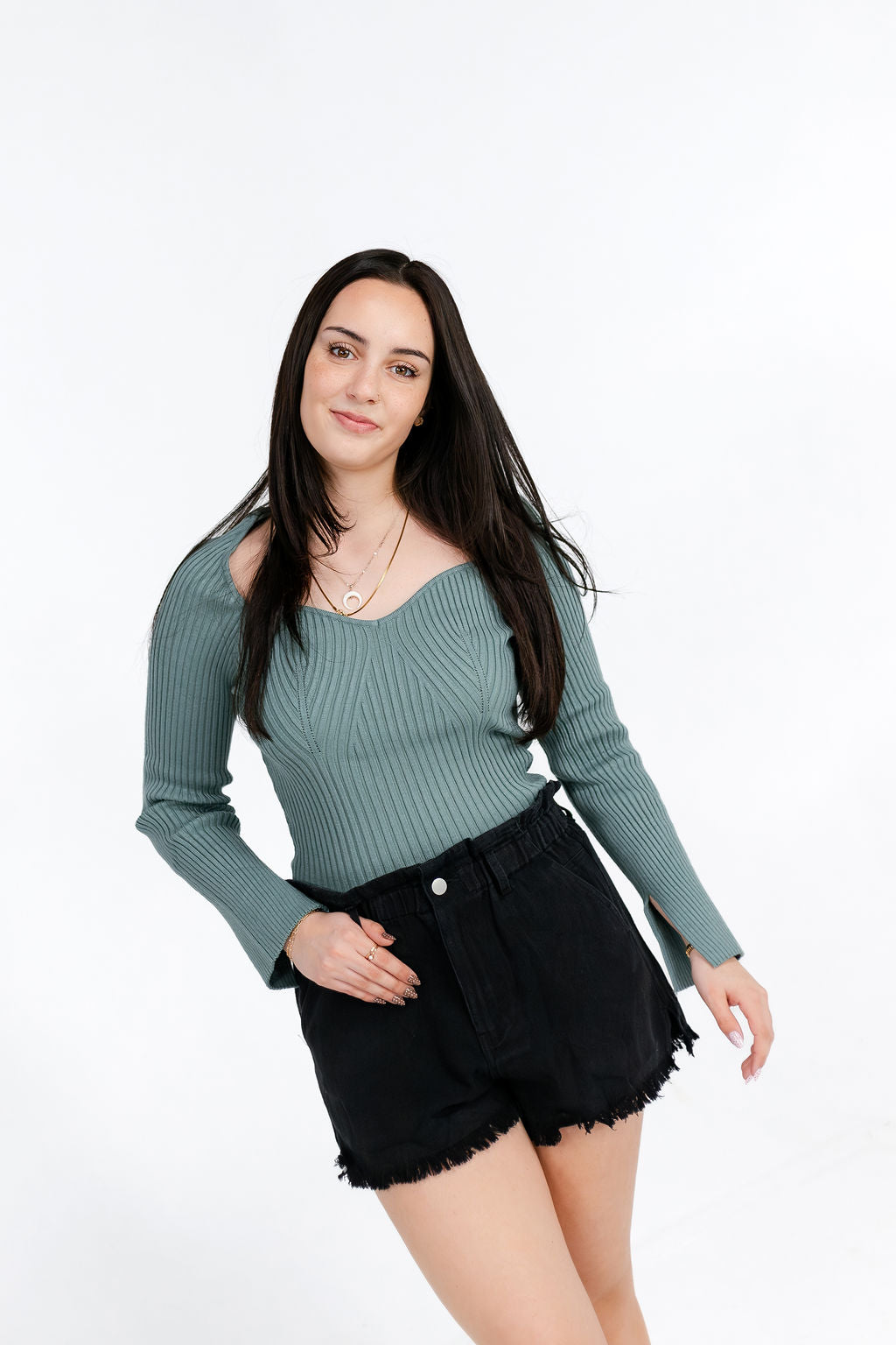 Back again - so cute! This long-sleeved ribbed top features a darling sweetheart neckline, slit cuffs, and a snug fit, making it a perfect addition to your wardrobe.