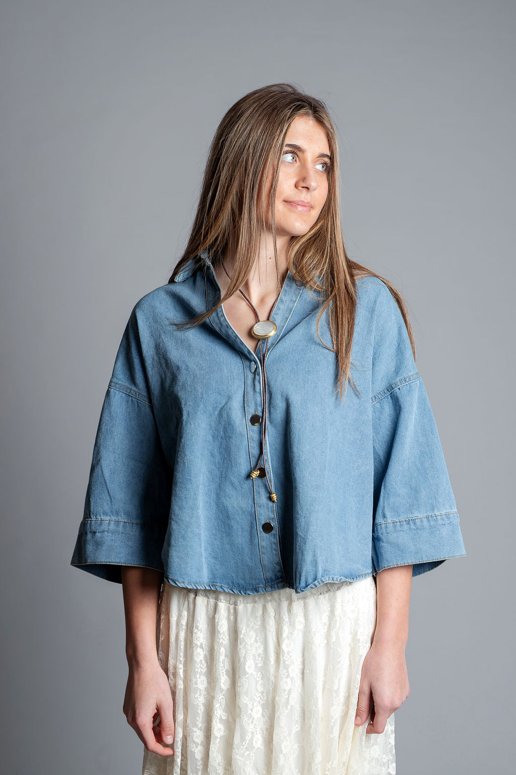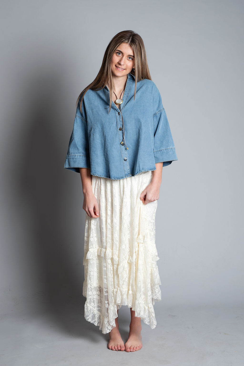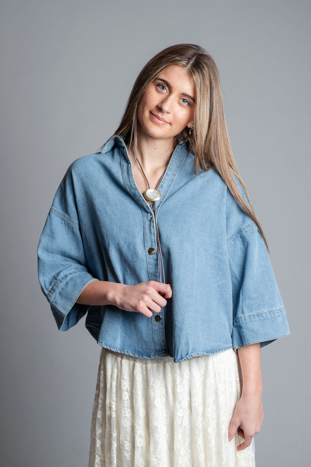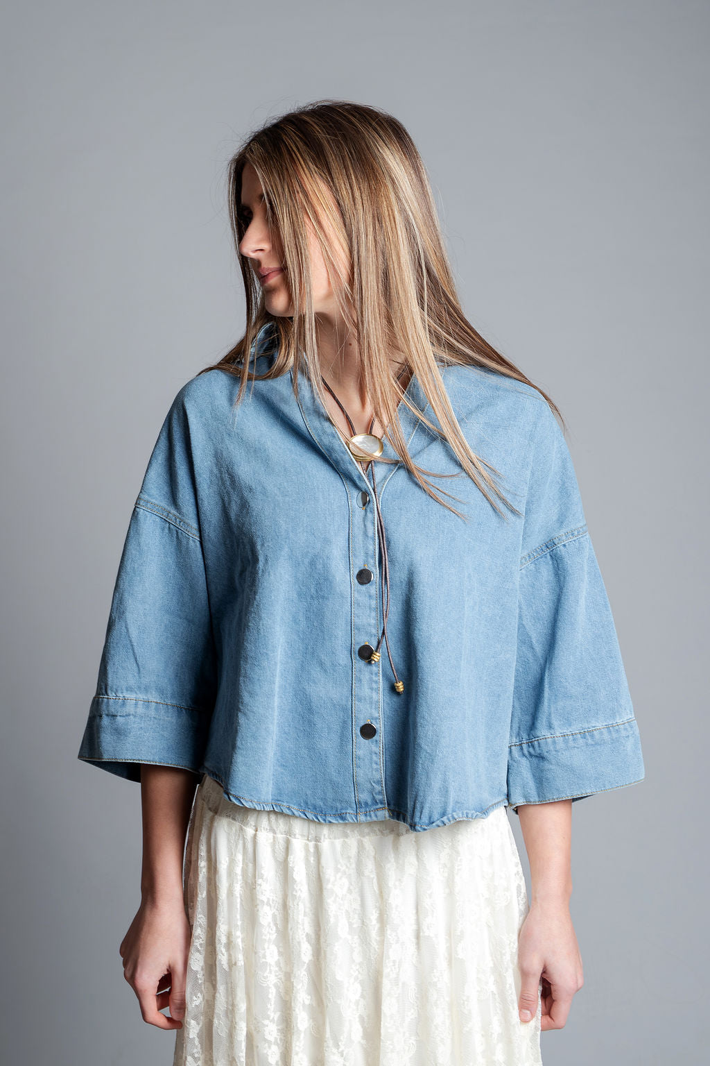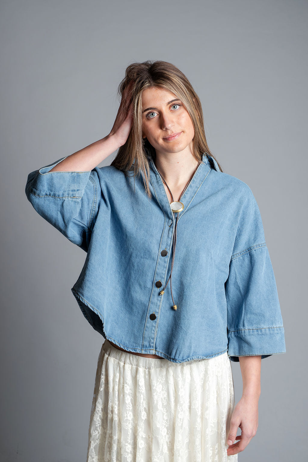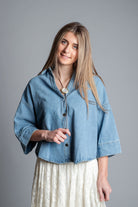 Willa Oversized Denim Collared Top Crafted from classic denim, this oversized collared shirt features a relaxed fit and wide sleeve openings for effortless style. The generous silhouette works beautifully layered or worn solo, while the structured collar adds polish to any casual look.