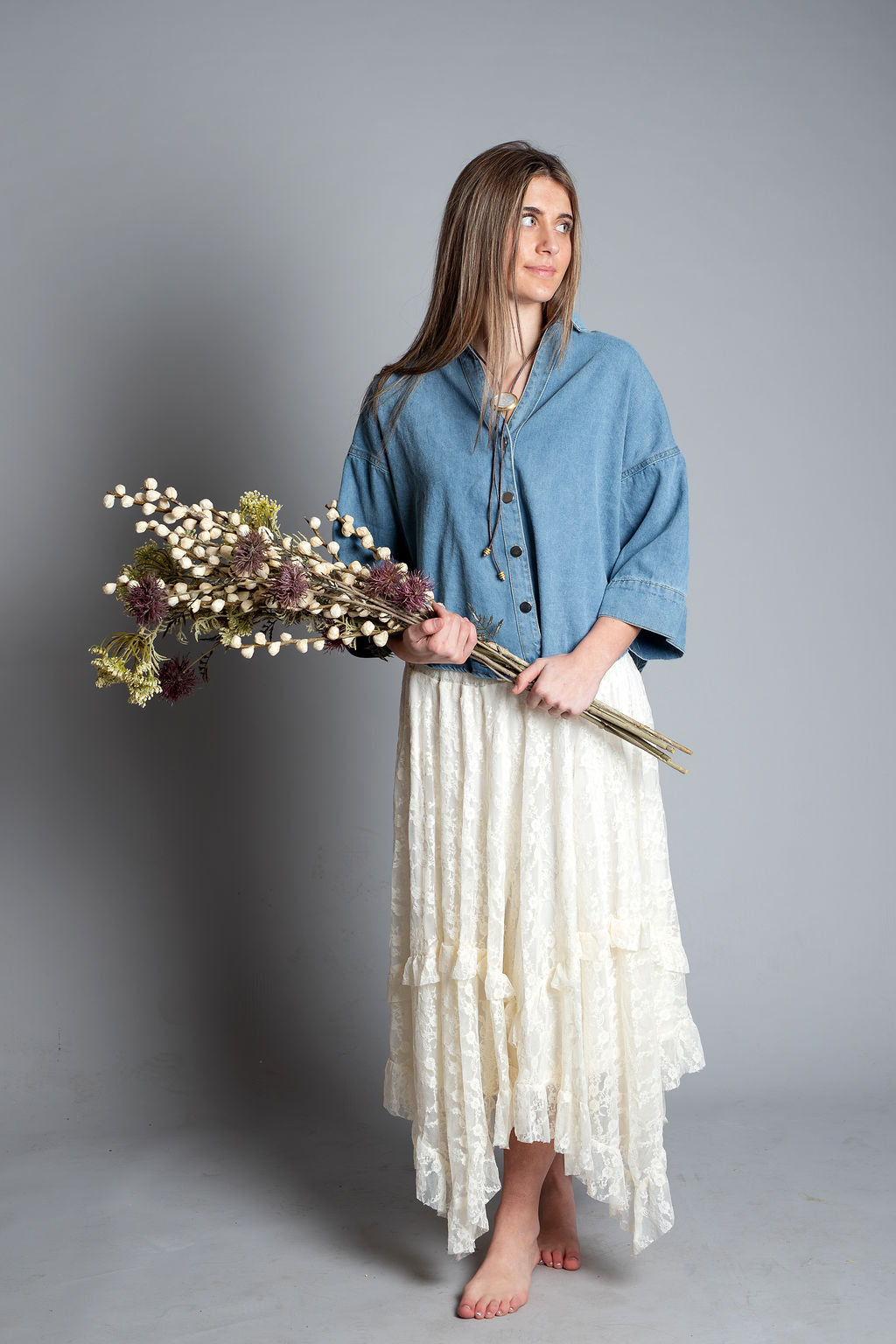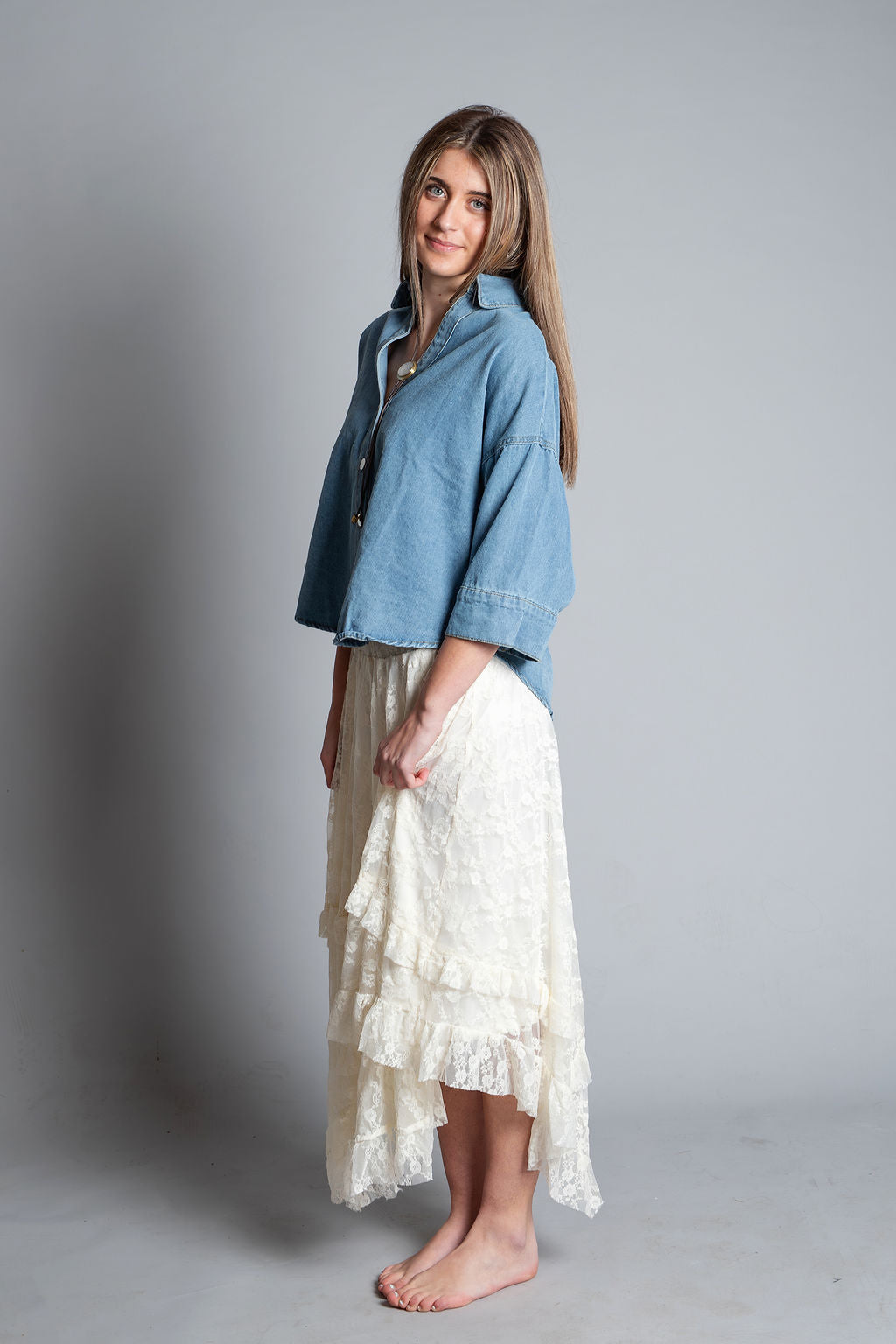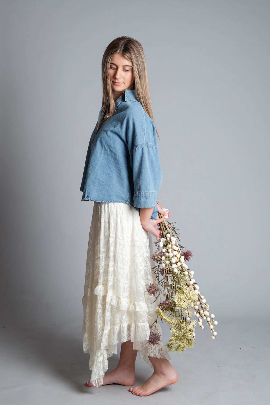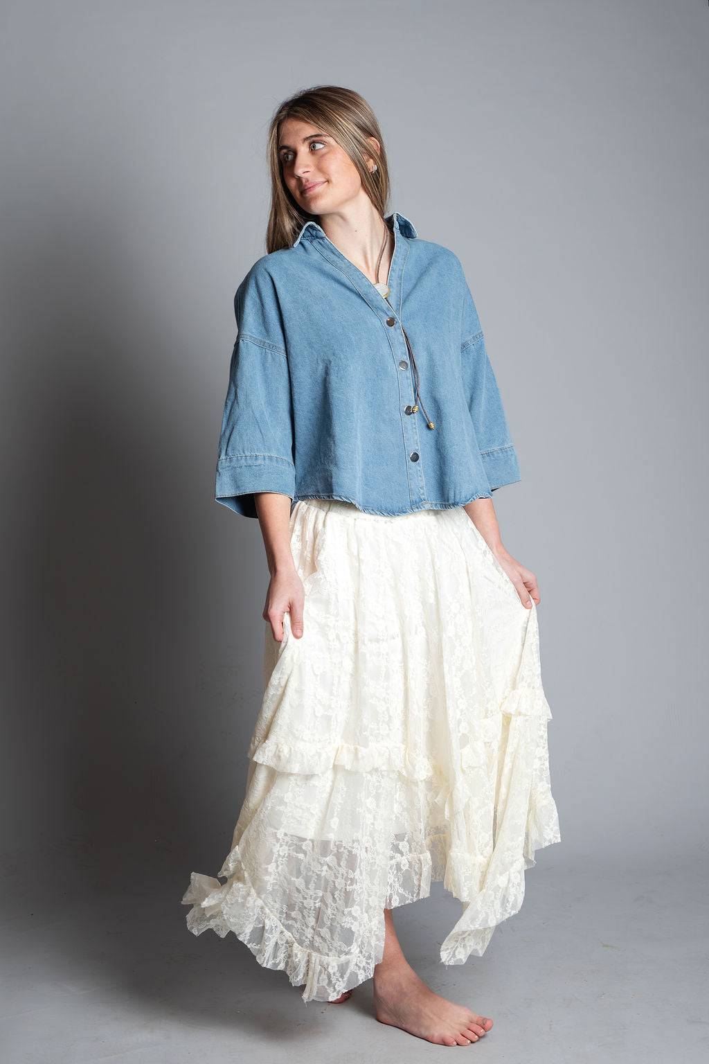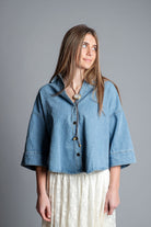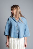 Willa Oversized Denim Collared Top Crafted from classic denim, this oversized collared shirt features a relaxed fit and wide sleeve openings for effortless style. The generous silhouette works beautifully layered or worn solo, while the structured collar adds polish to any casual look.