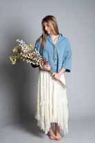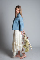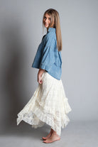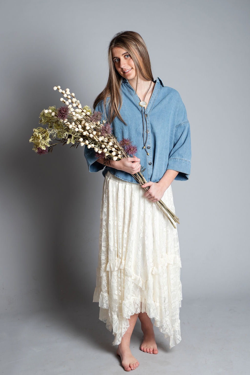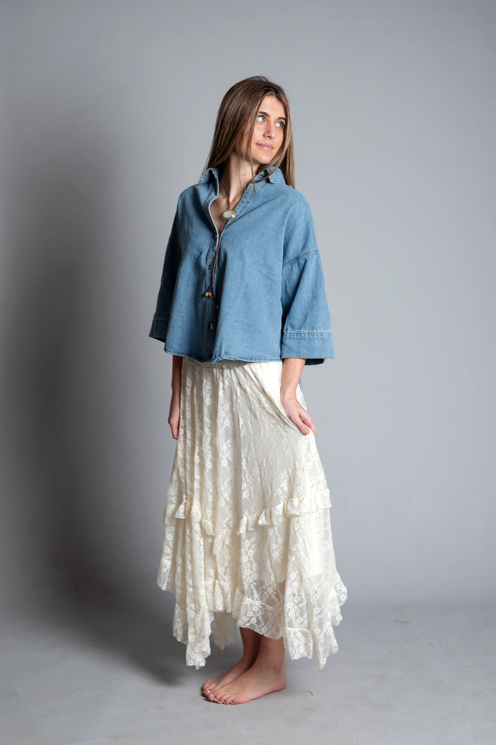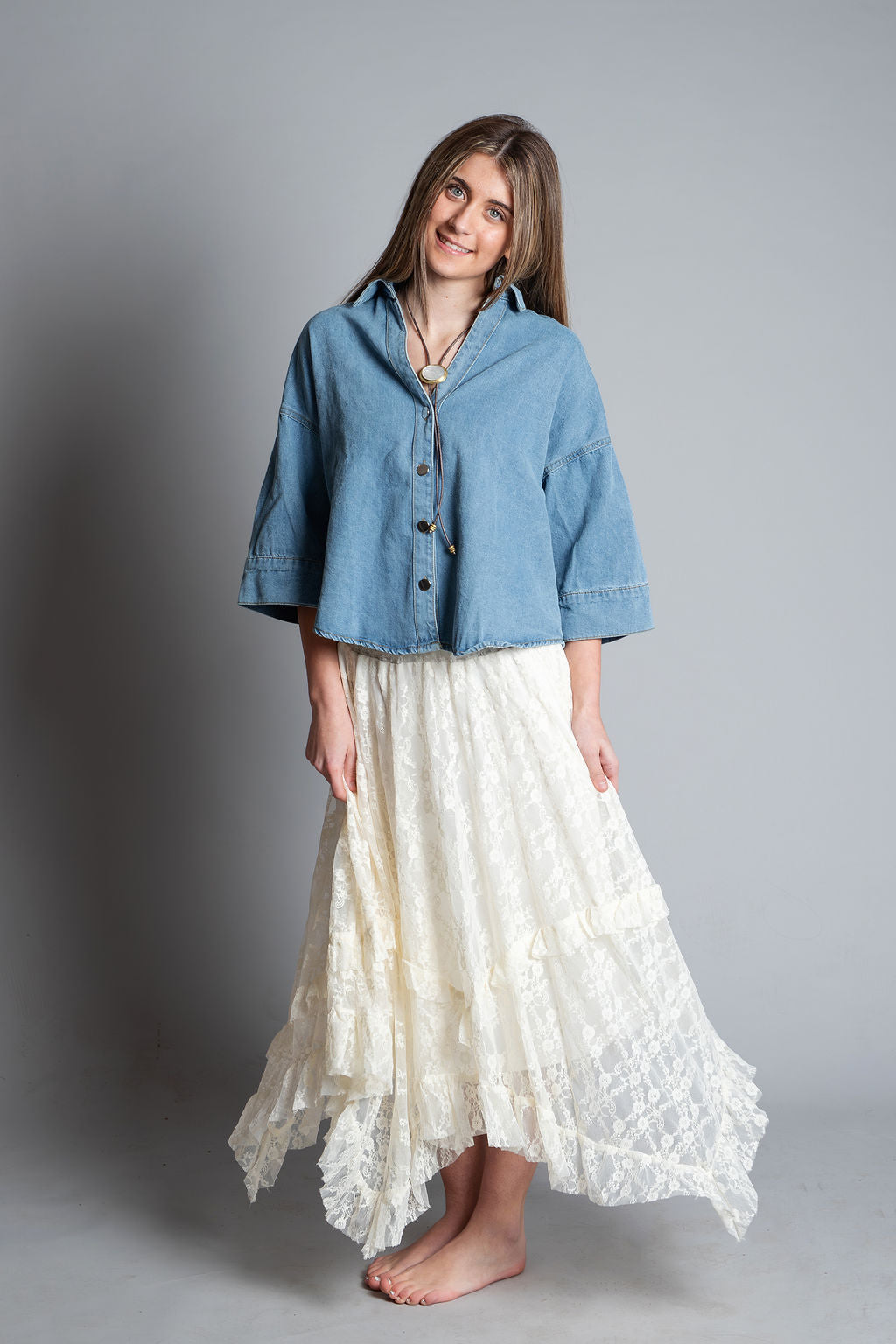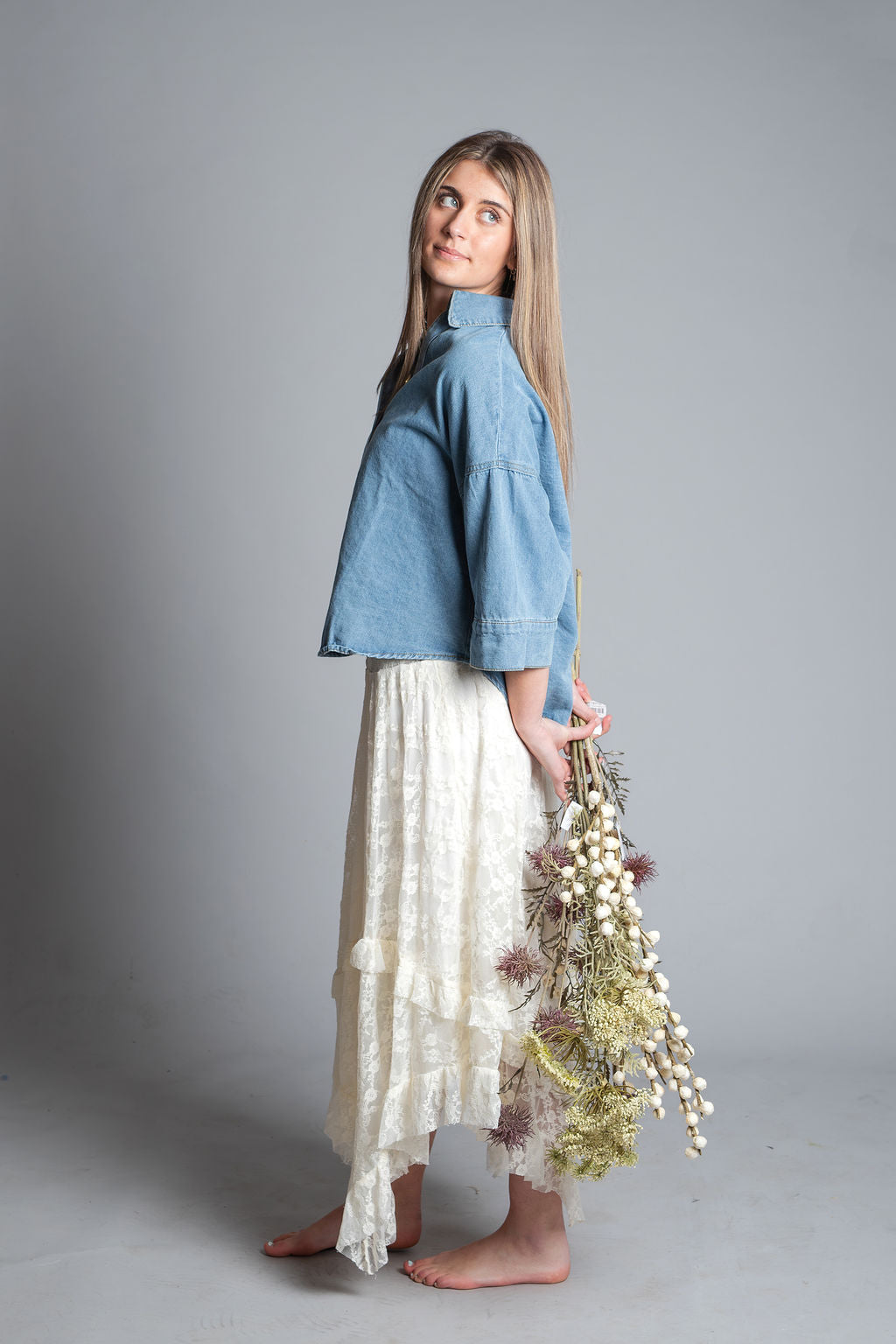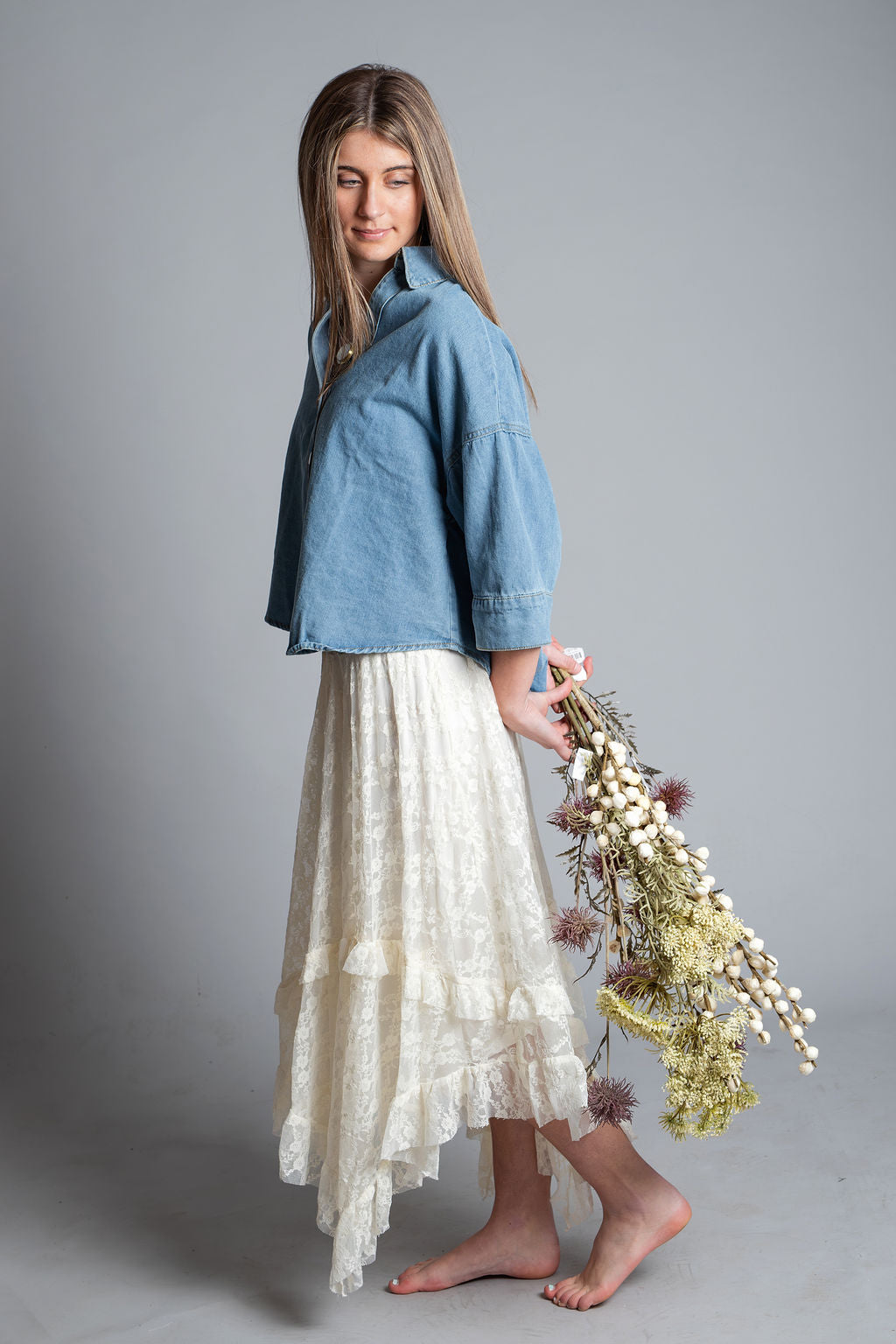 Willa Oversized Denim Collared Top Crafted from classic denim, this oversized collared shirt features a relaxed fit and wide sleeve openings for effortless style. The generous silhouette works beautifully layered or worn solo, while the structured collar adds polish to any casual look.